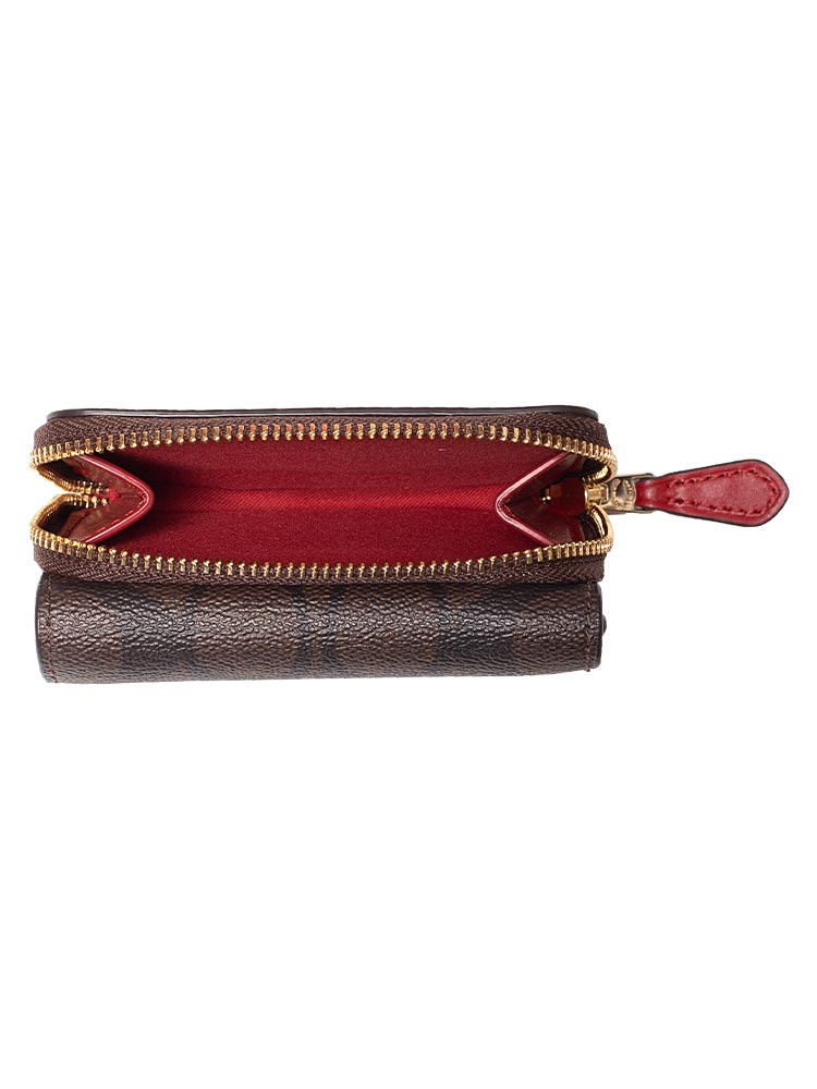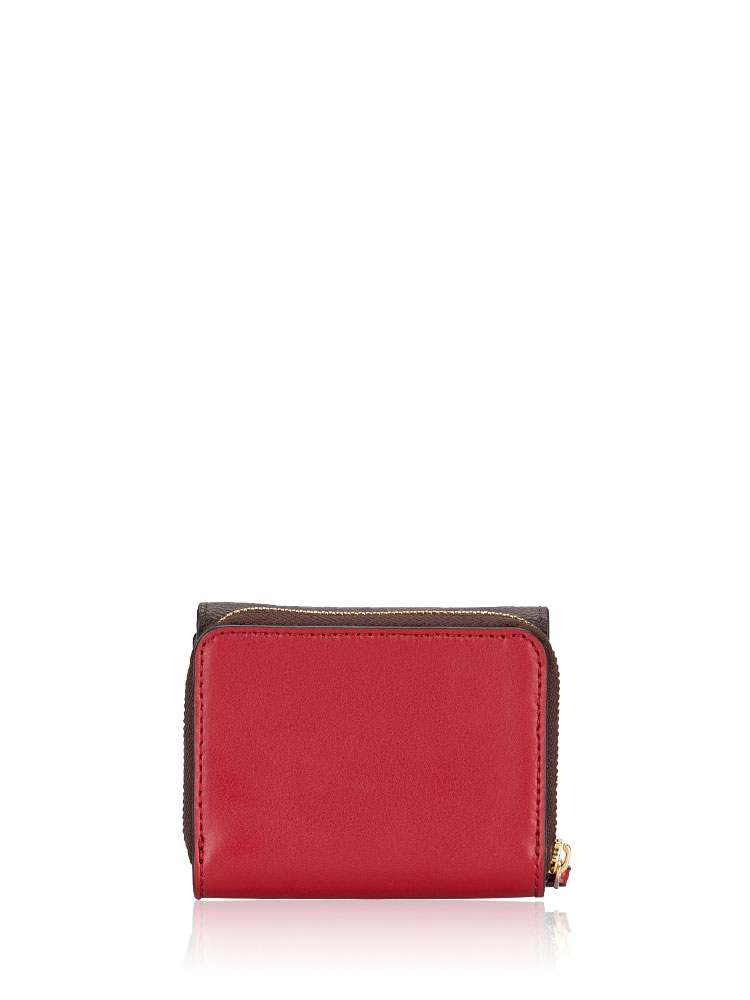 Crafted of coated canvas with crossgrain leather. It equipped with snap button closure, 2 card slots, ID window, bill compartment, and zip coin pocket.