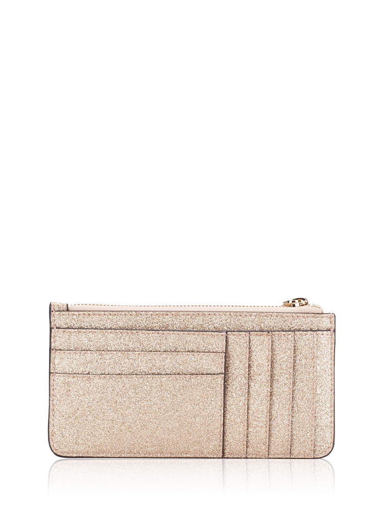 Made of glitter fabric. The wallet features a zip closure that opens to fabric lining with gold tone hardware, 7 card slots, and 2 slip pockets.