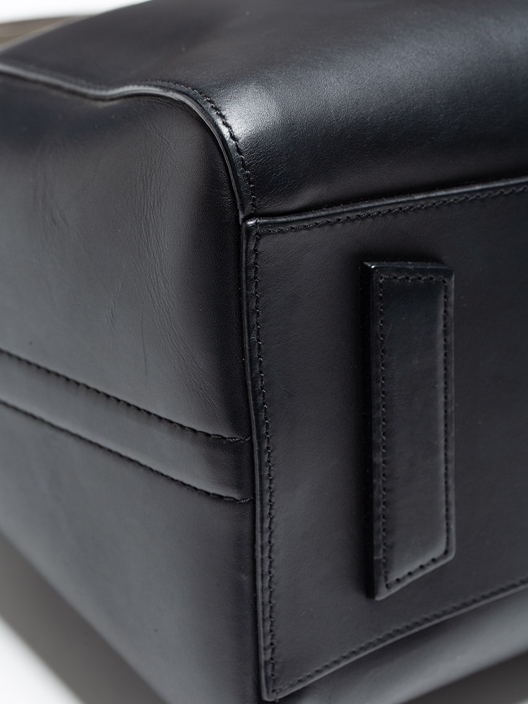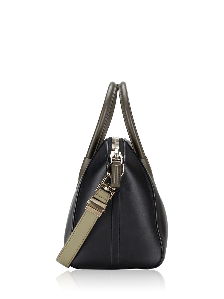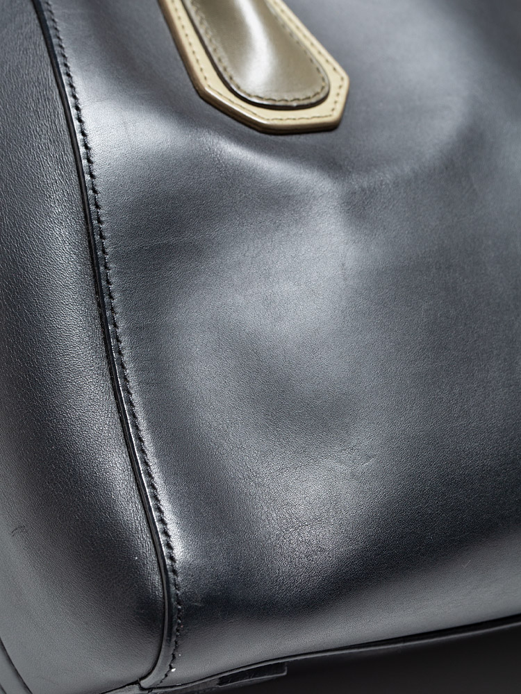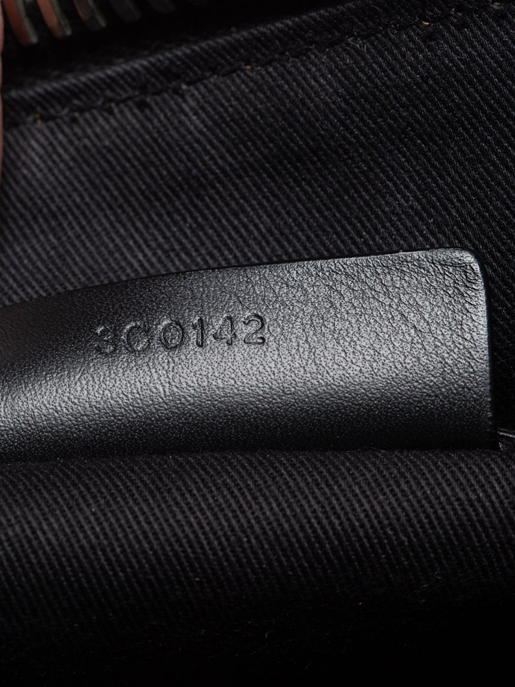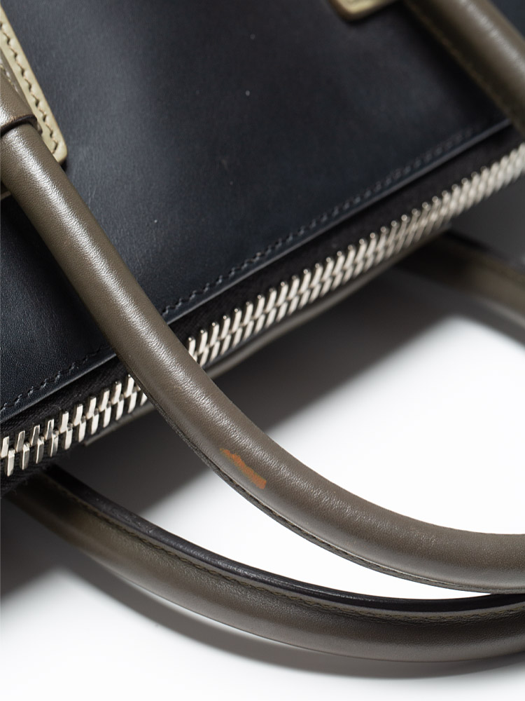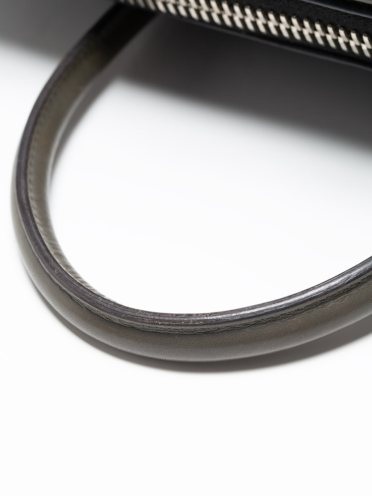 This bag is crafted of calfskin material. The bag features leather double top handles and shoulder strap. The top zipper opens to fabric lining with slip and zipper pockets.
