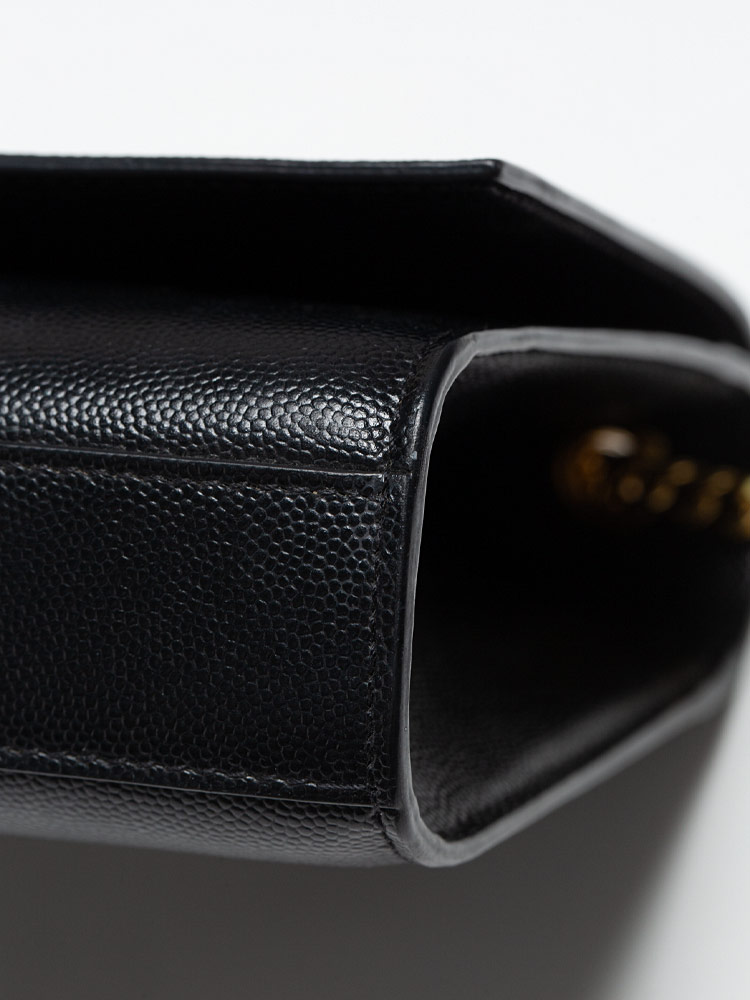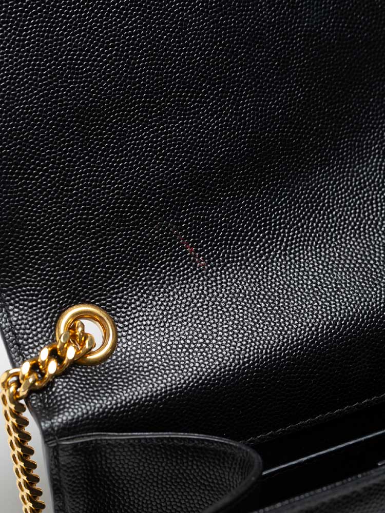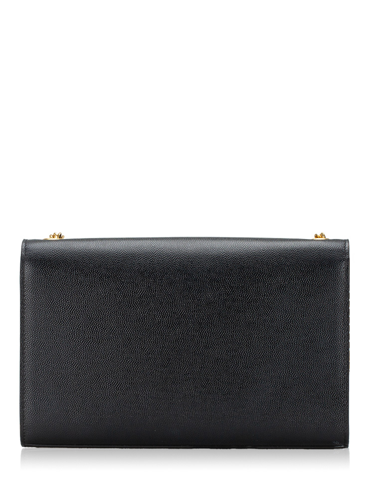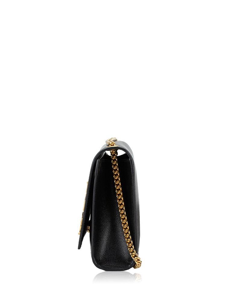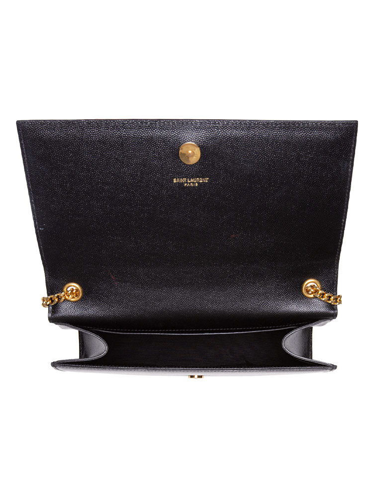 Crafted of grained calfskin leather. The bag features a gold chain link shoulder strap and a full facing flap with the classic polished gold YSL logo. The flap opens to a fabric interior with a flat pocket.