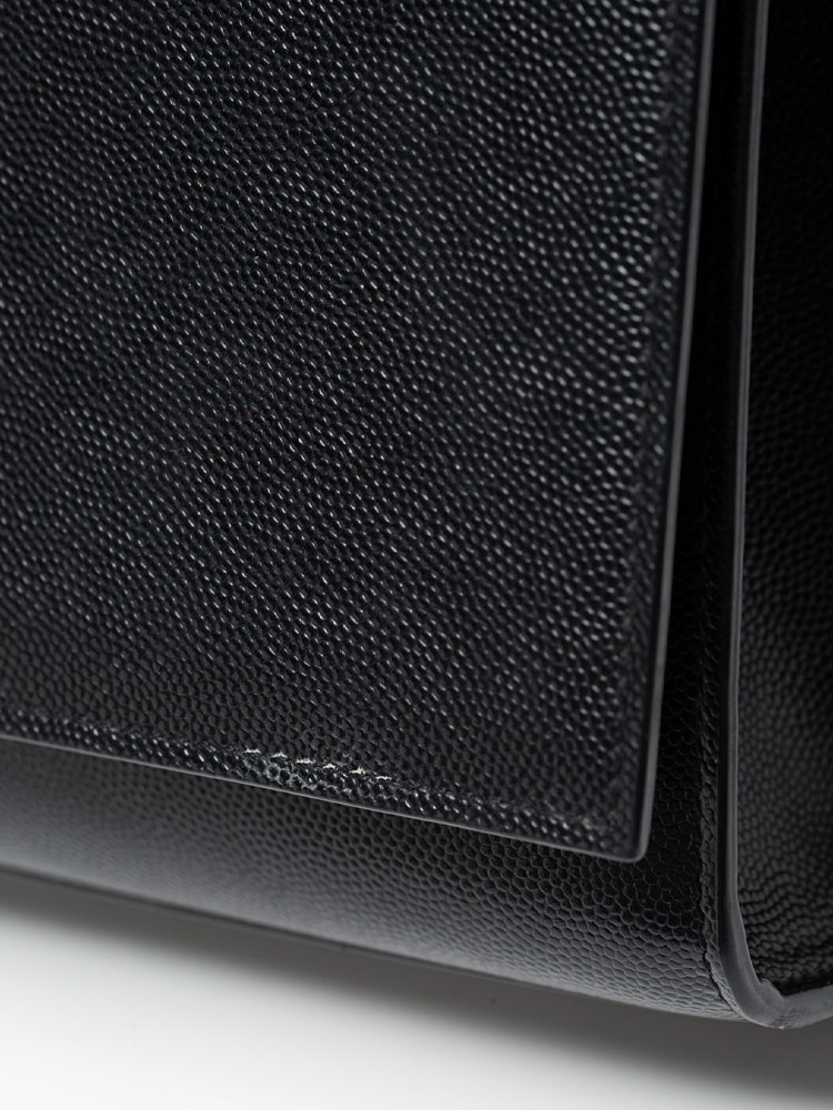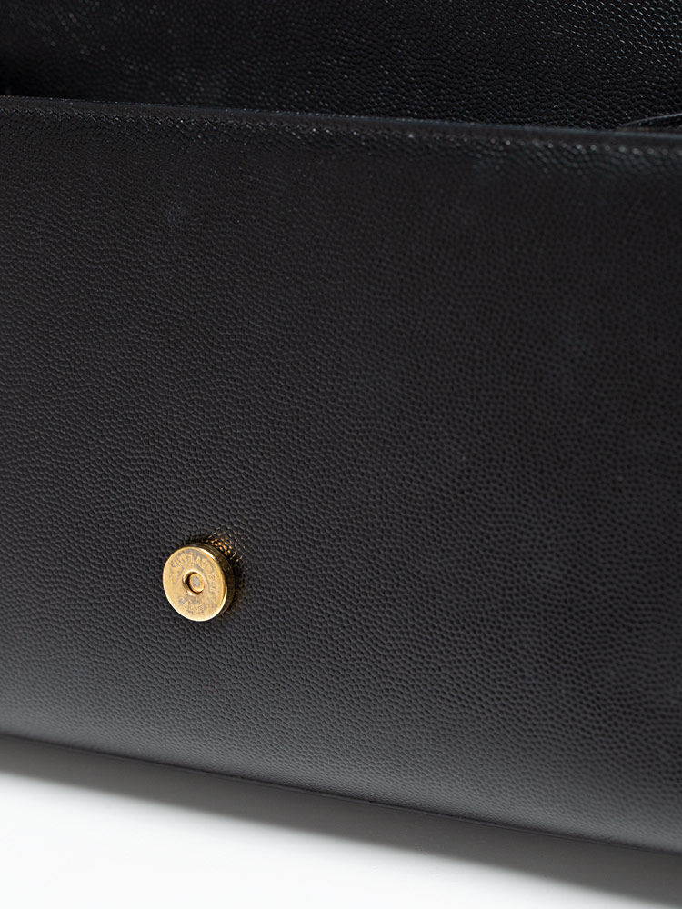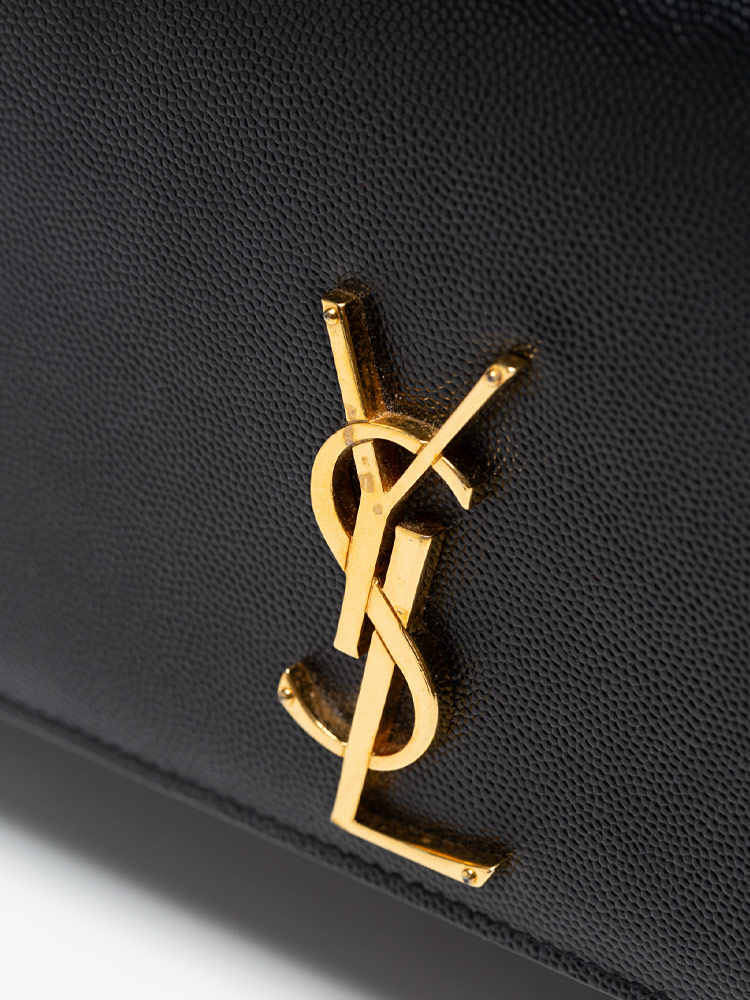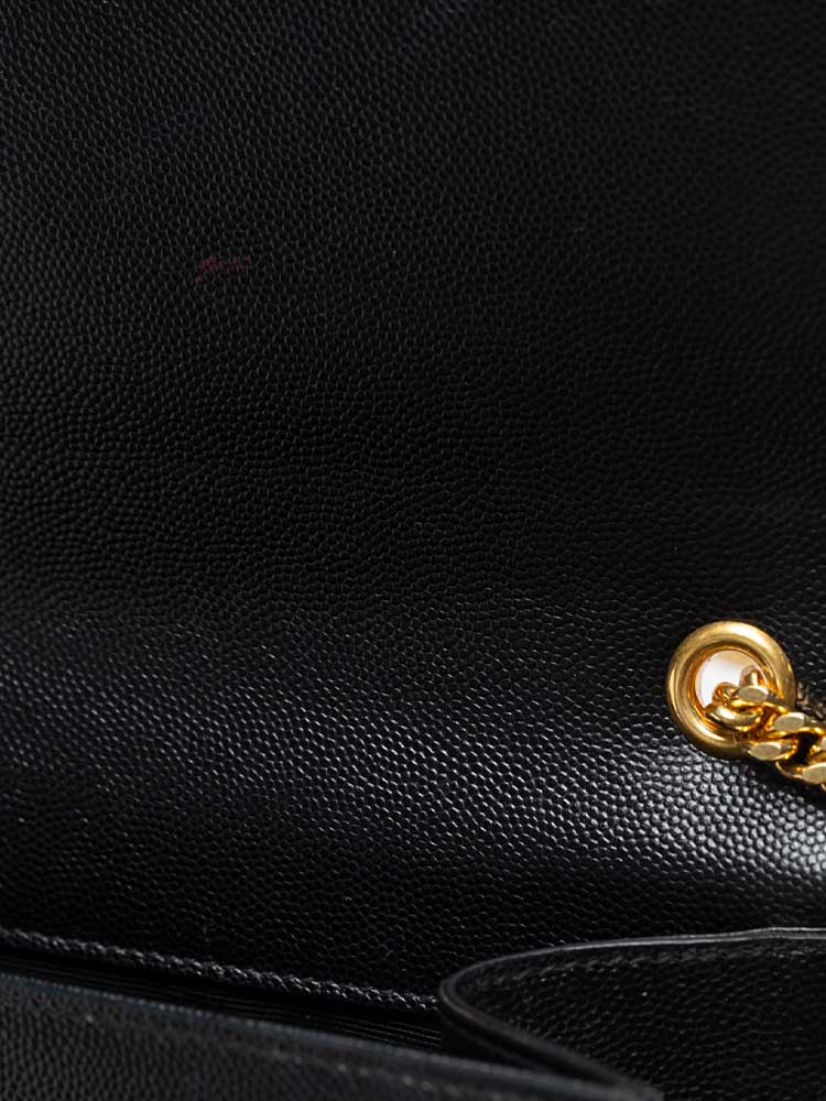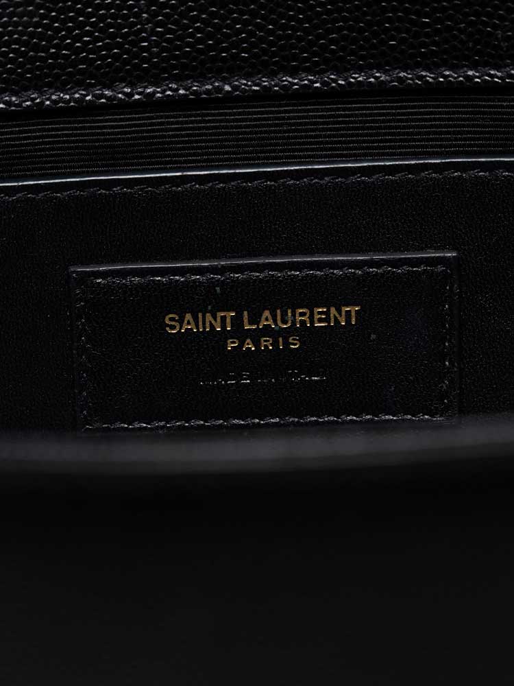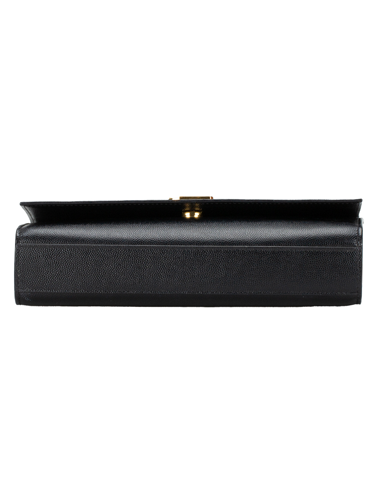 Crafted of grained calfskin leather. The bag features a gold chain link shoulder strap and a full facing flap with the classic polished gold YSL logo. The flap opens to a fabric interior with a flat pocket.