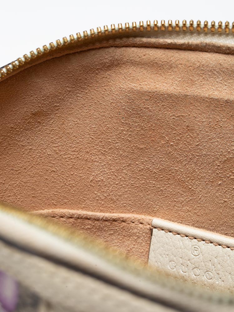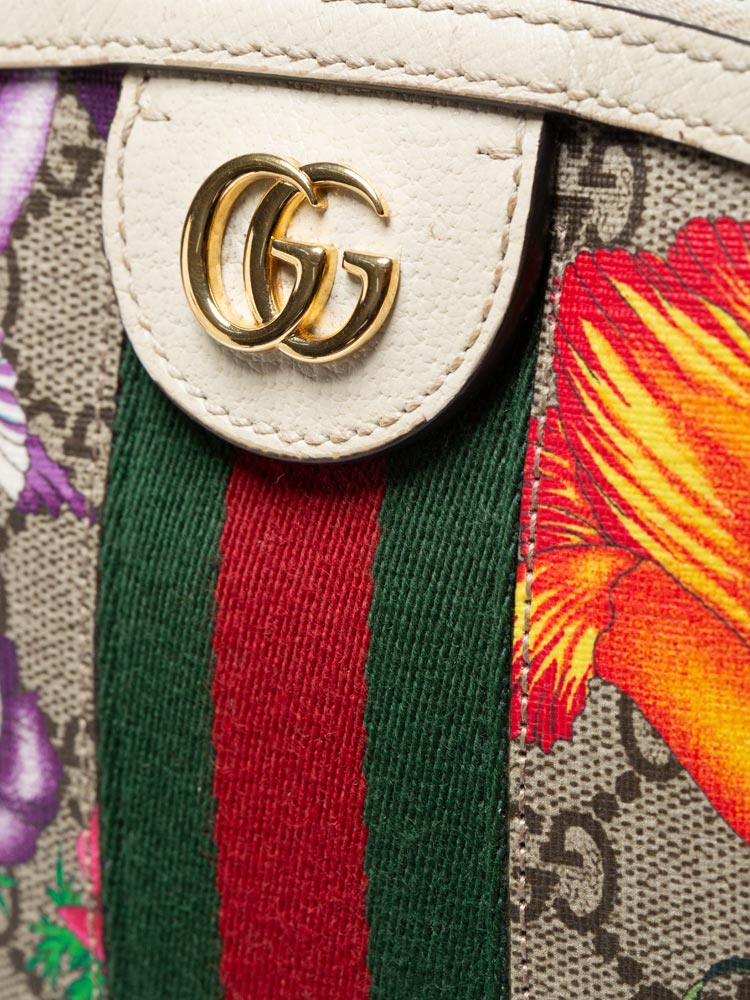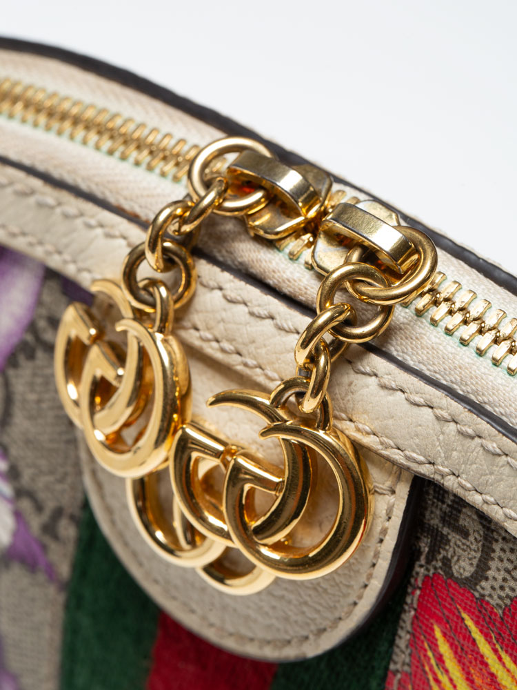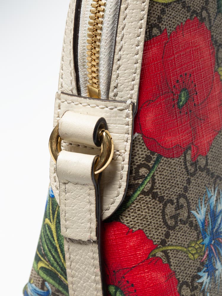 Crafted of Gucci GG monogram-coated canvas, with a vibrantly colored floral overlay. The bag features leather trim, an adjustable leather shoulder strap with gold hardware, and gold GG logo zipper pulls.
