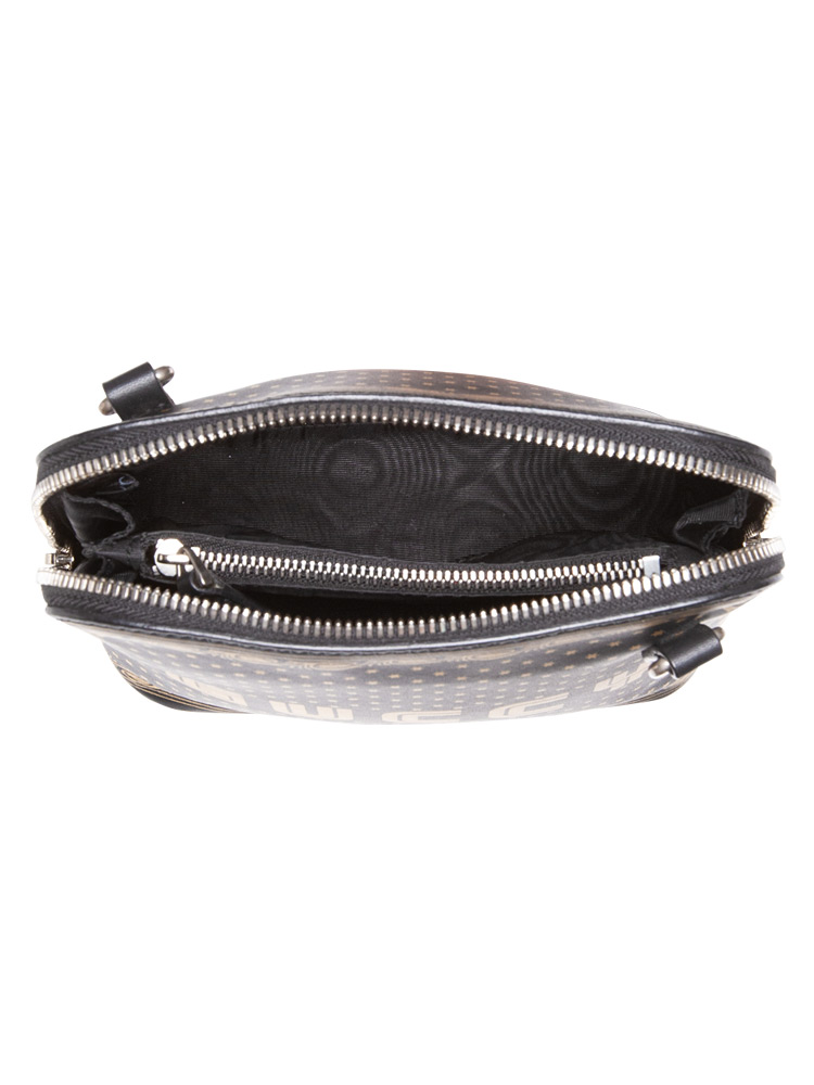 This bag is crafted of calfskin leather with gold detailing "GUCCY" print. The bag features a leather shoulder strap with aged silver hardware links and unzips to a partitioned fabric interior with a central zipper compartment.