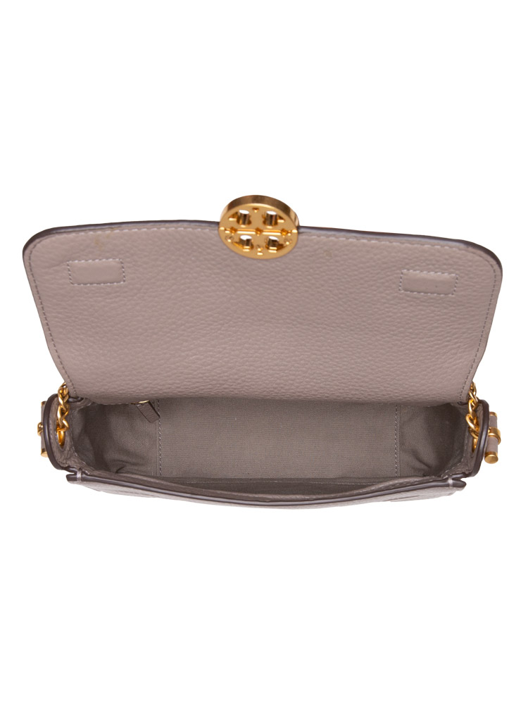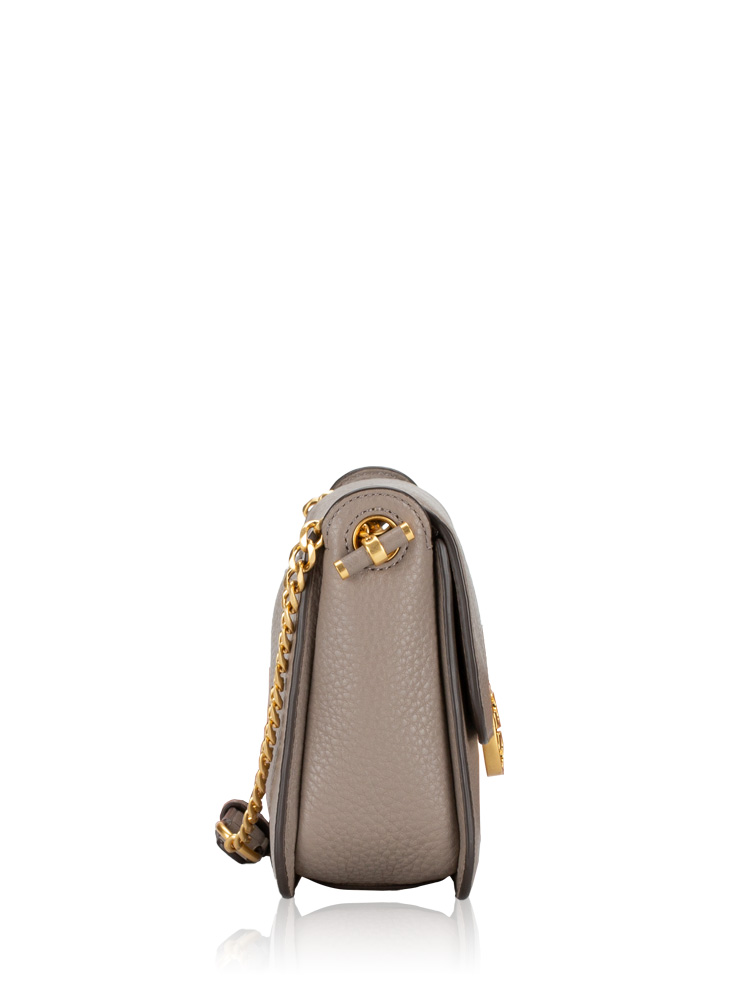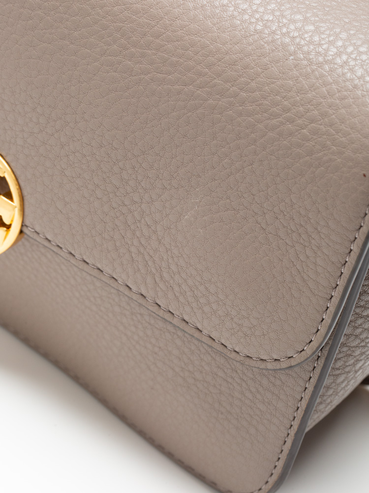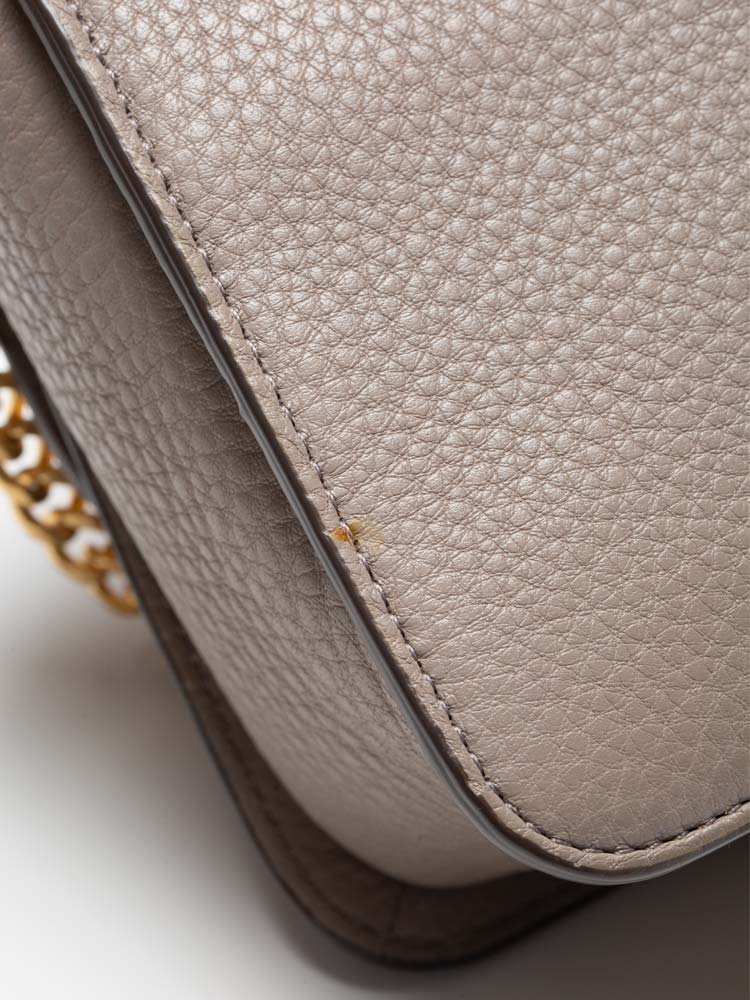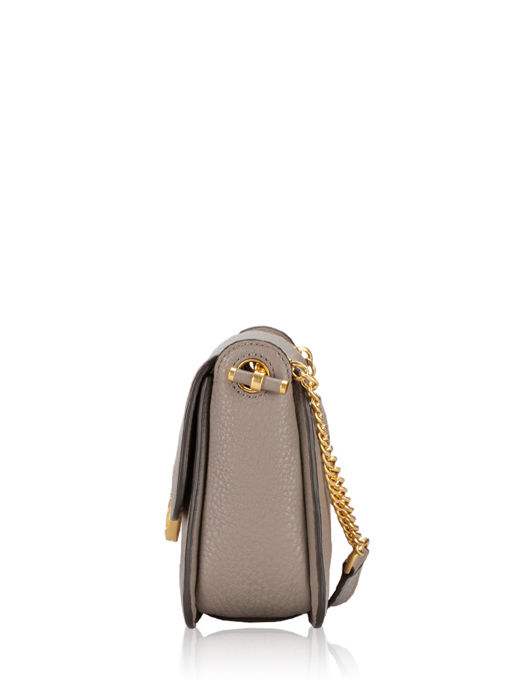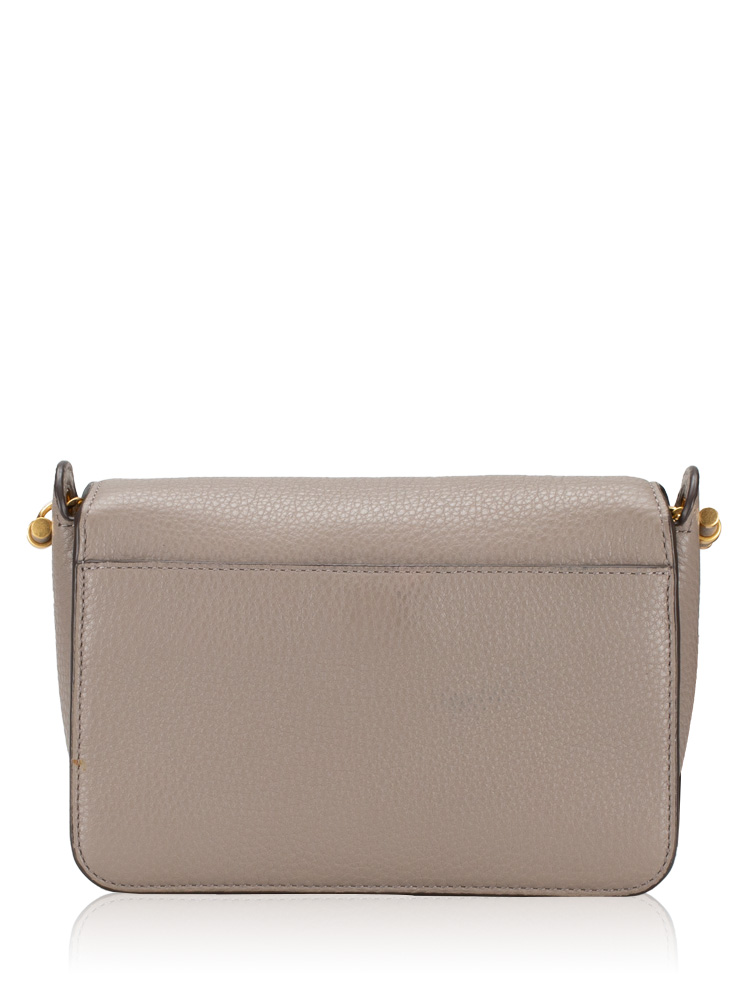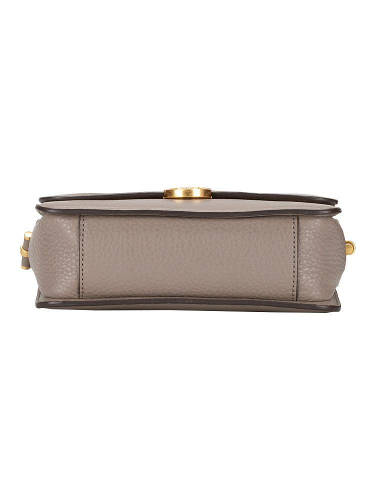 Made of pebbled leather. The bag features a flap magnetic closure that opens to fabric lining with one slip pocket, one zip pocket, exterior one slip pocket at back.
