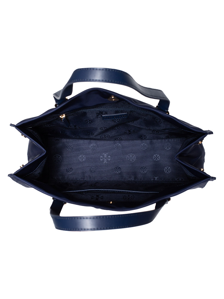 Made of nylon and leather trim. The bag features a magnetic closure that opens to fabric lining with one zip pocket, one slip pocket, double handles drop 24 cm.