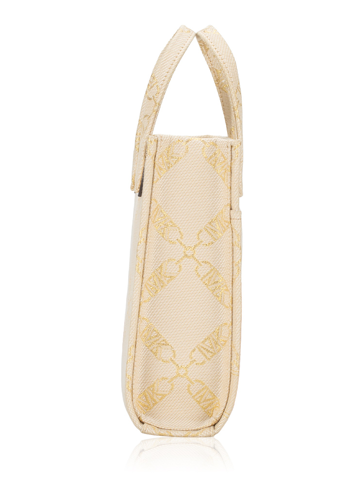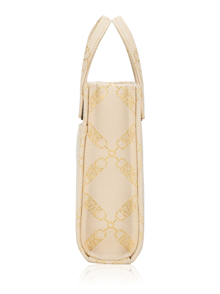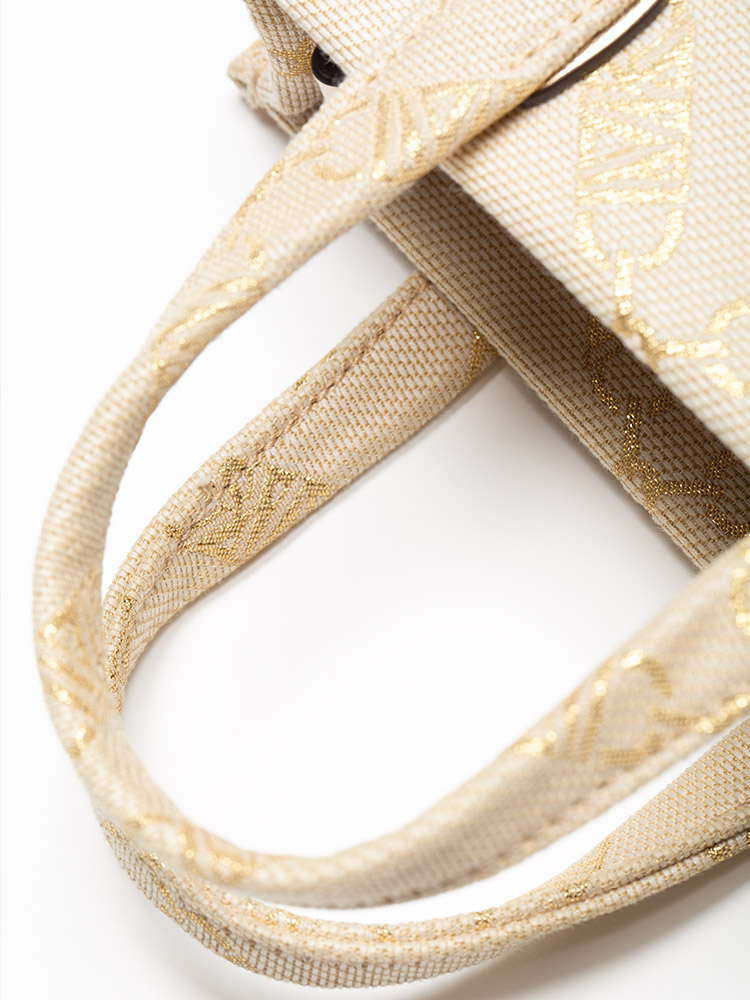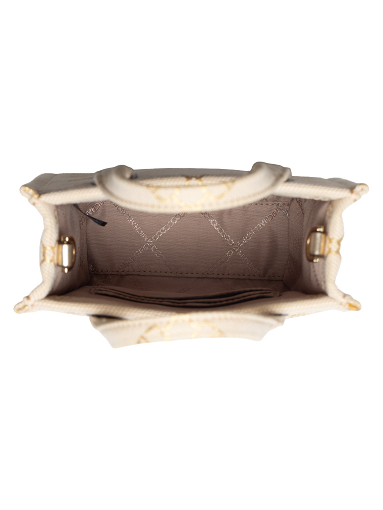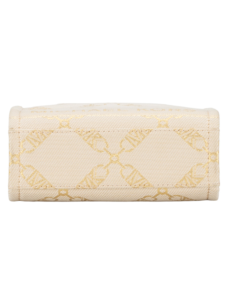 Made of jacquard. The bag features a snap closure that opens to polyester lining with three card slots, double handle drop 9 cm, adjustable and removable long strap.