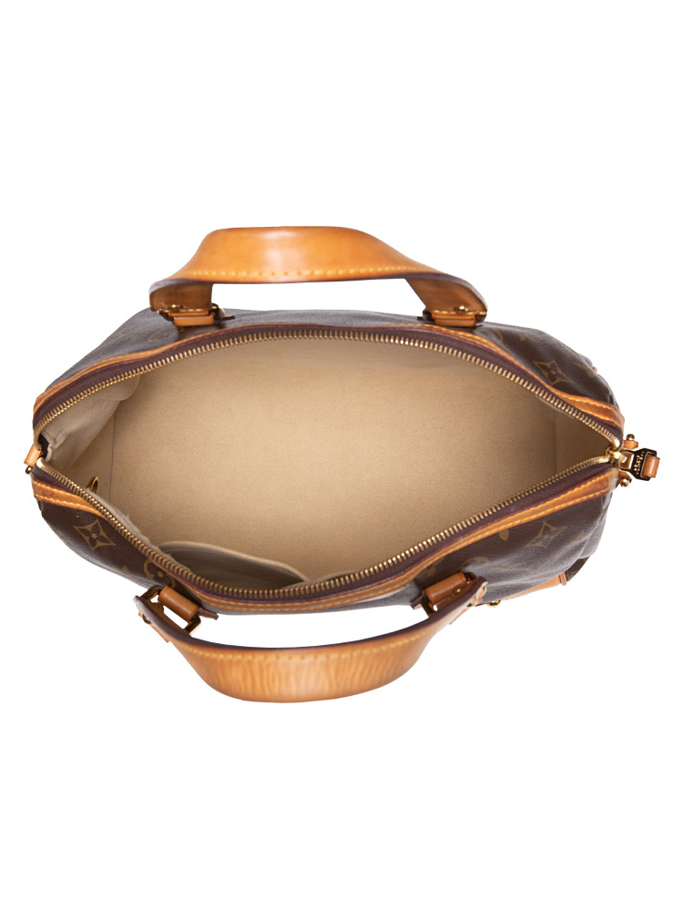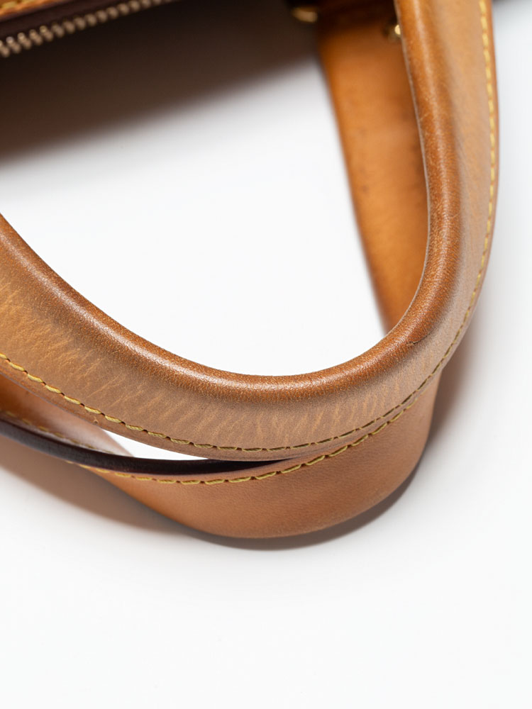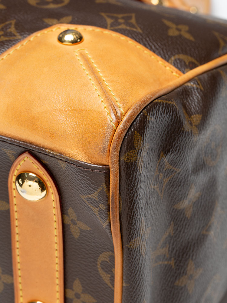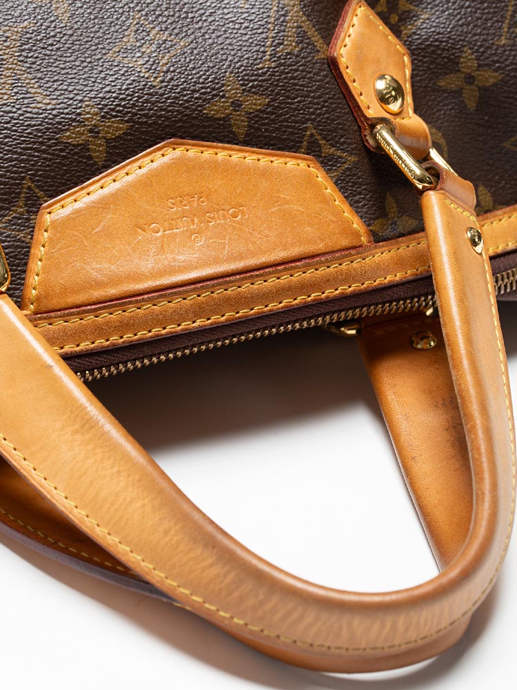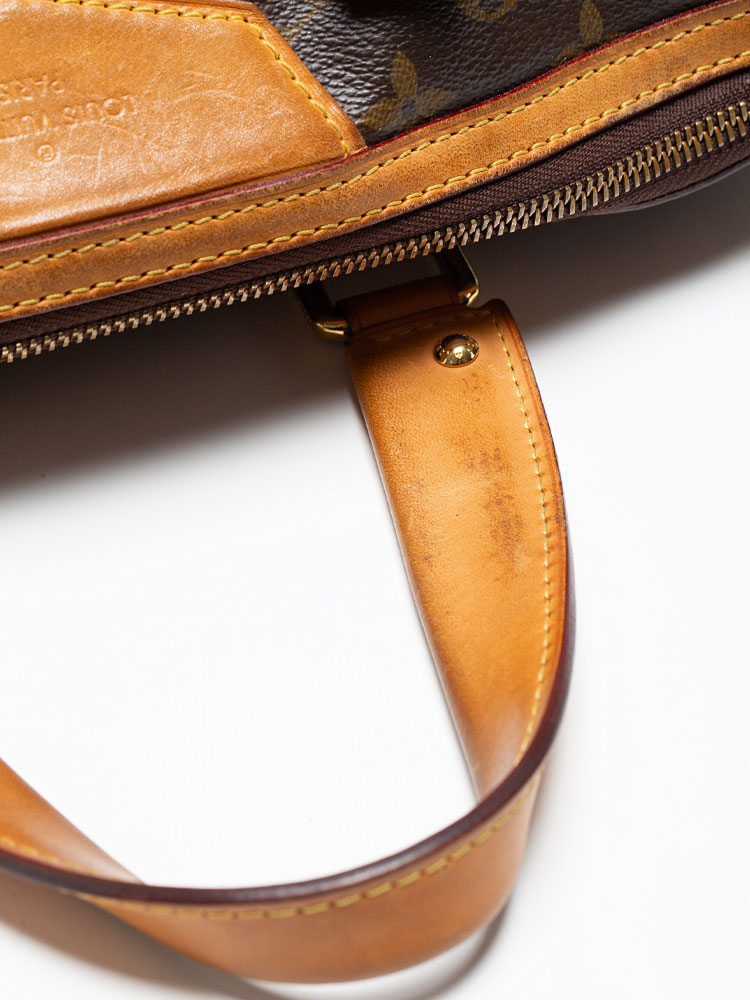 This bag is crafted of monogram coated canvas. Features with vachetta leather top handles, an optional adjustable shoulder strap, and brass hardware. The top opens to a microfiber interior with patch pockets.