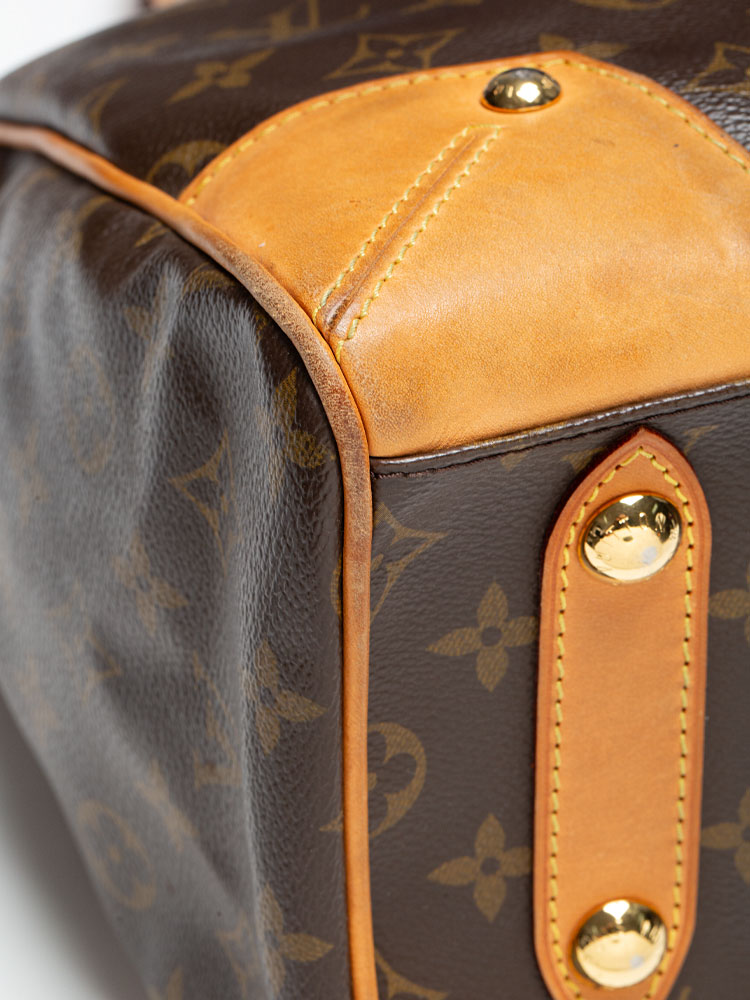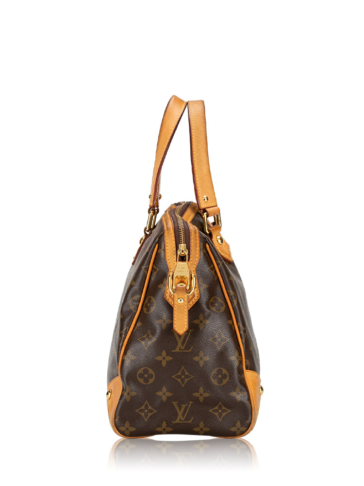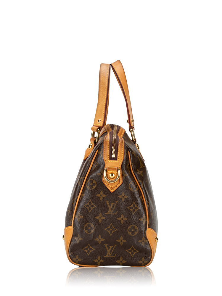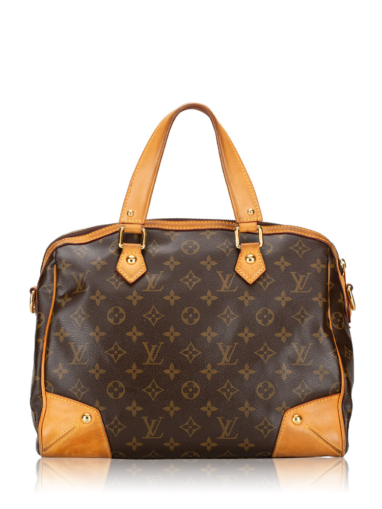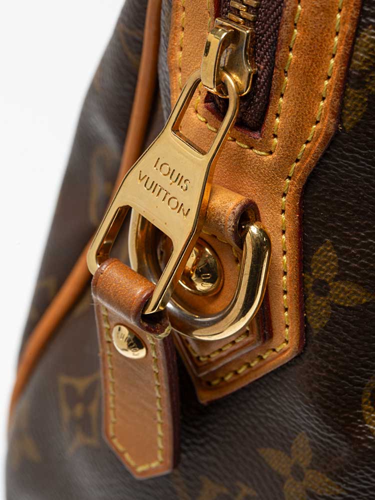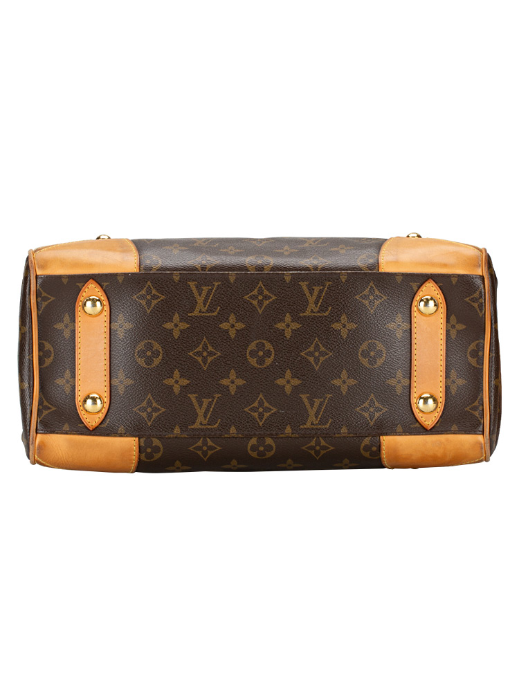 This bag is crafted of monogram coated canvas. Features with vachetta leather top handles, an optional adjustable shoulder strap, and brass hardware. The top opens to a microfiber interior with patch pockets.