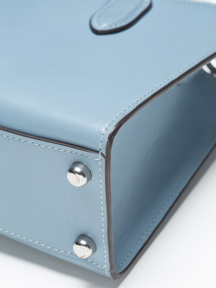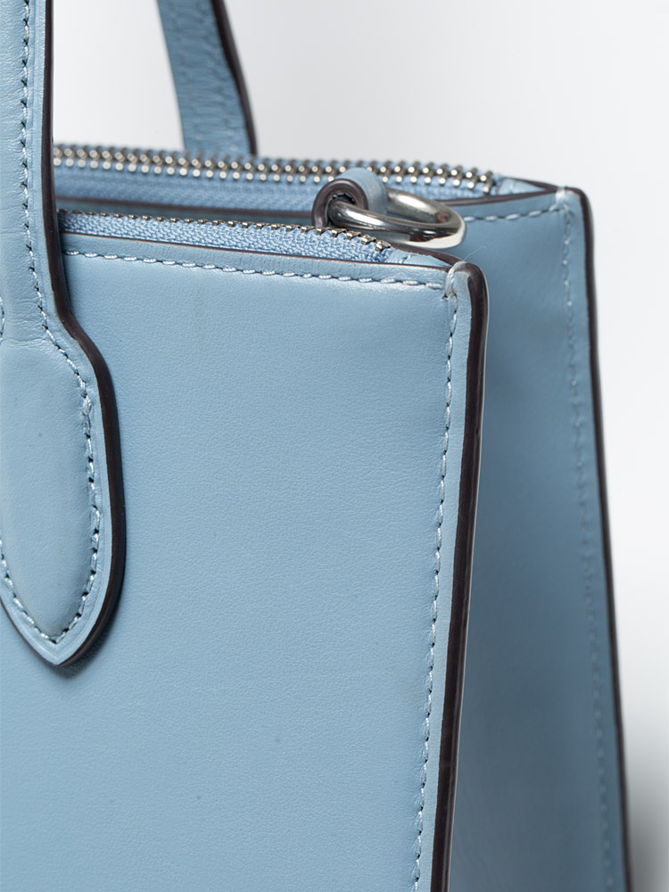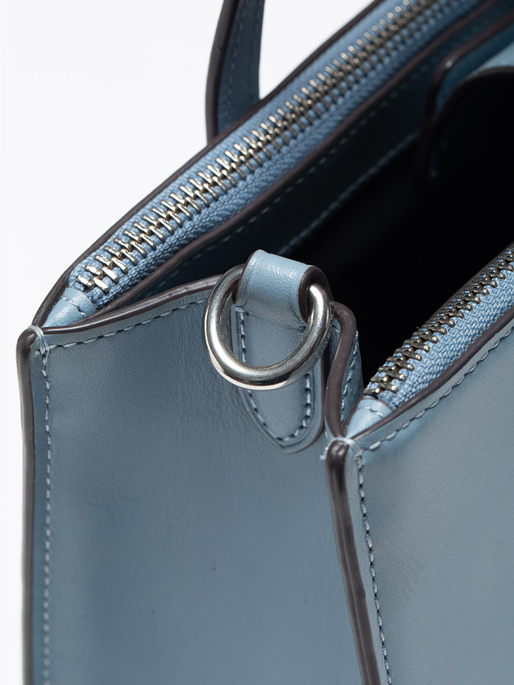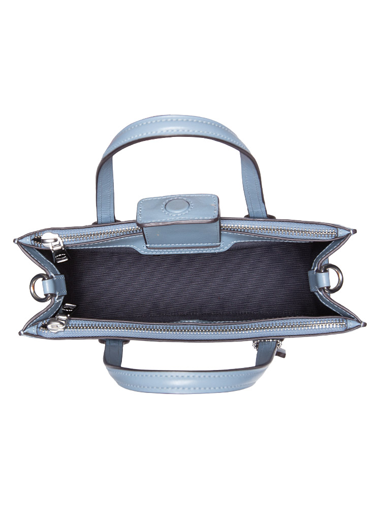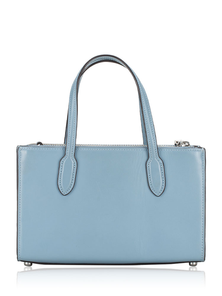 Made of smooth leather. The bag features a magnetic snap closure that opens to fabric lining with two zip compartment, double handles drop 13 cm, adjustable and removable long strap.