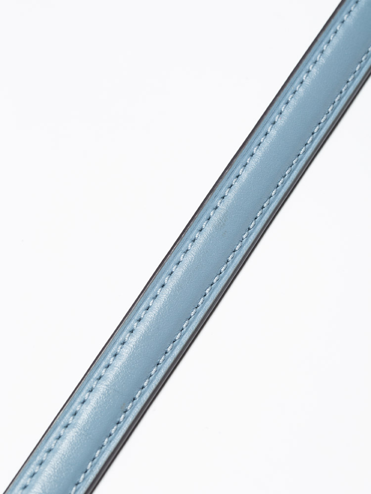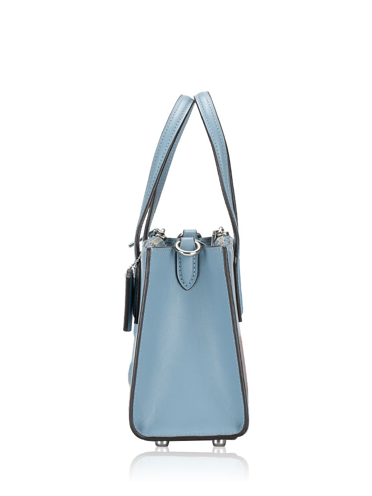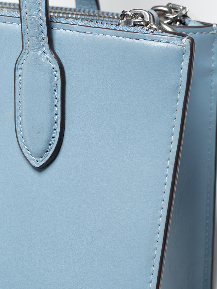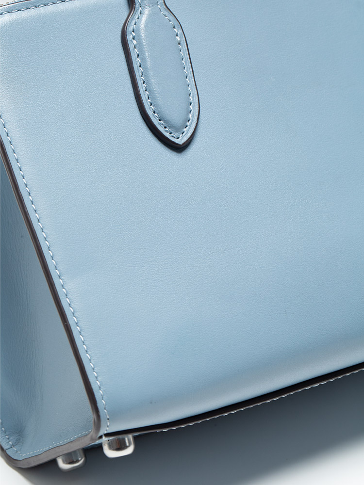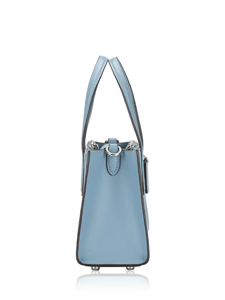 Made of smooth leather. The bag features a magnetic snap closure that opens to fabric lining with two zip compartment, double handles drop 13 cm, adjustable and removable long strap.