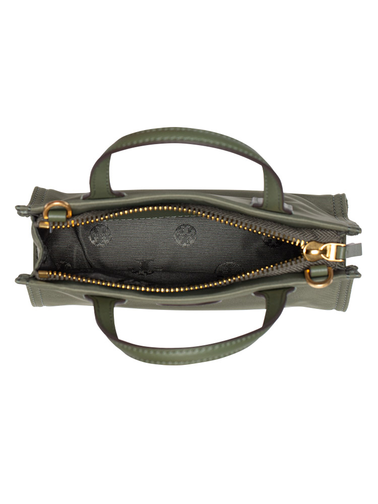 Crafted from nylon. It features an zip closure, old english brass tone hardware, 1 slip pocket, and adjustable or removable crossbody wear.