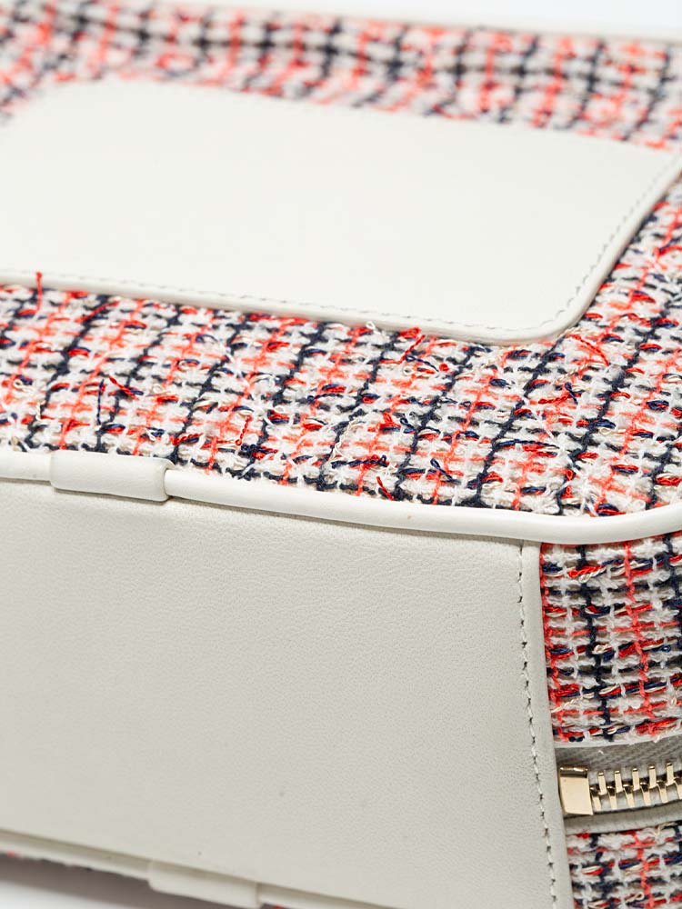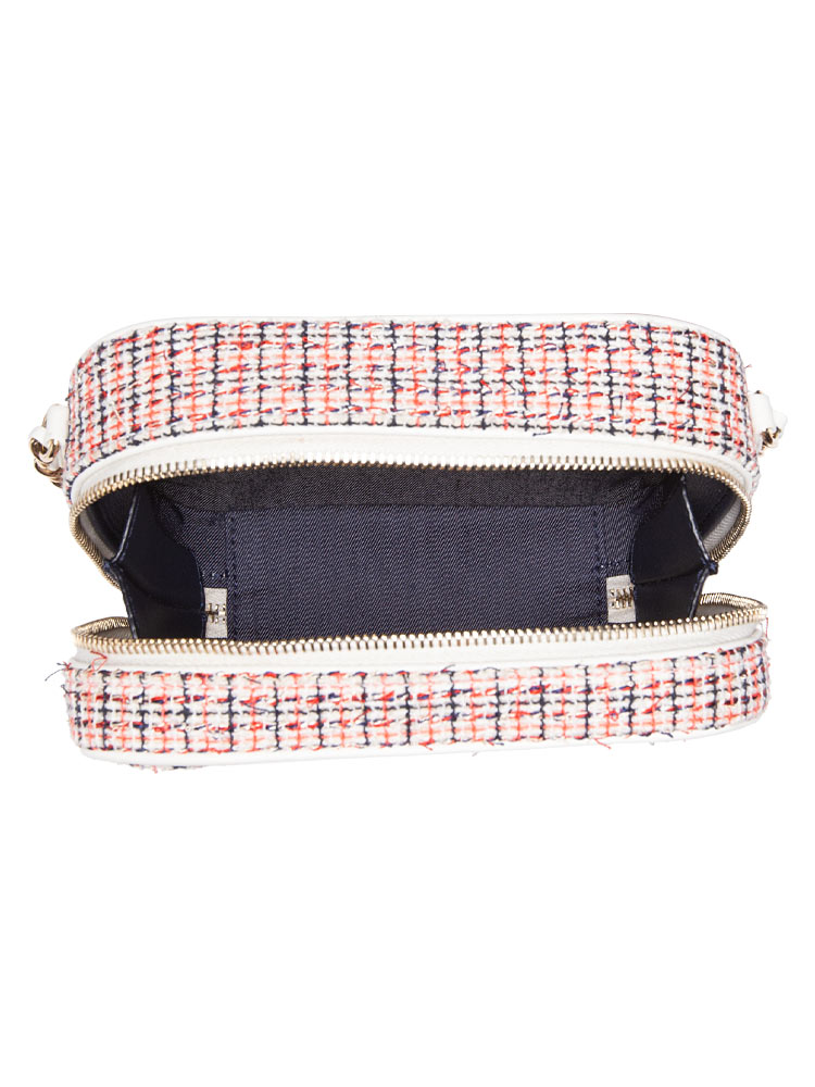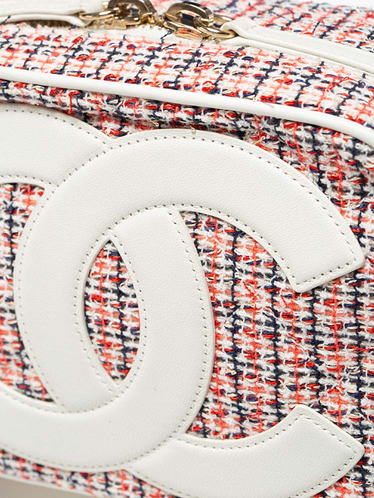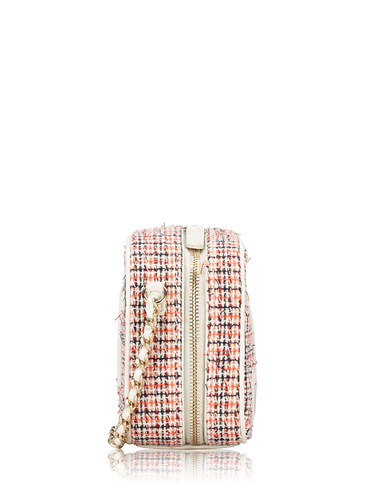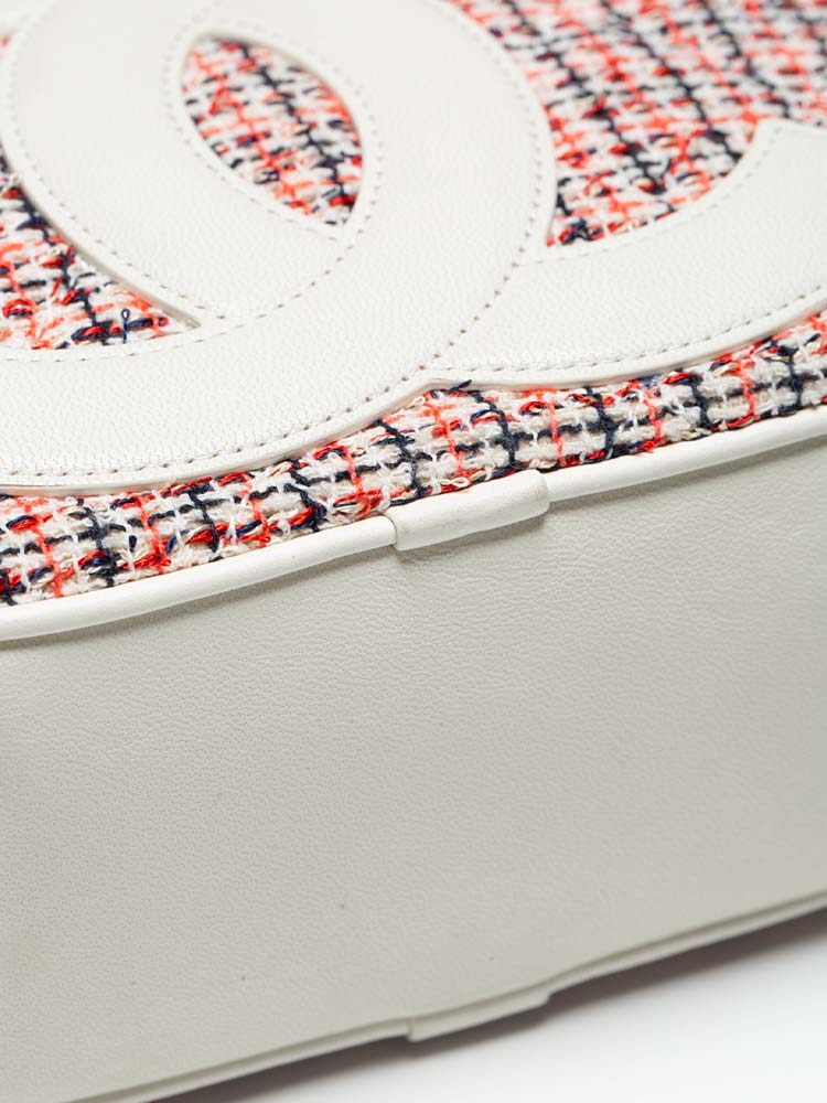 crafted of tweed fabric & lambskin leather in white. The bag features a white leather threaded shoulder strap, a Chanel CC logo, and two pockets. The gold top zippers open to a denim fabric interior.