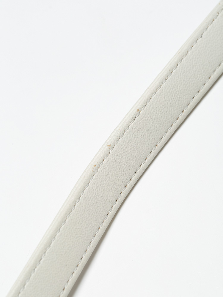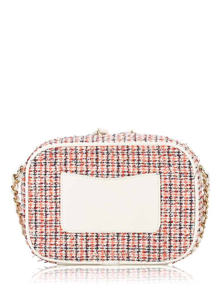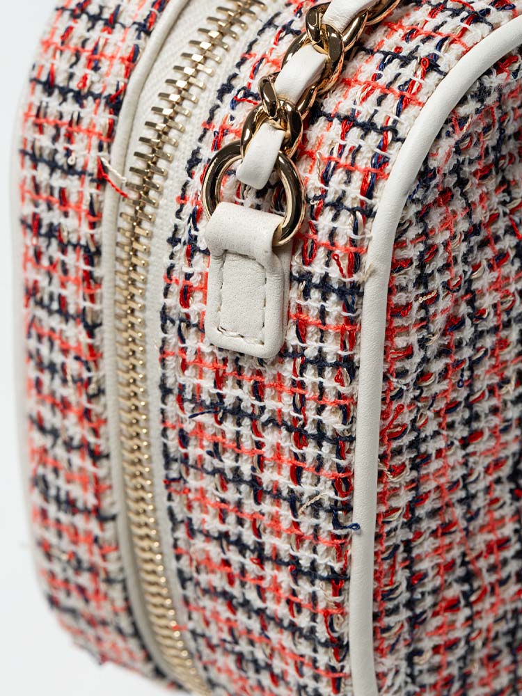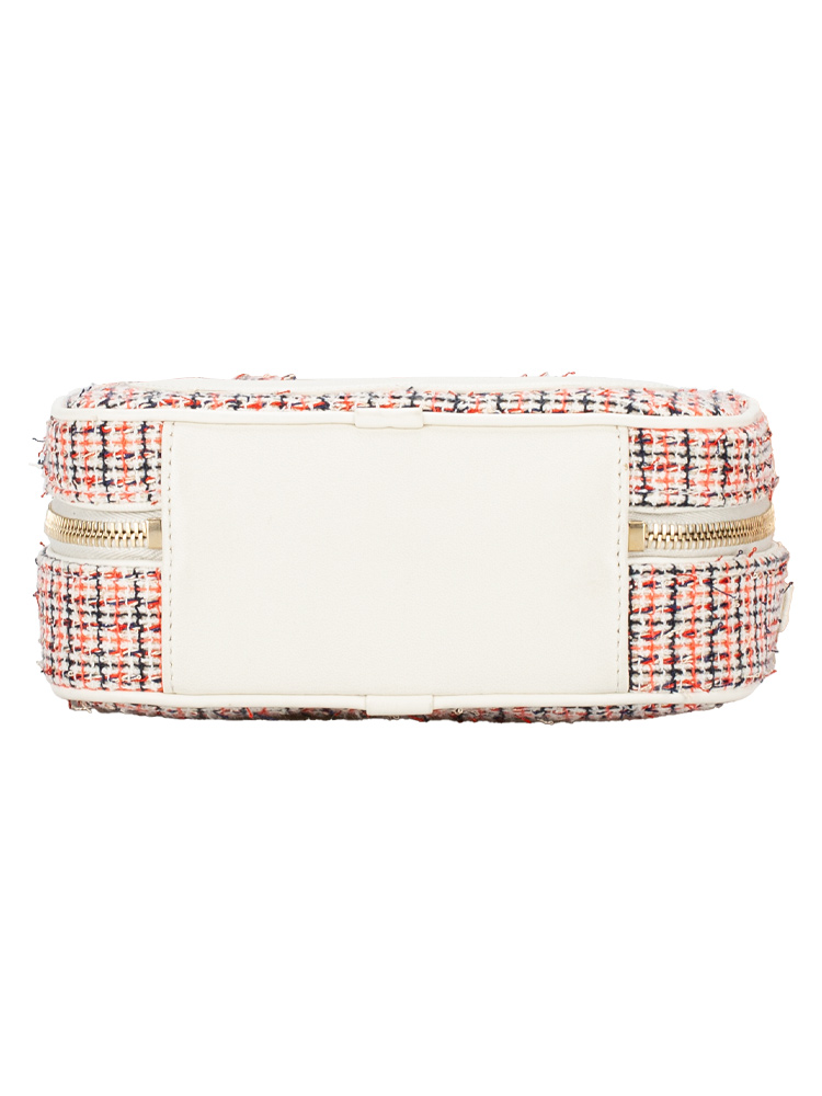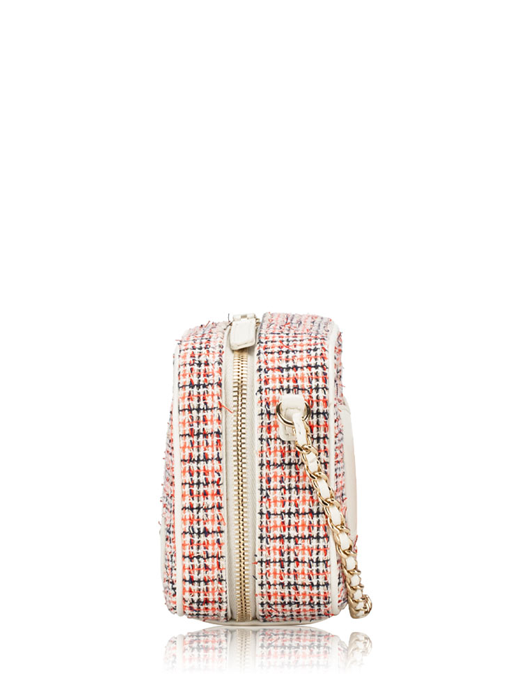 crafted of tweed fabric & lambskin leather in white. The bag features a white leather threaded shoulder strap, a Chanel CC logo, and two pockets. The gold top zippers open to a denim fabric interior.