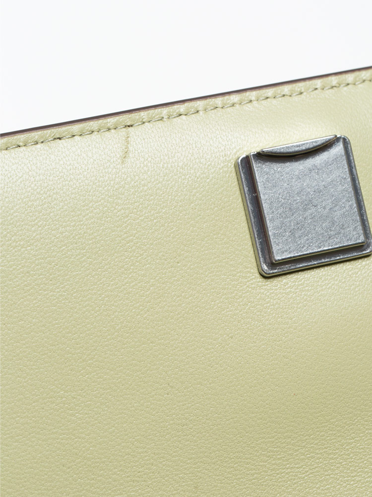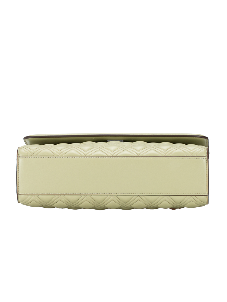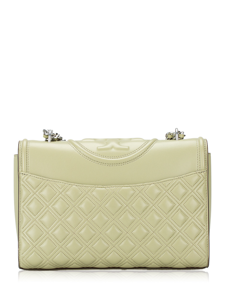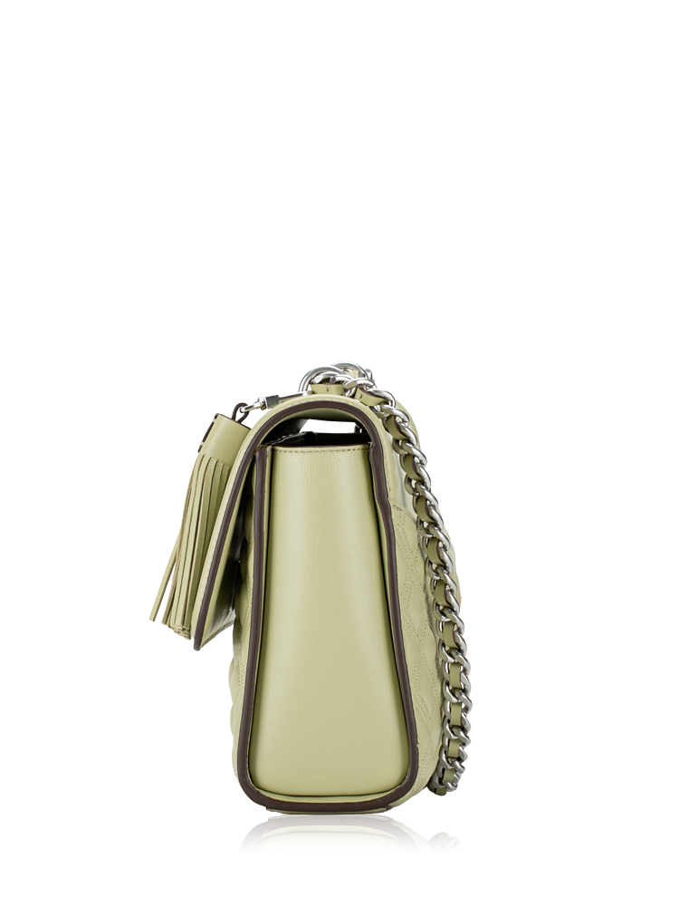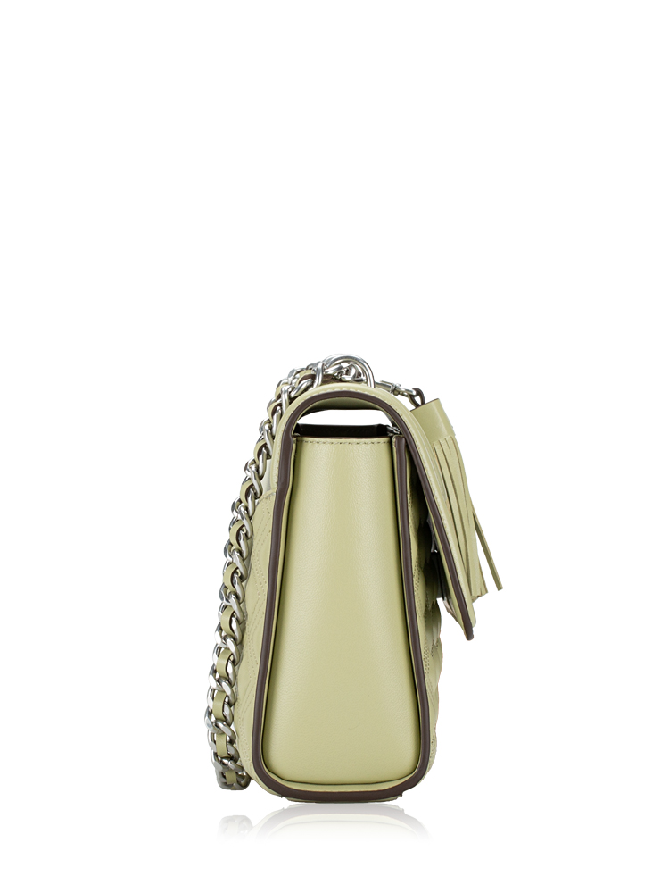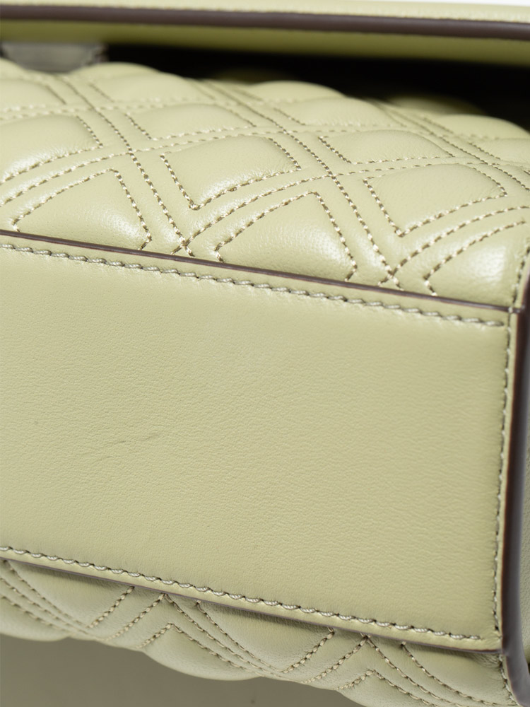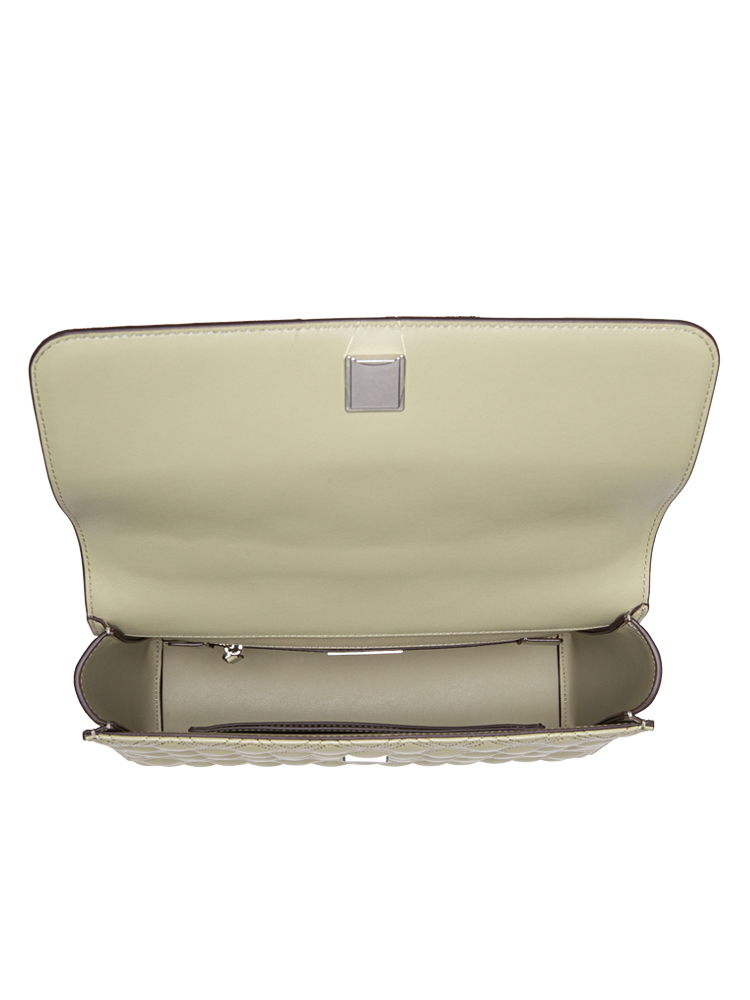 The bag is crafted of quilted leather. It features a flap with magnetic snap closure that opens to a zip wall pocket and double slip wall pockets with no lining. It also has a rear slip compartment.