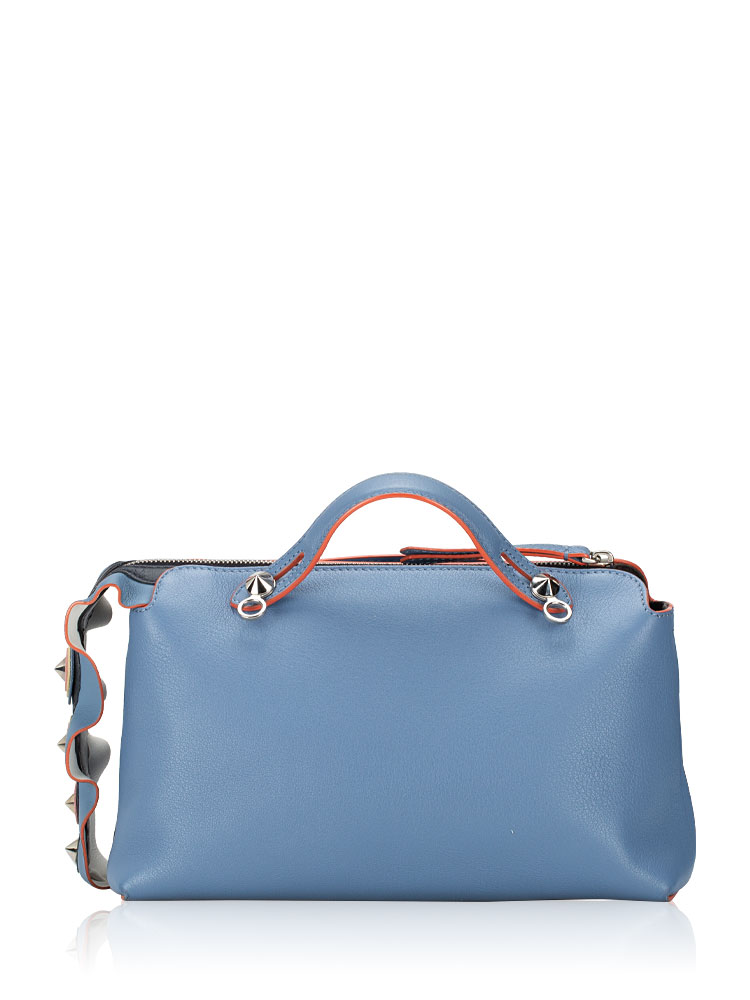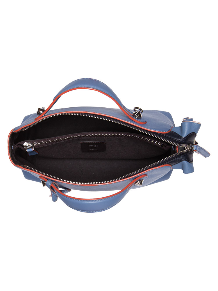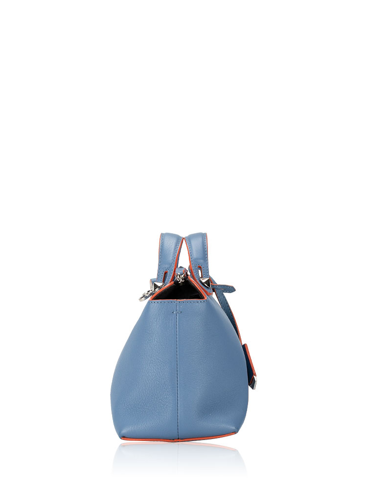 Crafted of calfskin leather. The bag features leather strap top handles with silver cone studs and a cross-body shoulder strap with adjustable silver clasps.