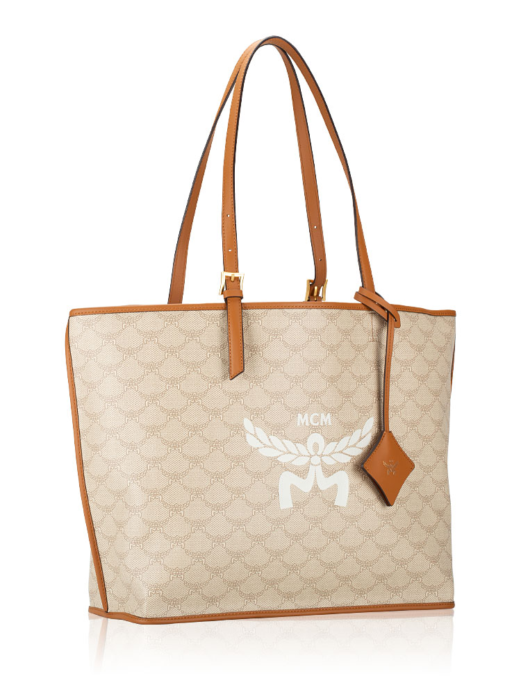This tote is crafted of lauretos coated canvas with the laurel leaves MCM monogram. Features adjustable leather shoulder straps, leather trim, and gold hardware. The top opens to a fabric interior with a removable hanging zipper pocket.