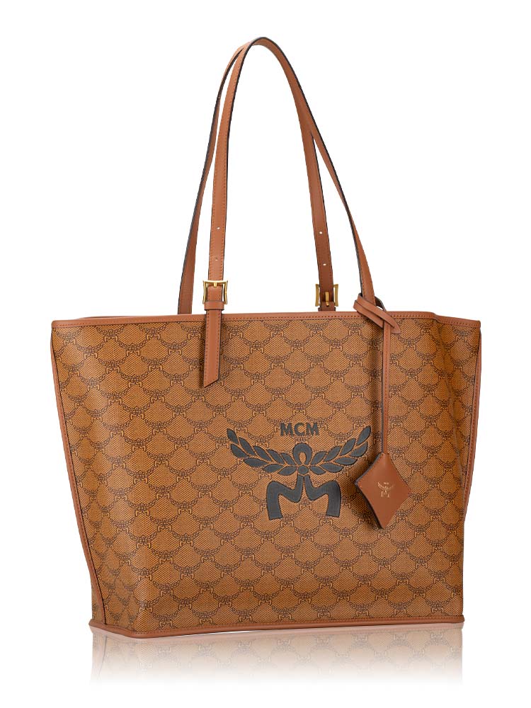 This tote is crafted of lauretos coated canvas with the laurel leaves MCM monogram. Features adjustable leather shoulder straps, leather trim, and gold hardware. The top opens to a fabric interior with a removable hanging zipper pocket.