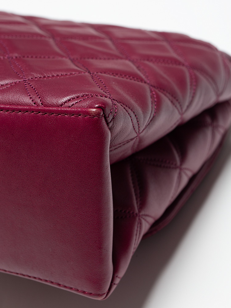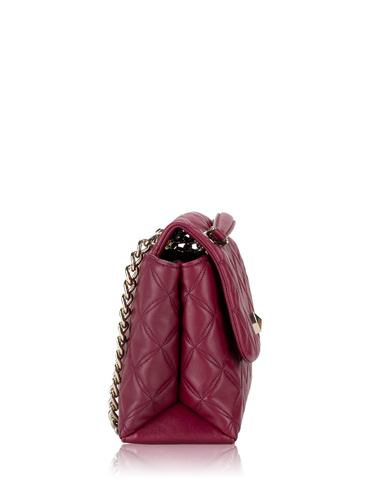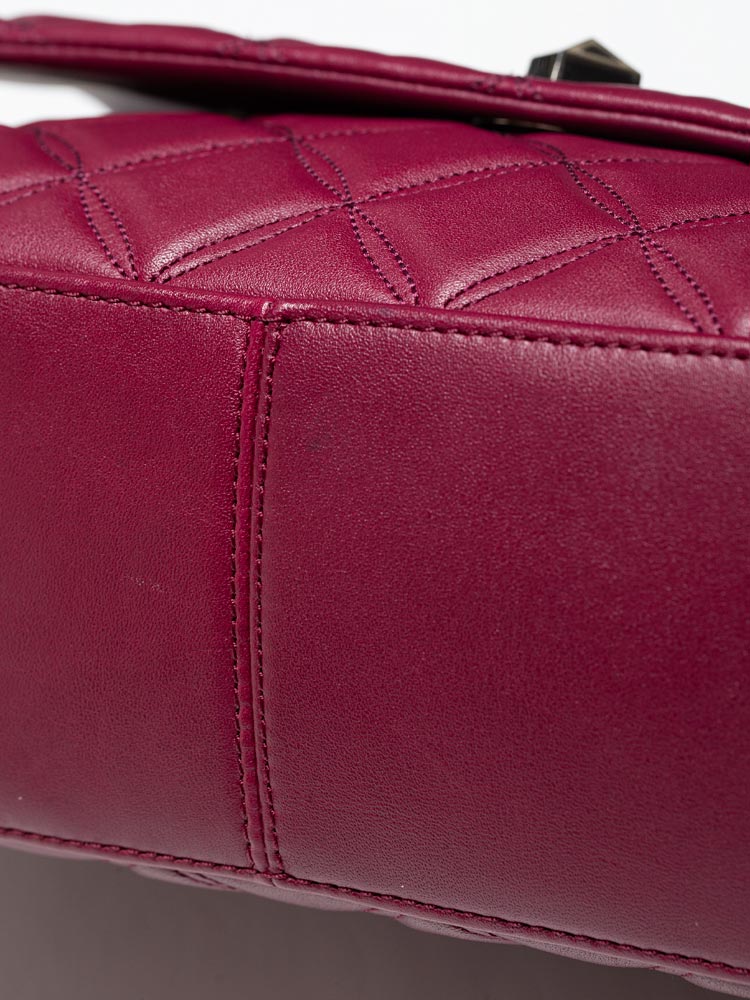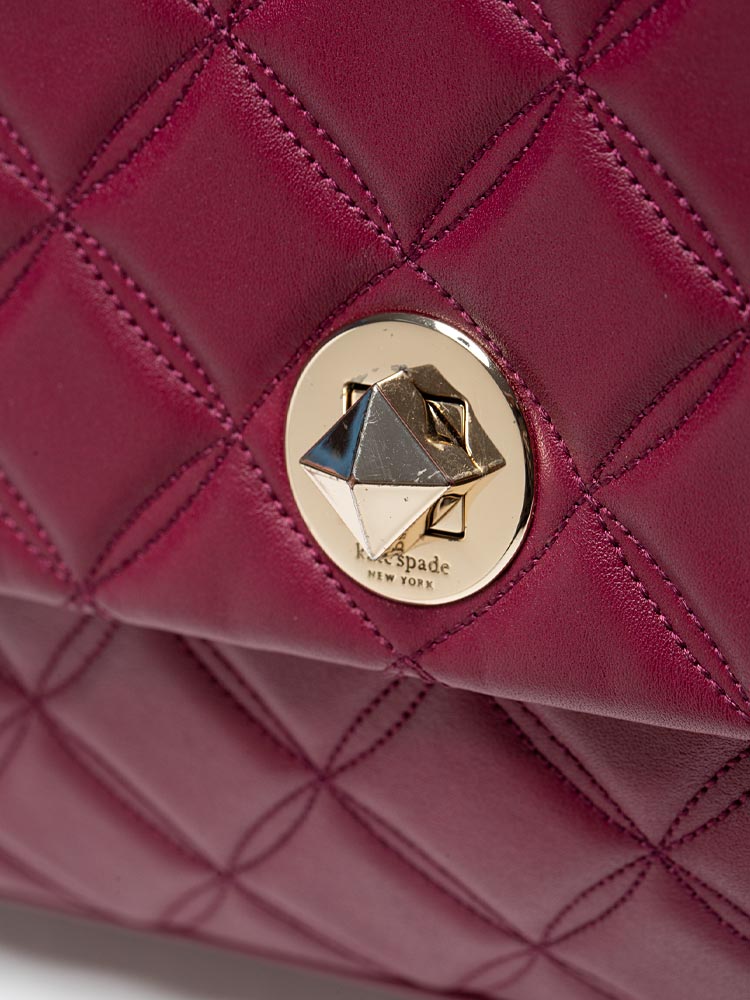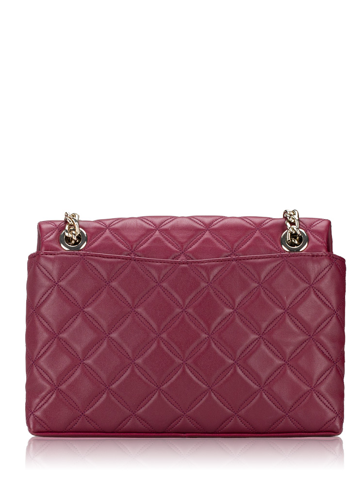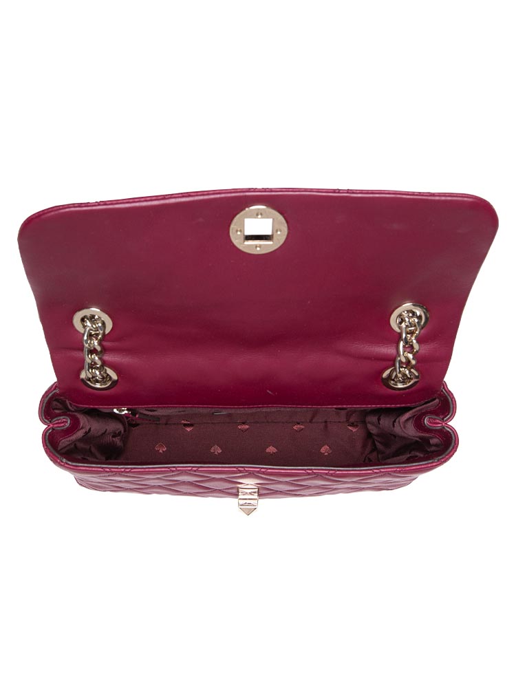 Crafted of quilted leather, the bag features a flap with turn lock closure that opens to logo jacquard lining with a zip pocket. It has an exterior open compartment at backside and chain crossbody strap with leather shoulder pads.