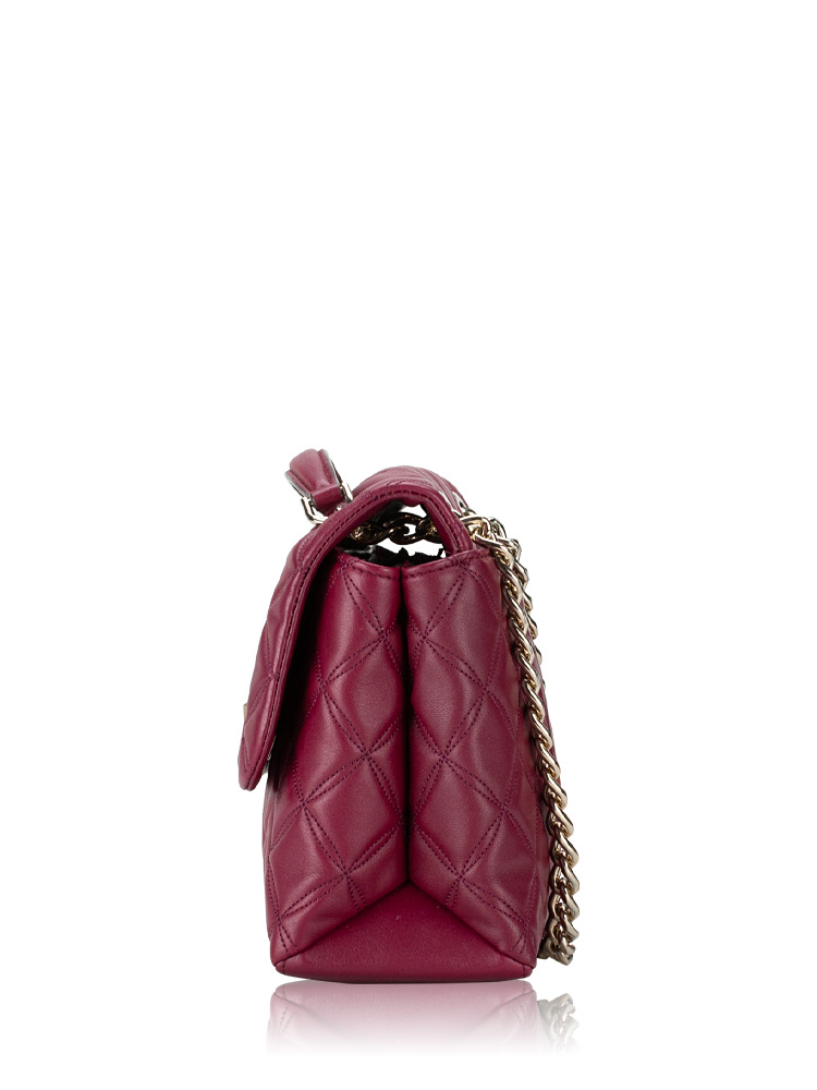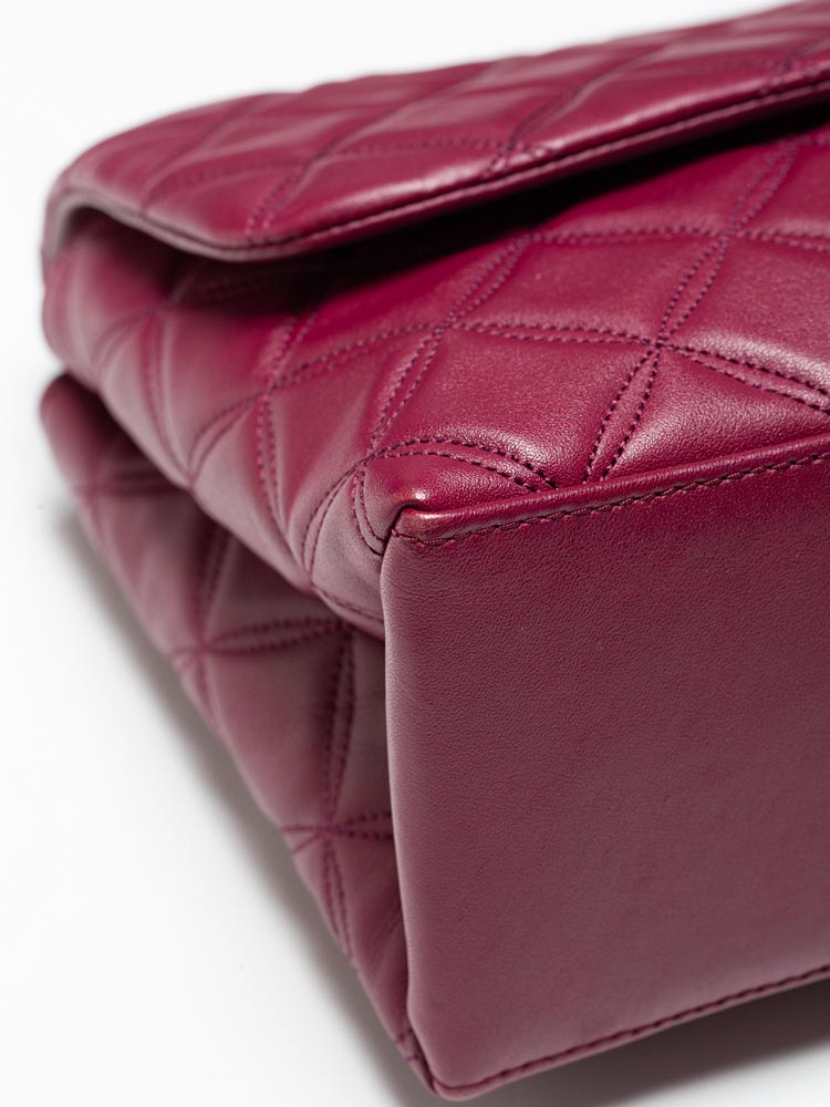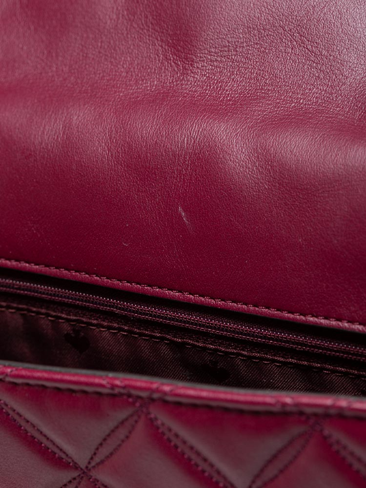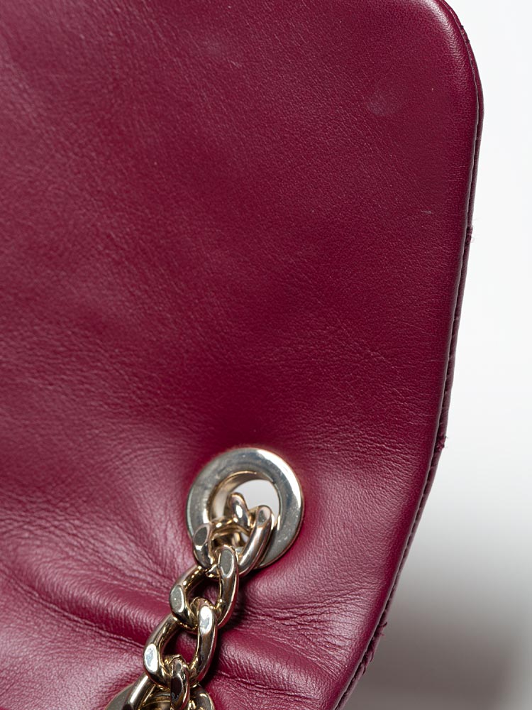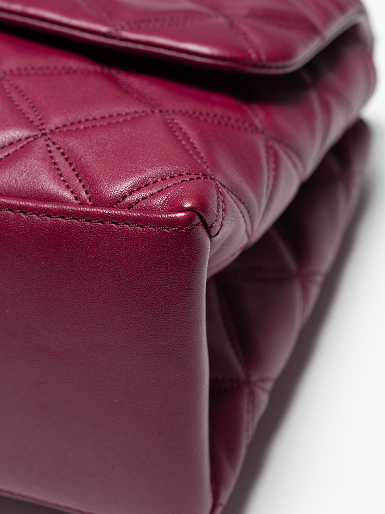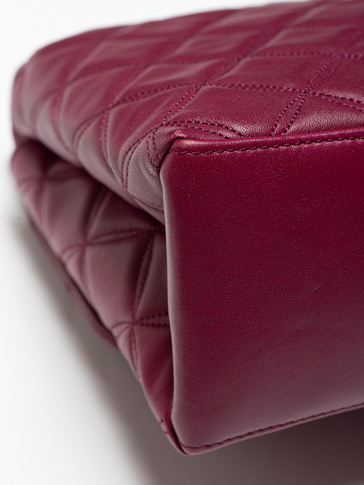 Crafted of quilted leather, the bag features a flap with turn lock closure that opens to logo jacquard lining with a zip pocket. It has an exterior open compartment at backside and chain crossbody strap with leather shoulder pads.