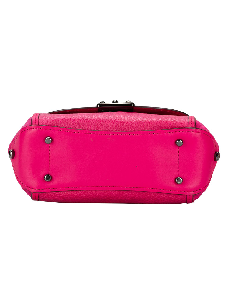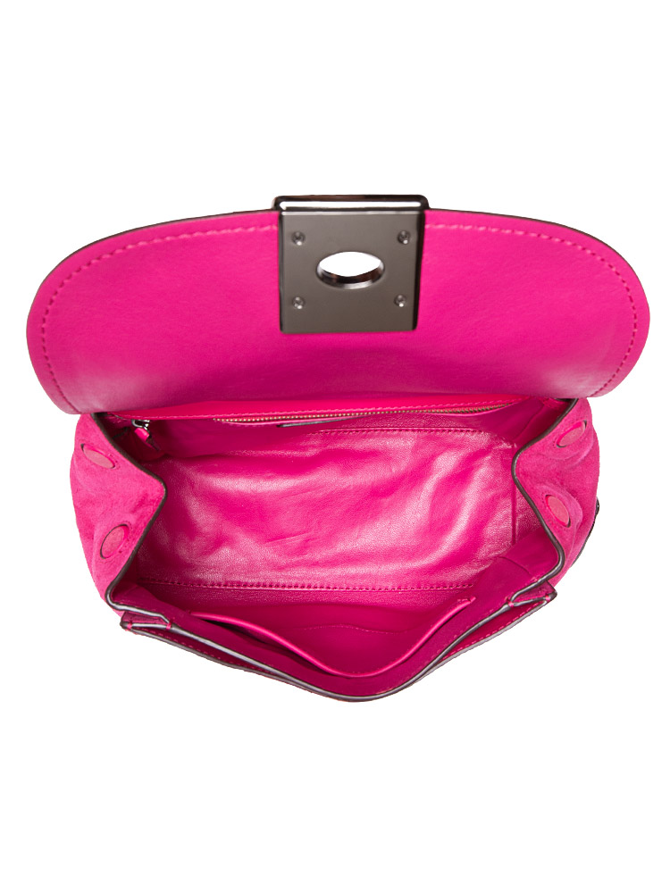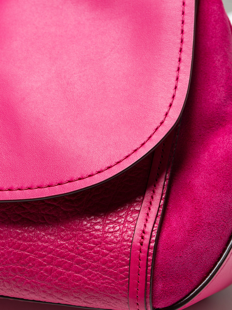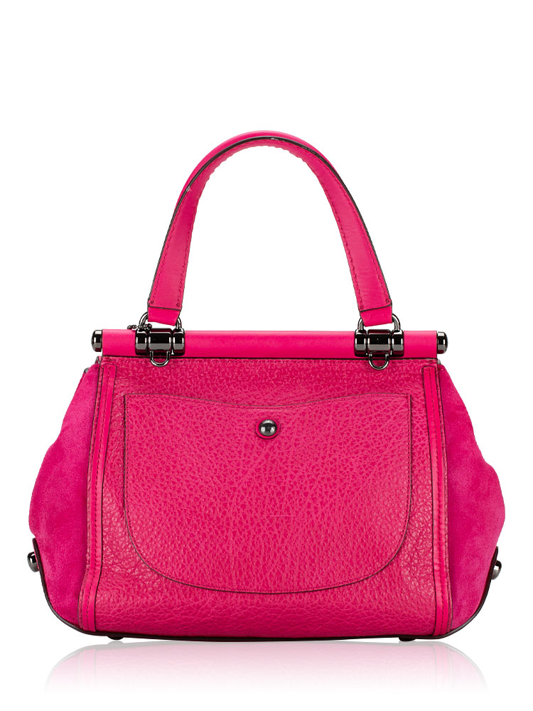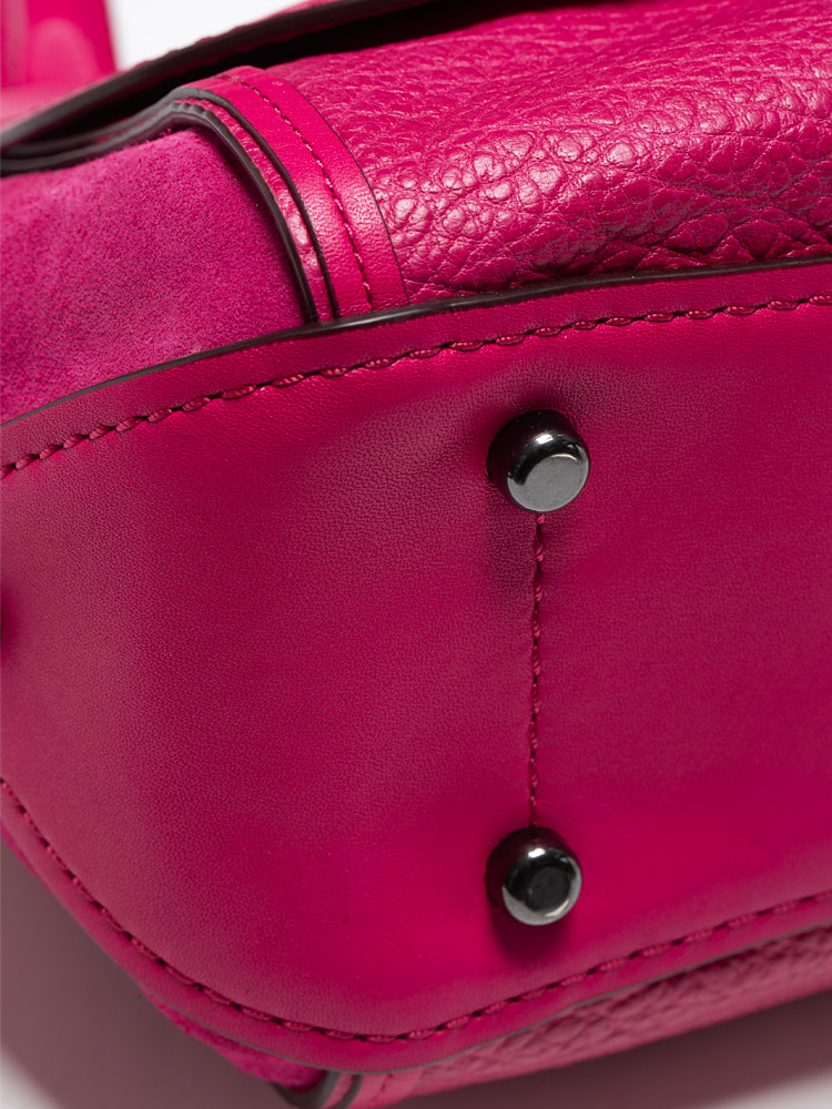 Made of pebble leather and suede. The bag features a turn lock closure that opens to smooth leather lining with interior one zip pocket, one slip pocket, one slip pocket at front and exterior one slip pocket at back with button closure.
