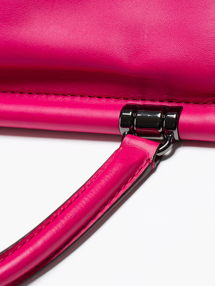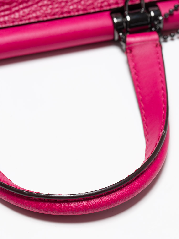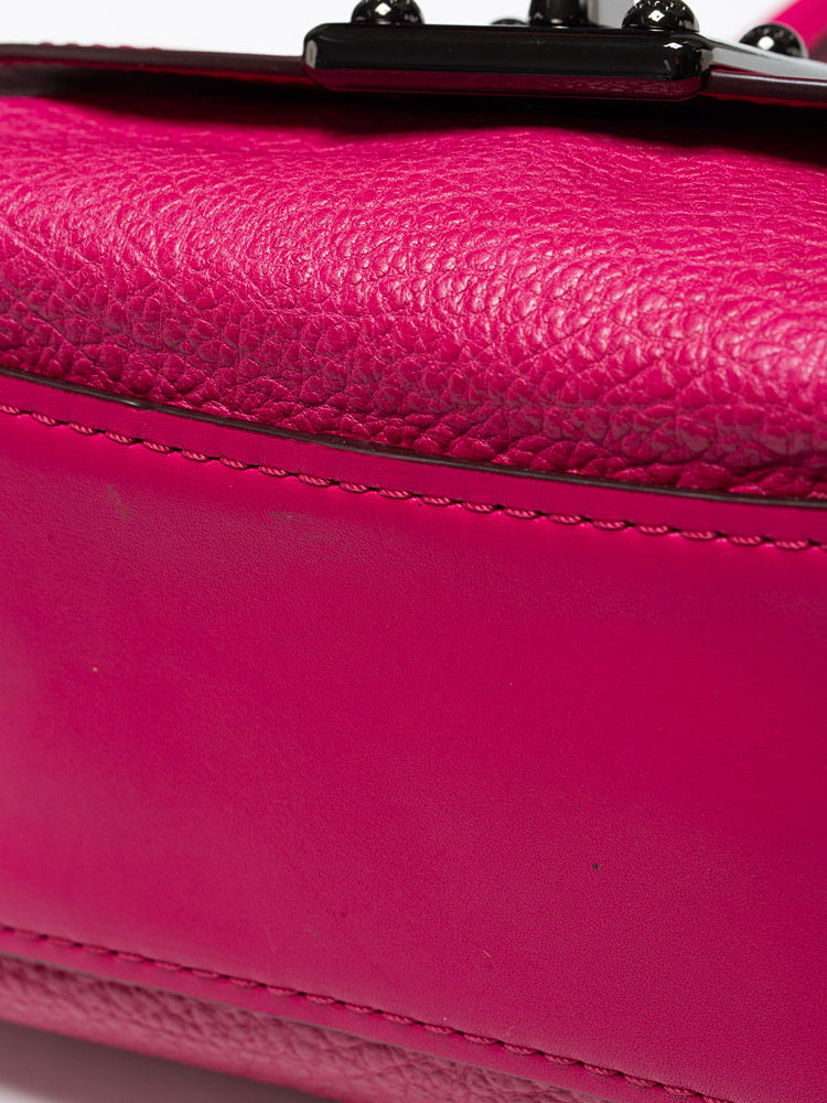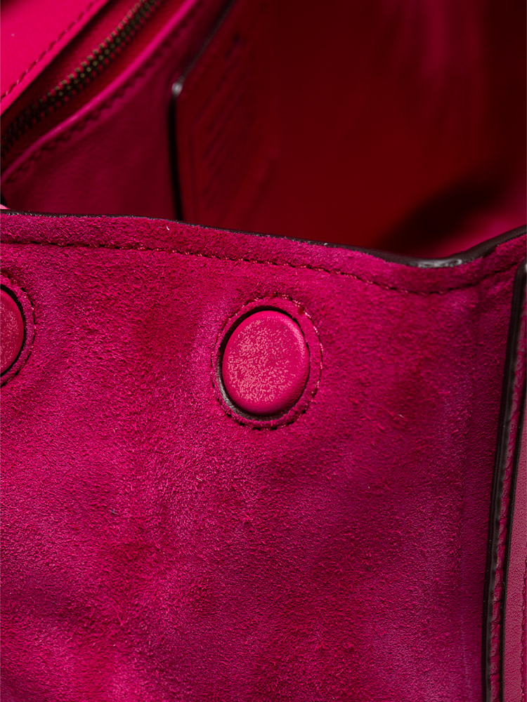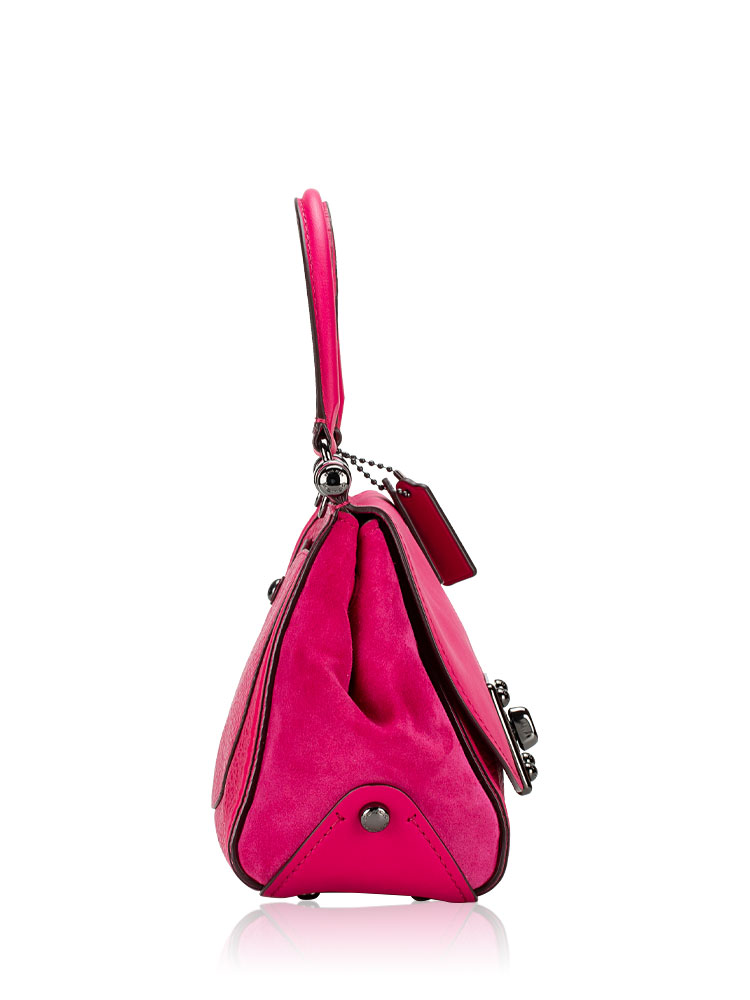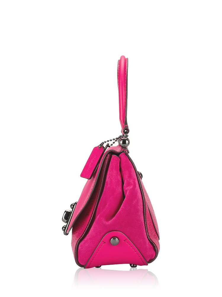 Made of pebble leather and suede. The bag features a turn lock closure that opens to smooth leather lining with interior one zip pocket, one slip pocket, one slip pocket at front and exterior one slip pocket at back with button closure.