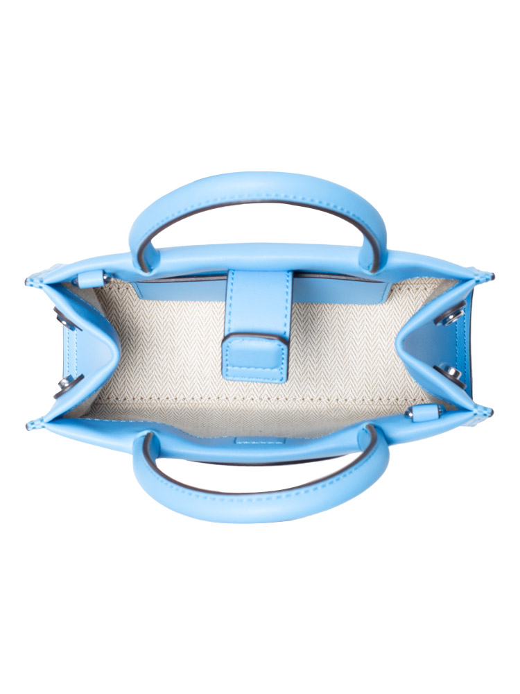 Made of smooth leather with fabric lining interior. The bag features an open magnetic snap closure, 1 slip pocket, silver antique tone hardware, snap button on side, and adjustable or removable crossbody wear.