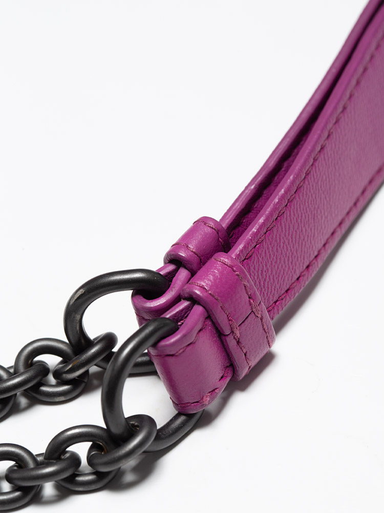 Crafted of soft woven lambskin leather. The bag features a chain-link shoulder strap with shoulder pads and a facing flap. This opens to a partitioned suede interior with a slip and zipper pockets.