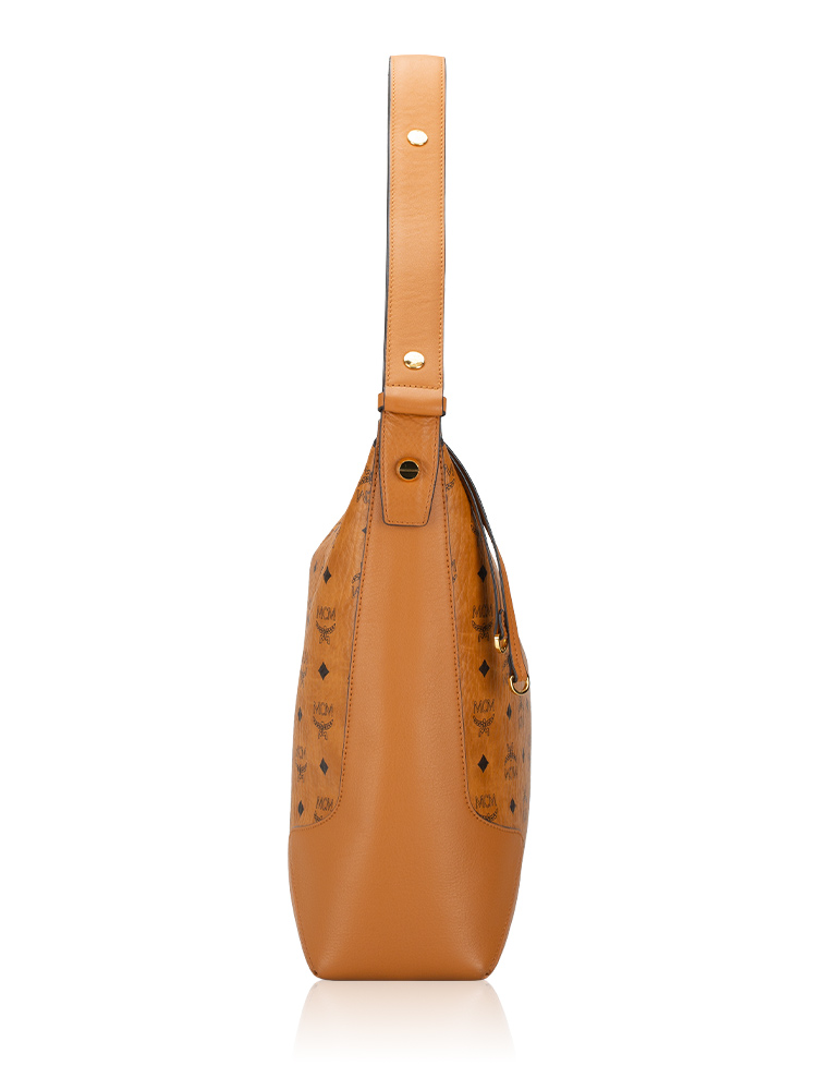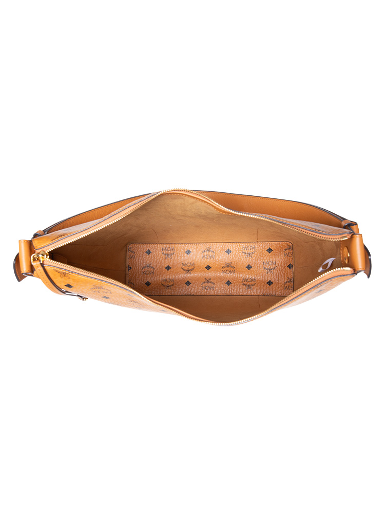 Crafted of coated canvas mixed with leather trim with classic black MCM monogram print. Features with adjustable leather shoulder strap with gold-tone rings. The top zipper opens to a suede interior.