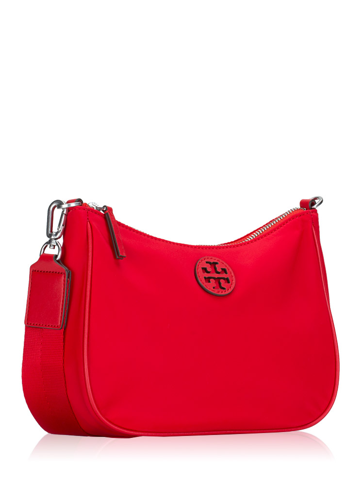 Crafted from durable nylon, the bag features an optional nylon webbing shoulder strap. The top zipper opens to signature fabric lining in matching color, and a slip pocket. Decorated by Tory Burch leather logo at front side.