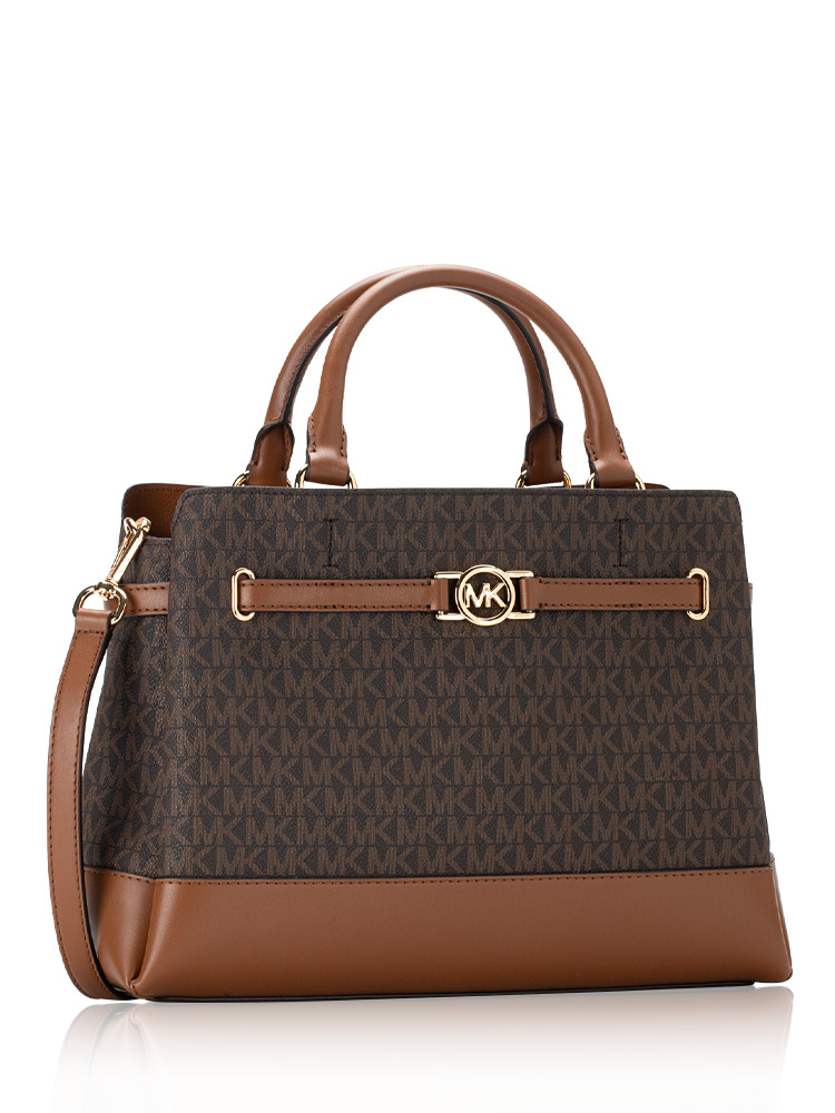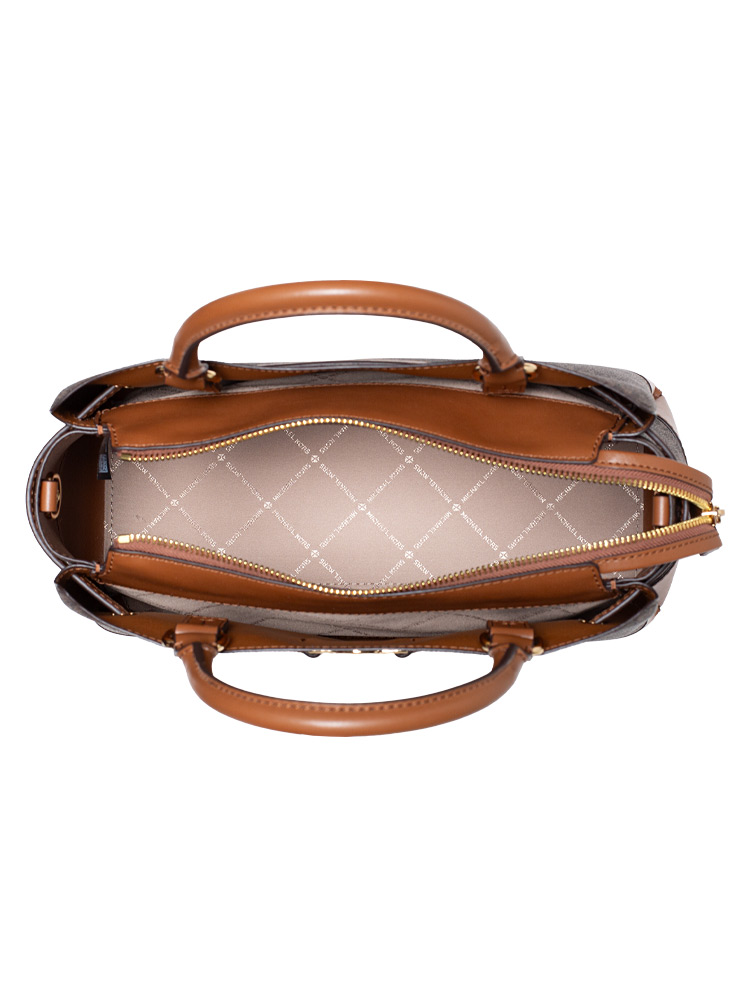 Signature coated canvas with smooth leather. The bag features a zip closure that opens to polyester lining with one zip pocket, exterior two slip compartment, and double handles.