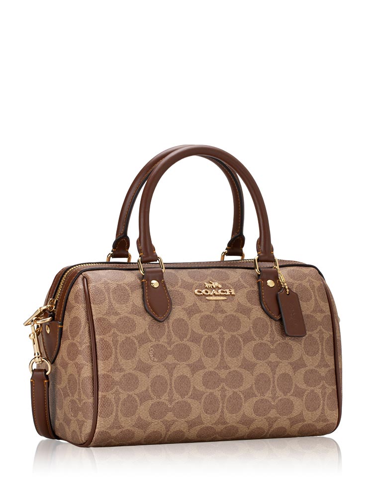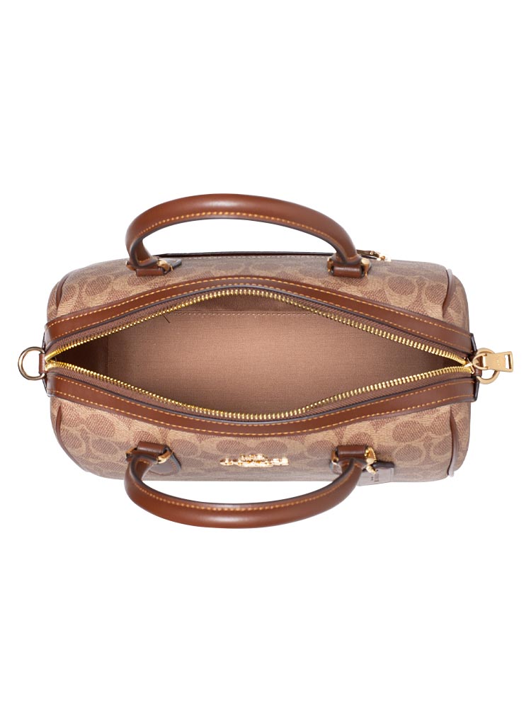 Signature coated canvas and smooth leather. The bag features a zip closure that opens to fabric lining with interior one zip pocket, one slip pocket and exterior one zip pocket at back.