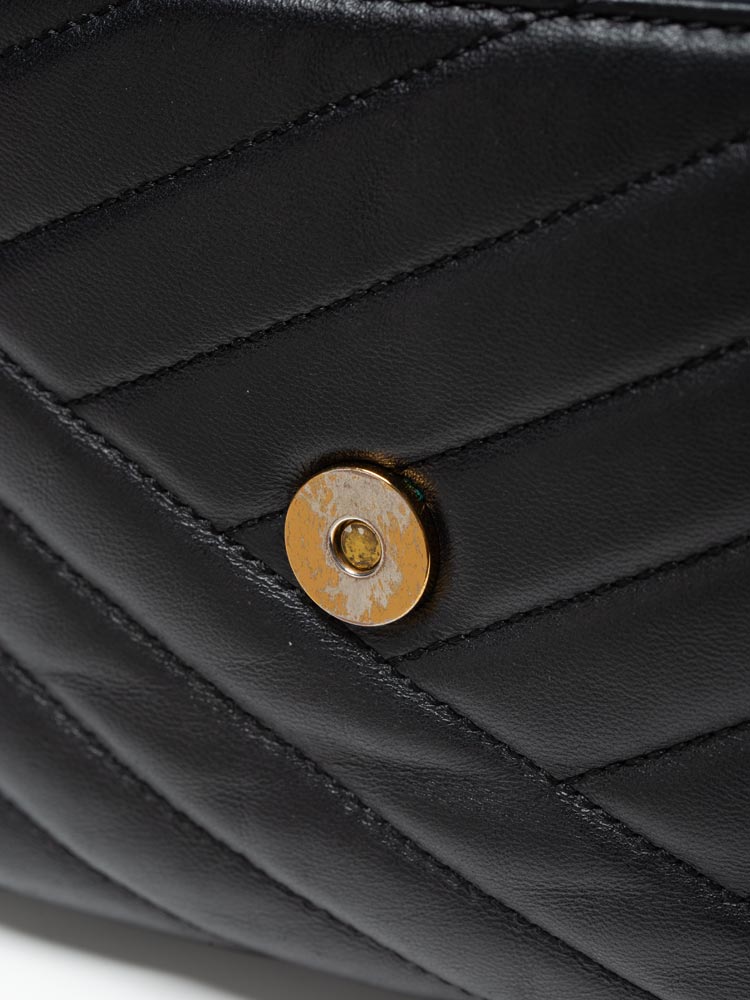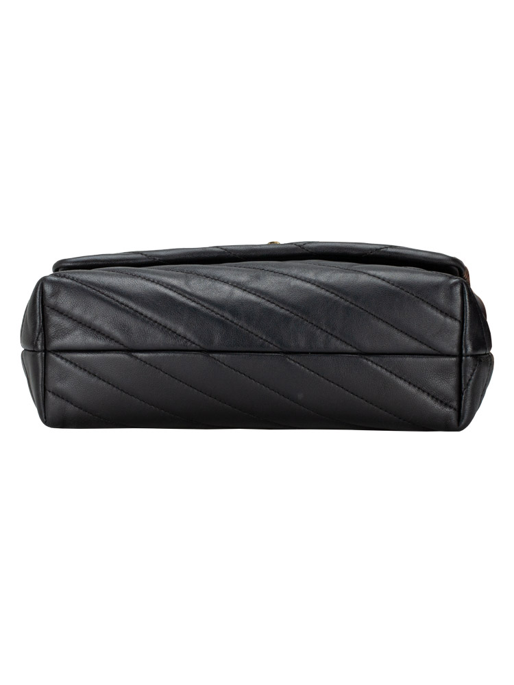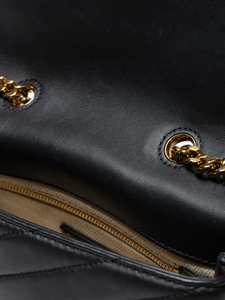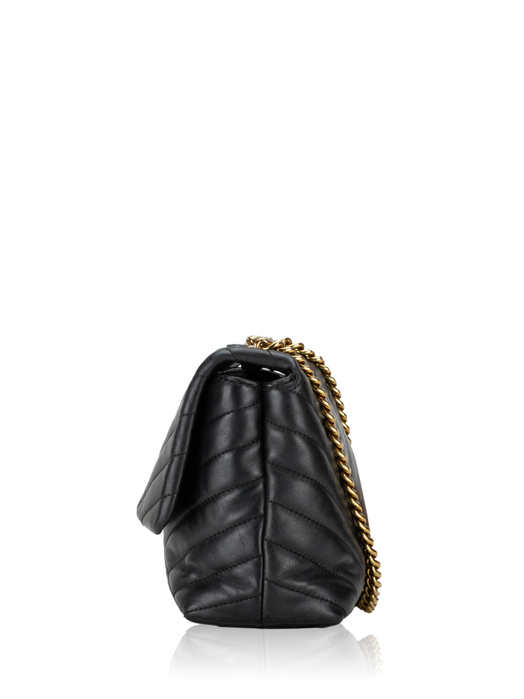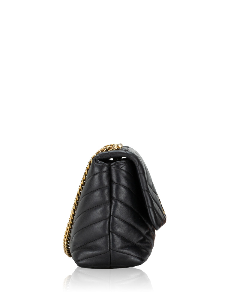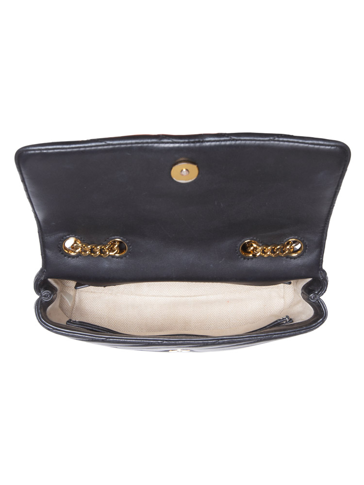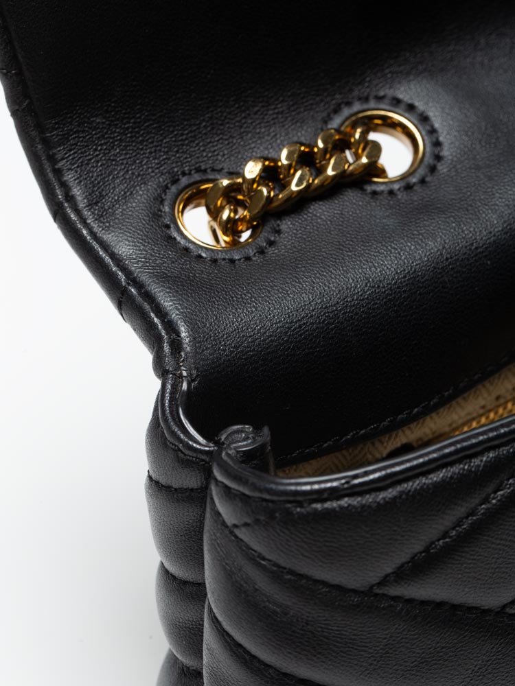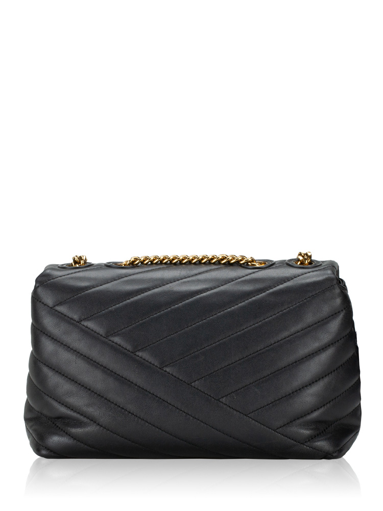 Chevron-quilting on the softest leather that has been stitched and tanned, with a beveled logo in brushed gold. The Kira Flap Shoulder Bag has an adjustable linked chain strap.