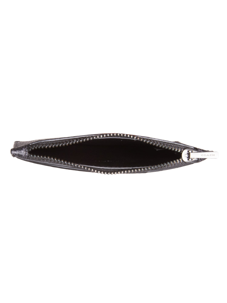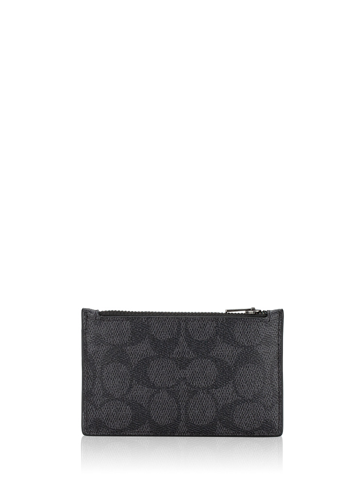 Signature coated canvas with leather and fabric lining. The card case features an open zip closure, gunmetal tone hardware, four card slots and one slip pocket.