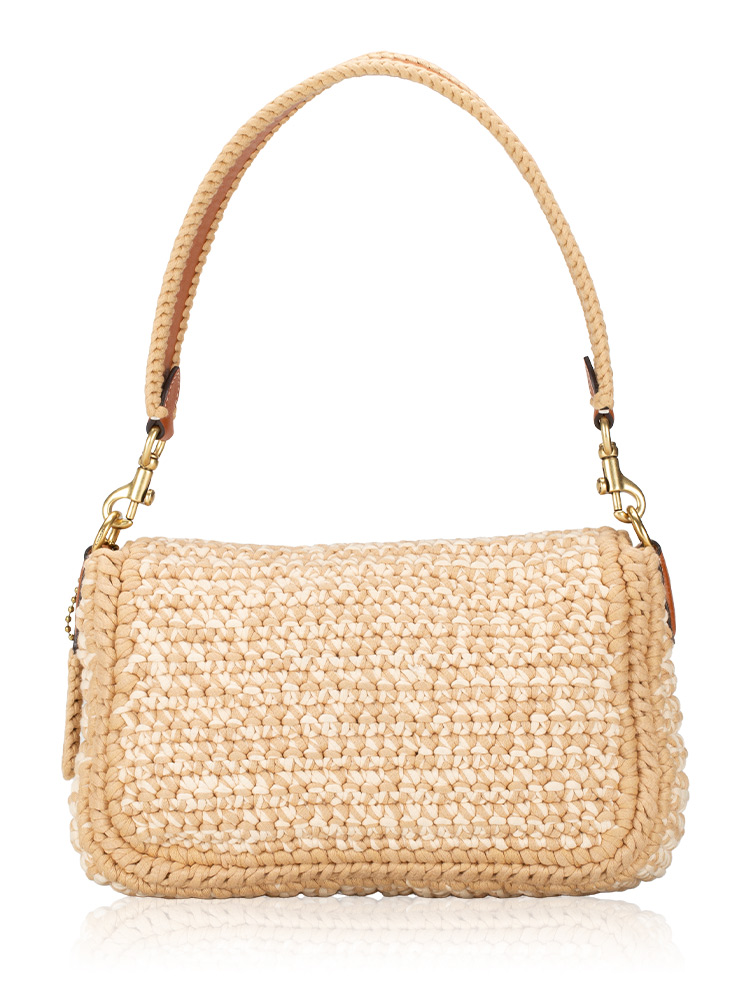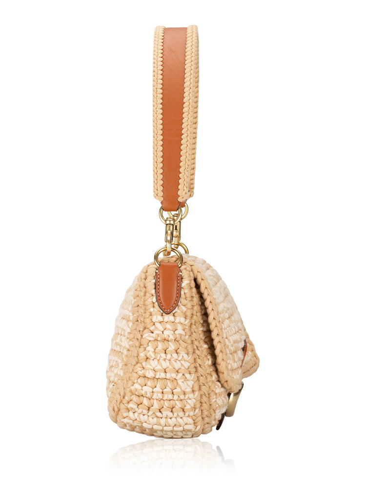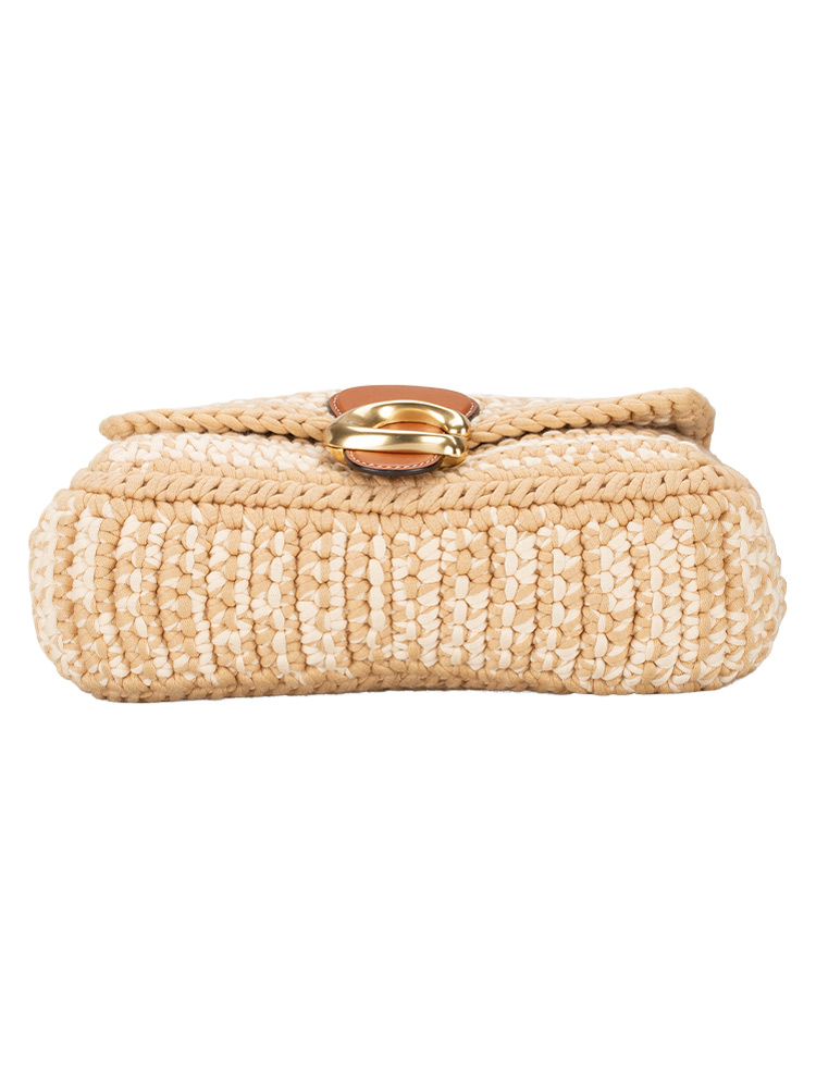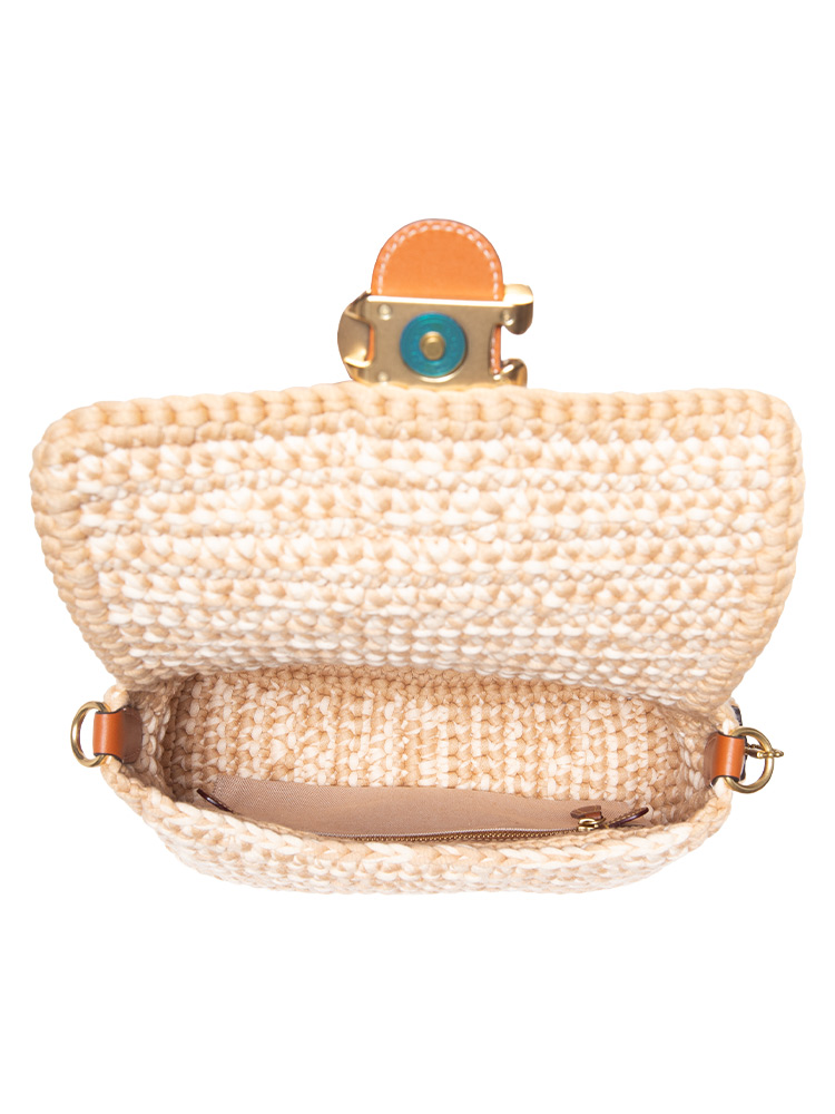Made of crochet yarn and glovetanned leather. The bag features a magnetic closure that opens to crochet yarn and glovetanned leather lining with interior one zip pocket.