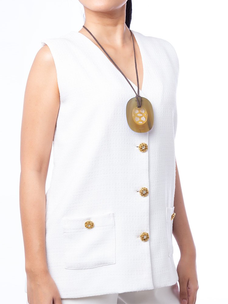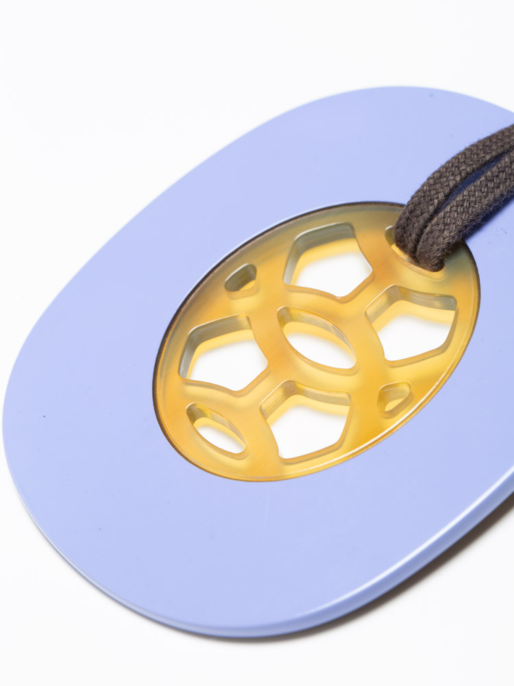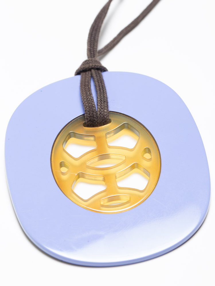 This necklace is composed of buffalo horn and lacquered wood in purple, hanging from a waxed cotton cord.
