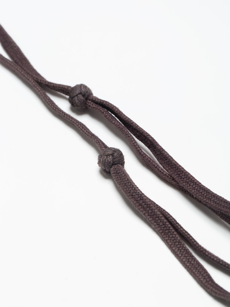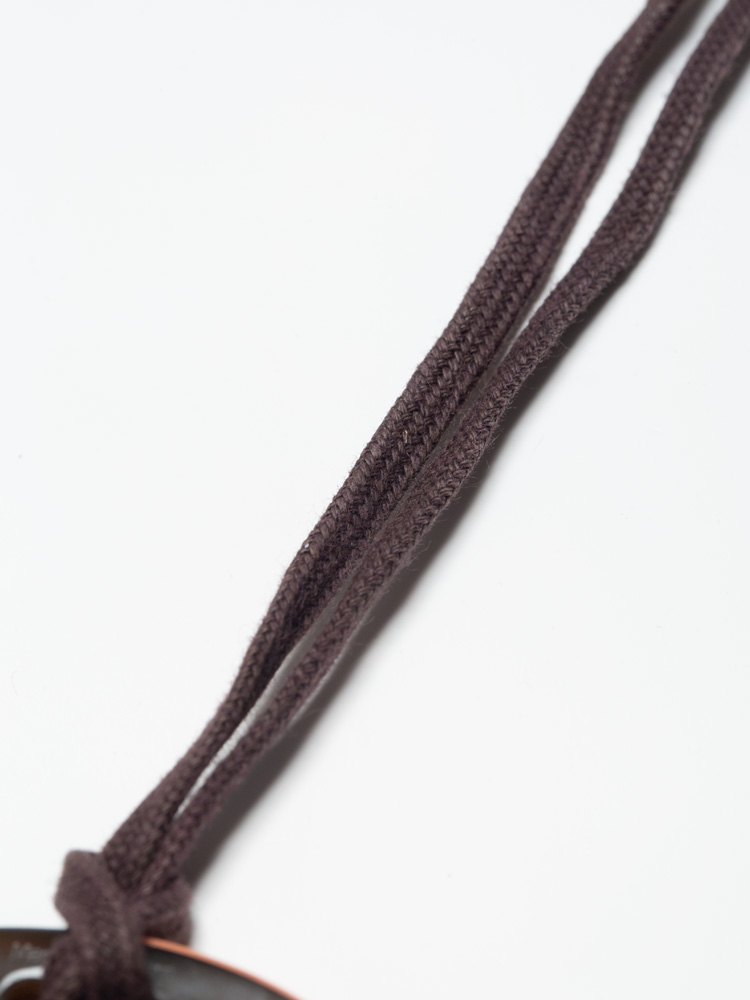 This necklace is composed of buffalo horn and lacquered wood in orange, white and brown hang from a waxed cotton cord.