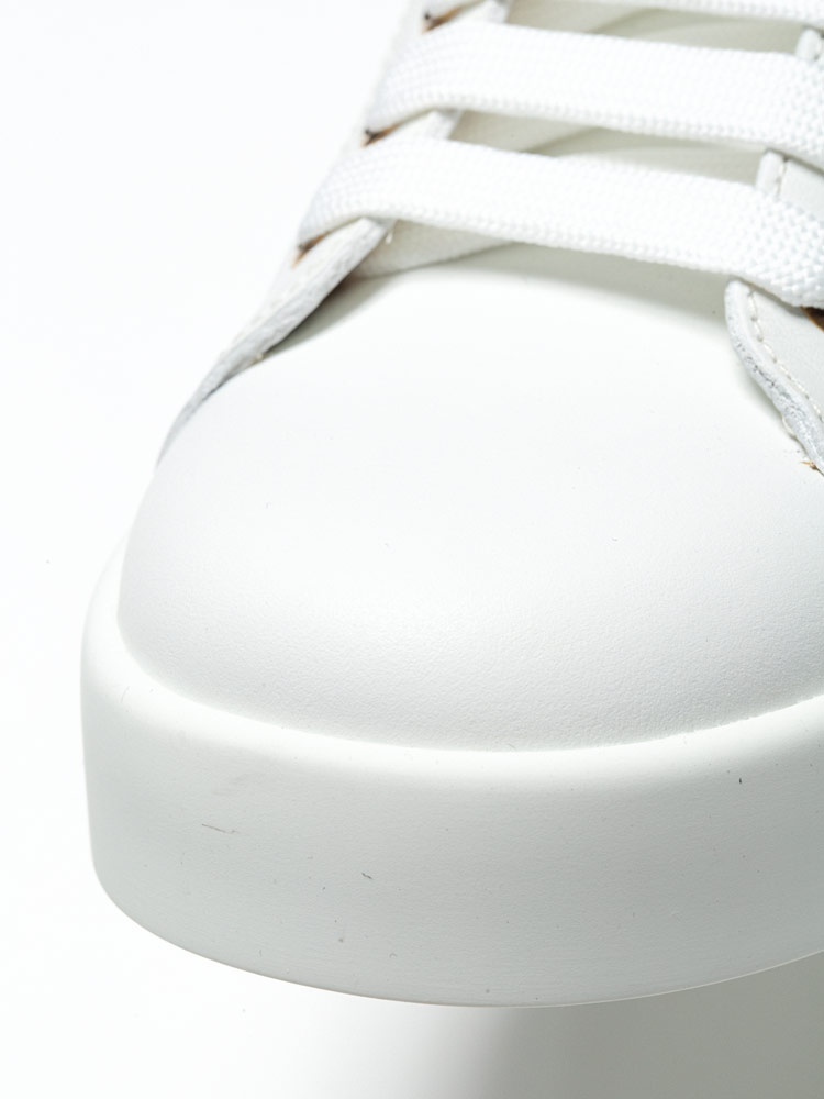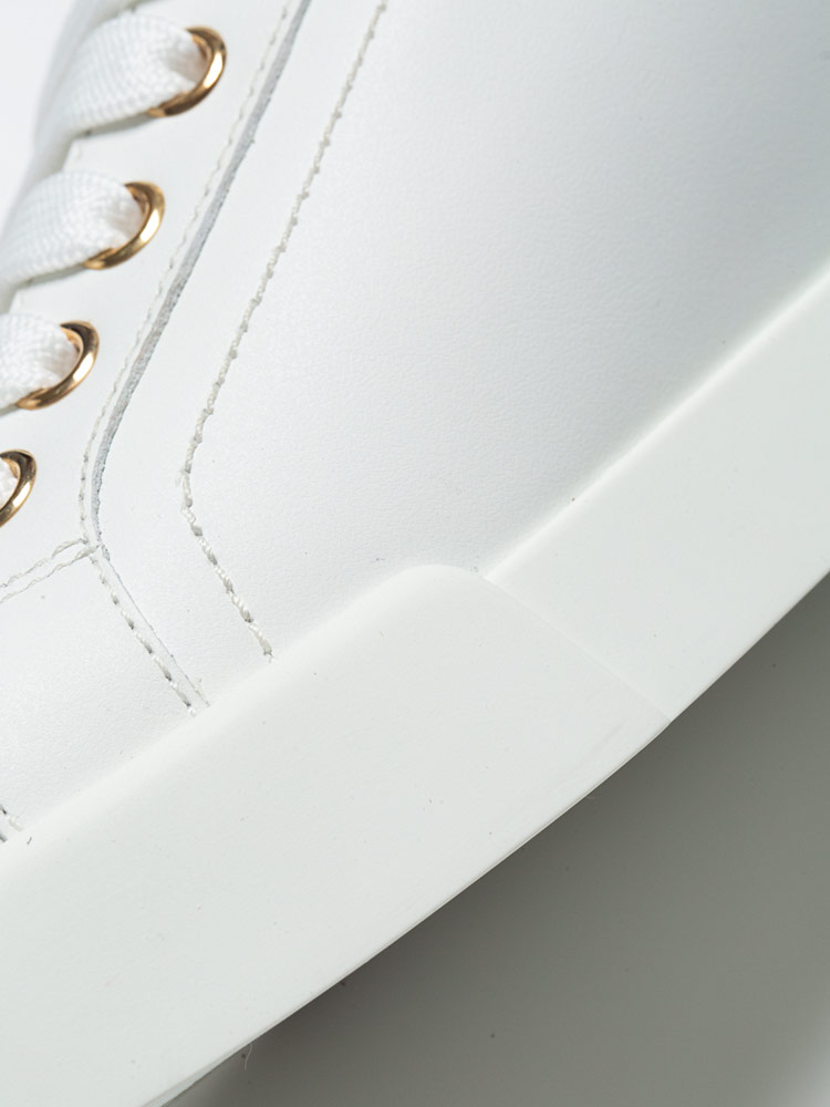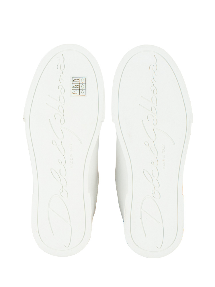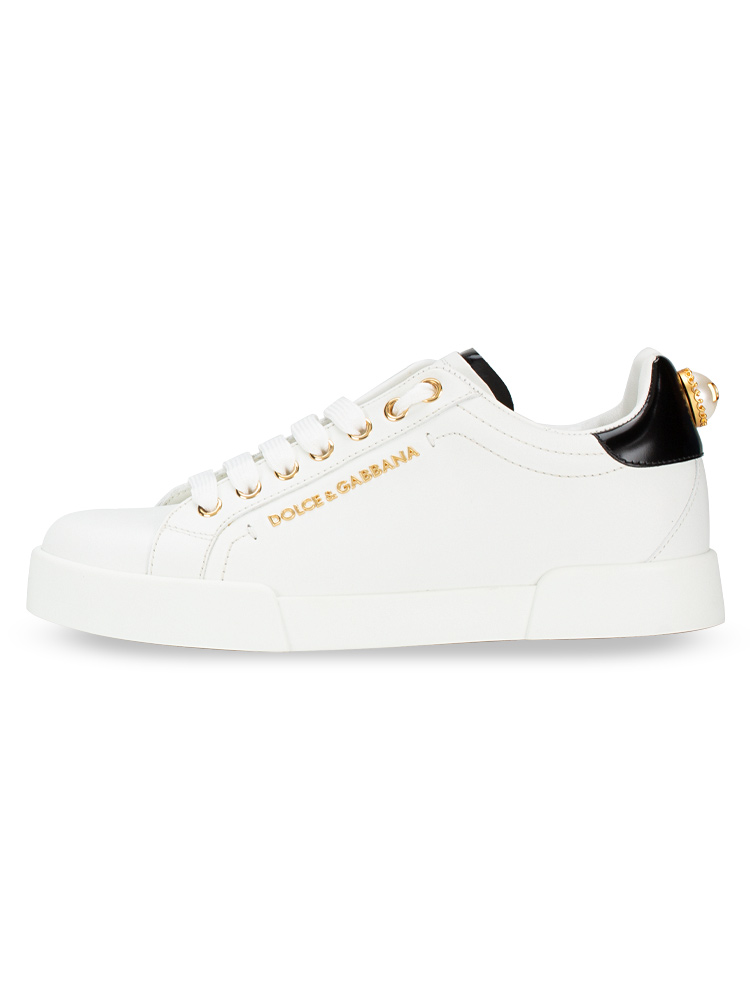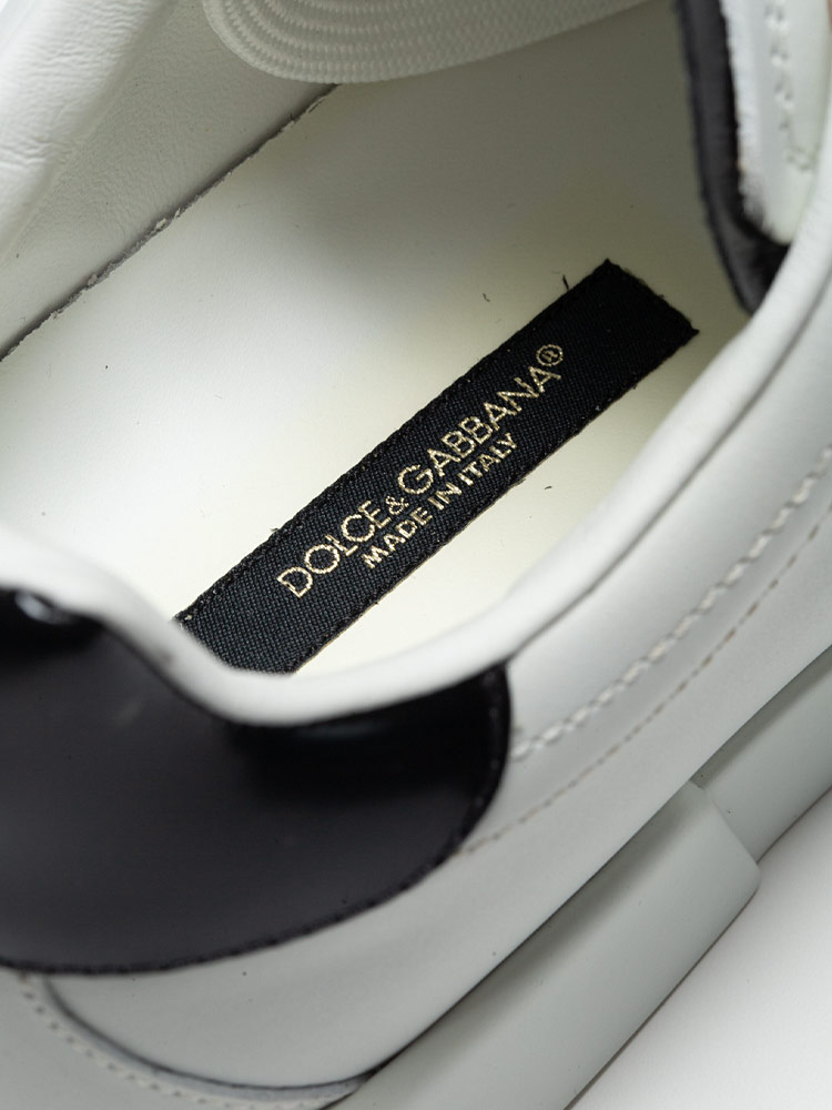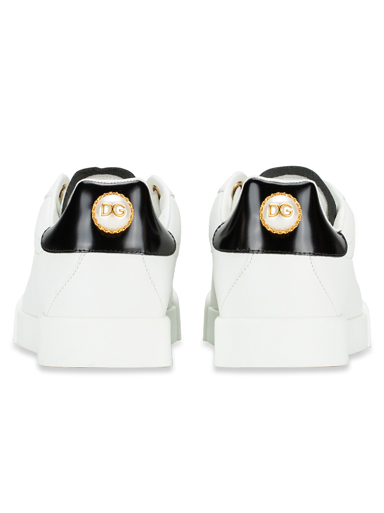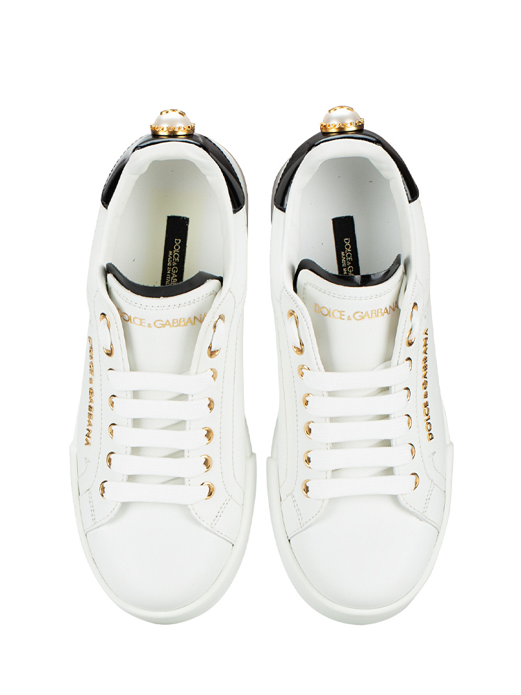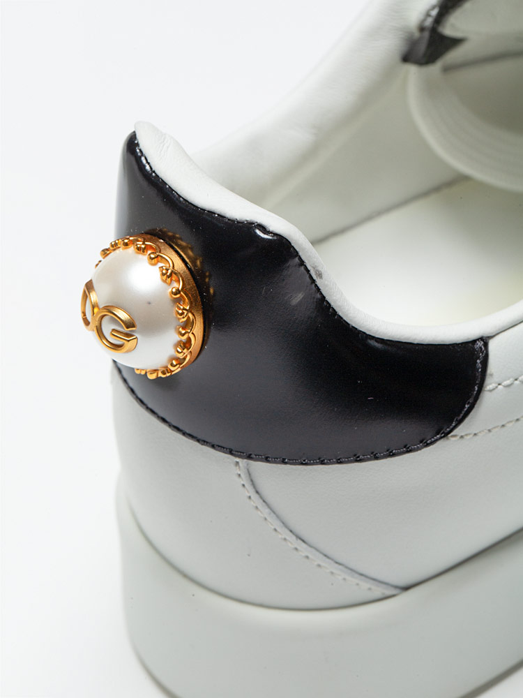 These sneakers are crafted of calfskin leather. Features black patent leather trim and pearl with DG logo, and rubber outsole.