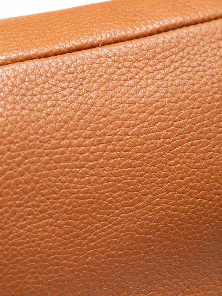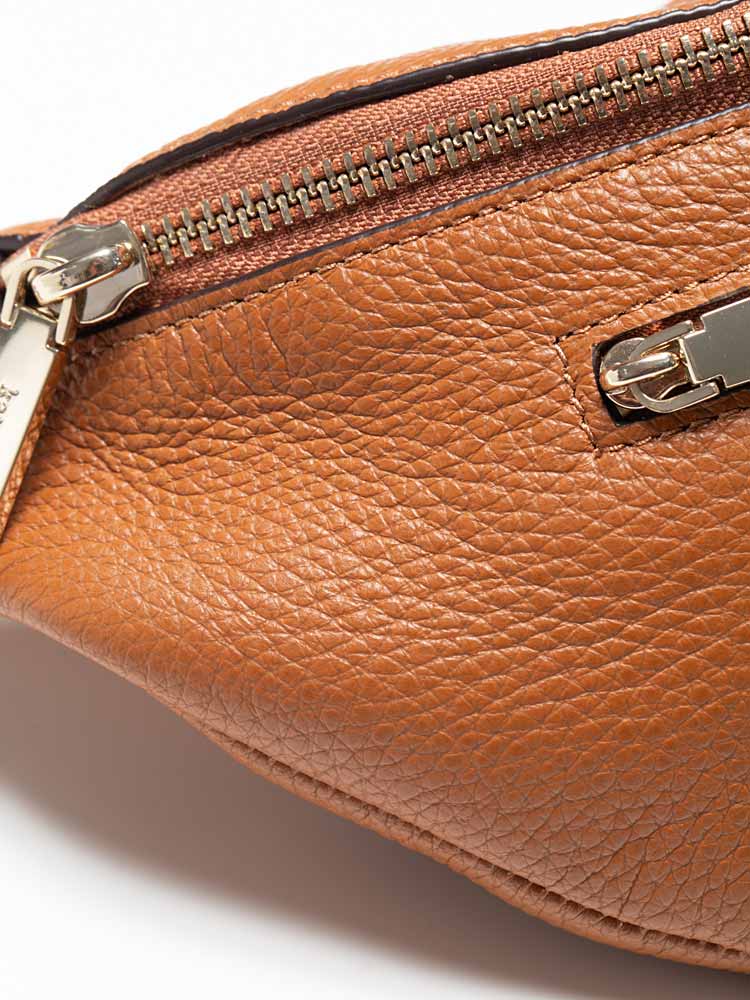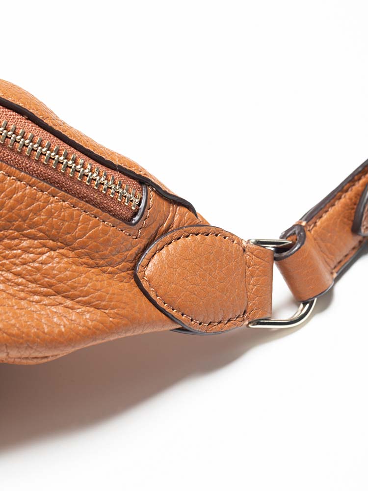 Made of pebbled leather. The bag features a zip closure that opens to polyester lining with three card slots, exterior one zip pocket at front, adjustable strap.