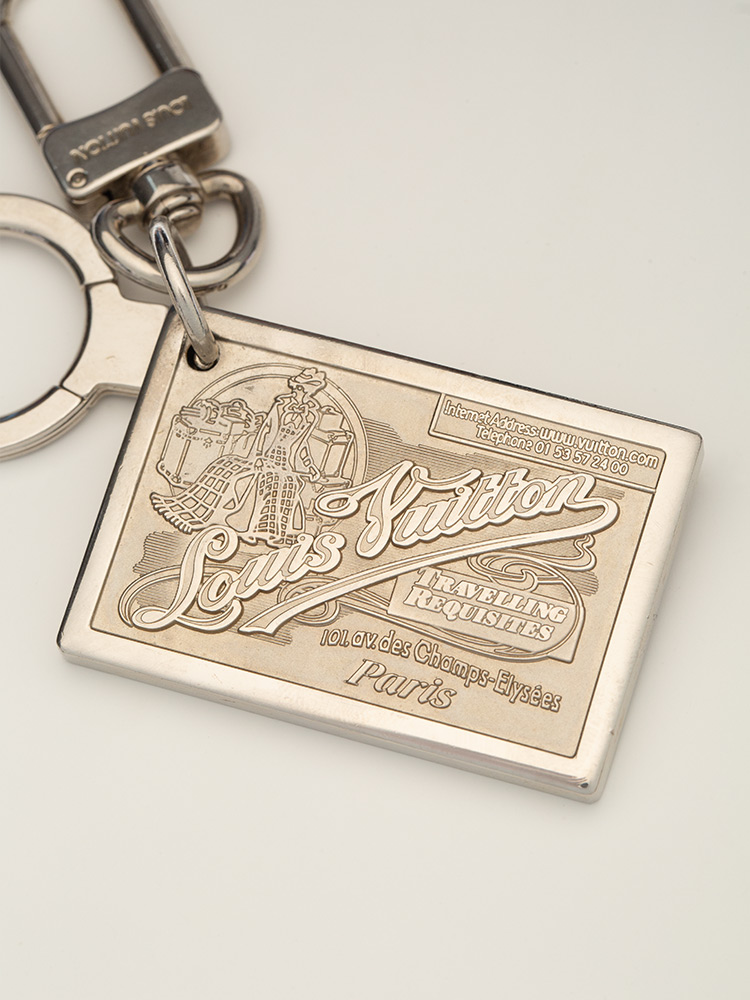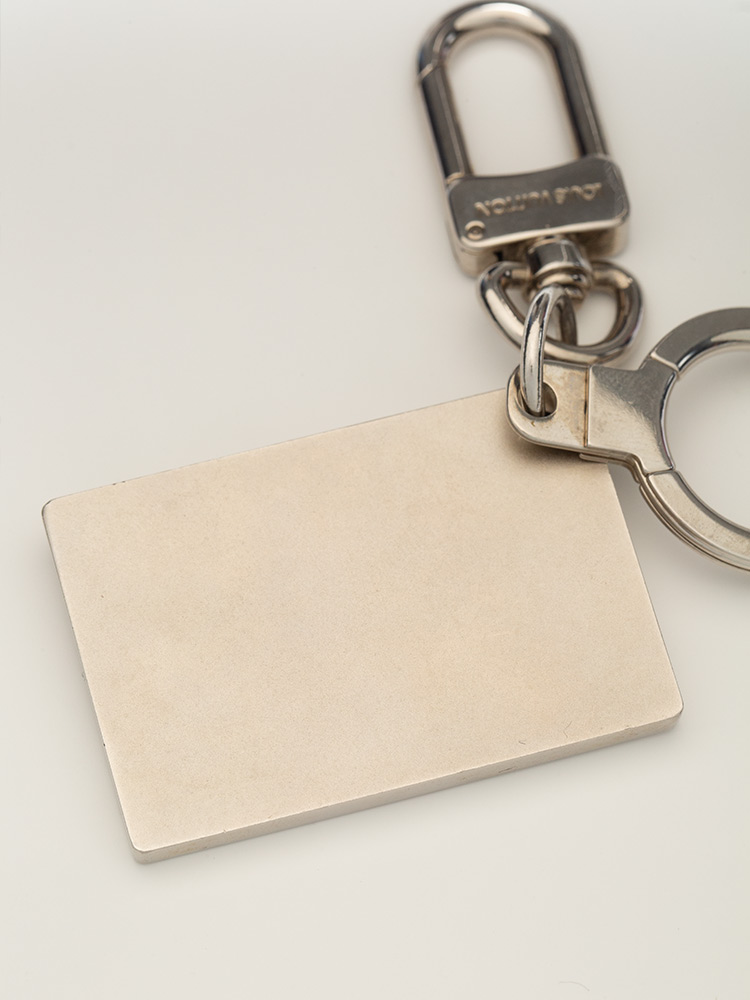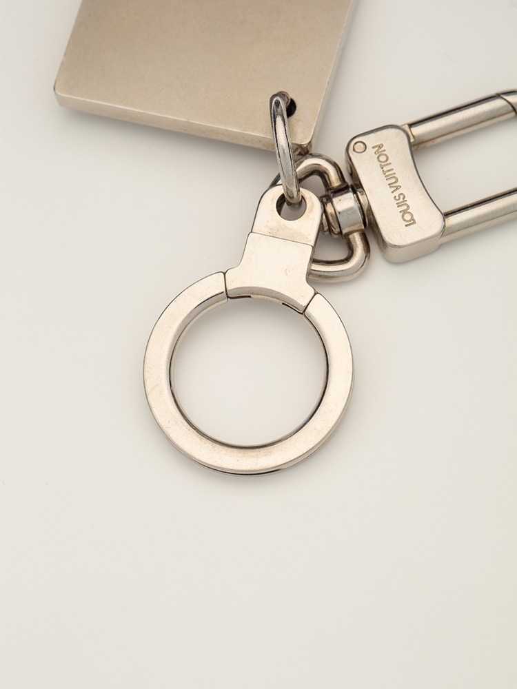 This key holder and bag charm is a polished silver luggage tag and attached by a key ring and D clasp ring.