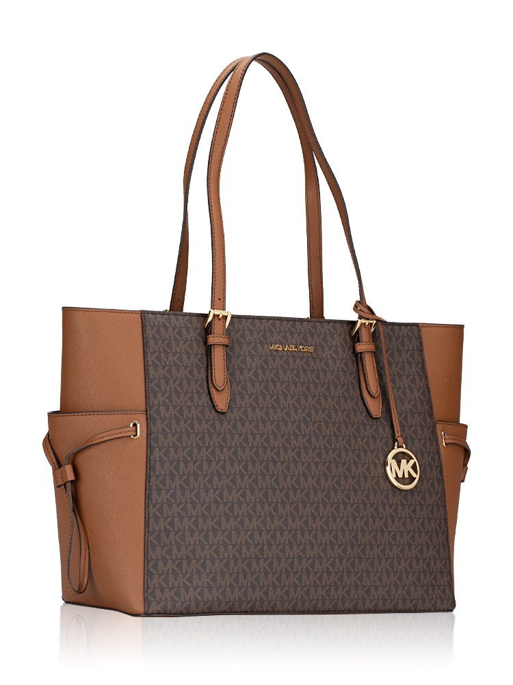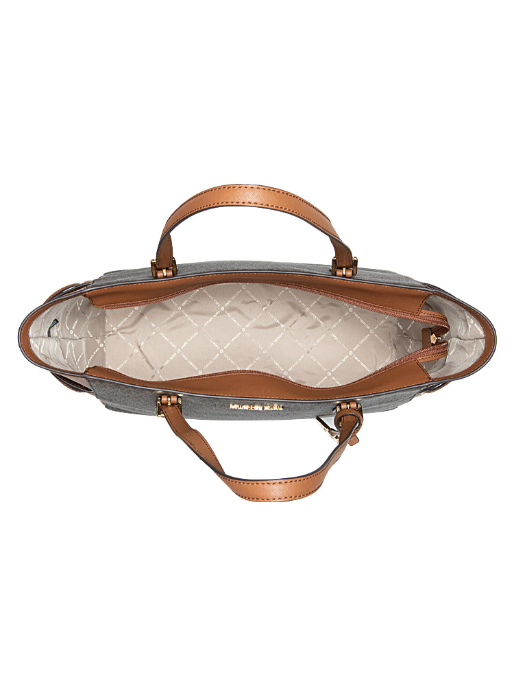 Made of signature coated canvas mix saffiano leather material. The bag features a zip closure that opens to polyester lining with one zip pocket, Exterior Two Side Pockets.