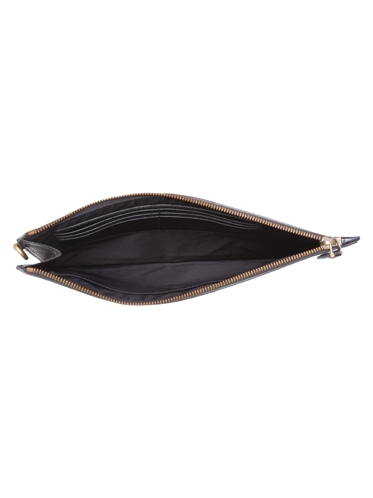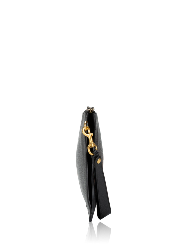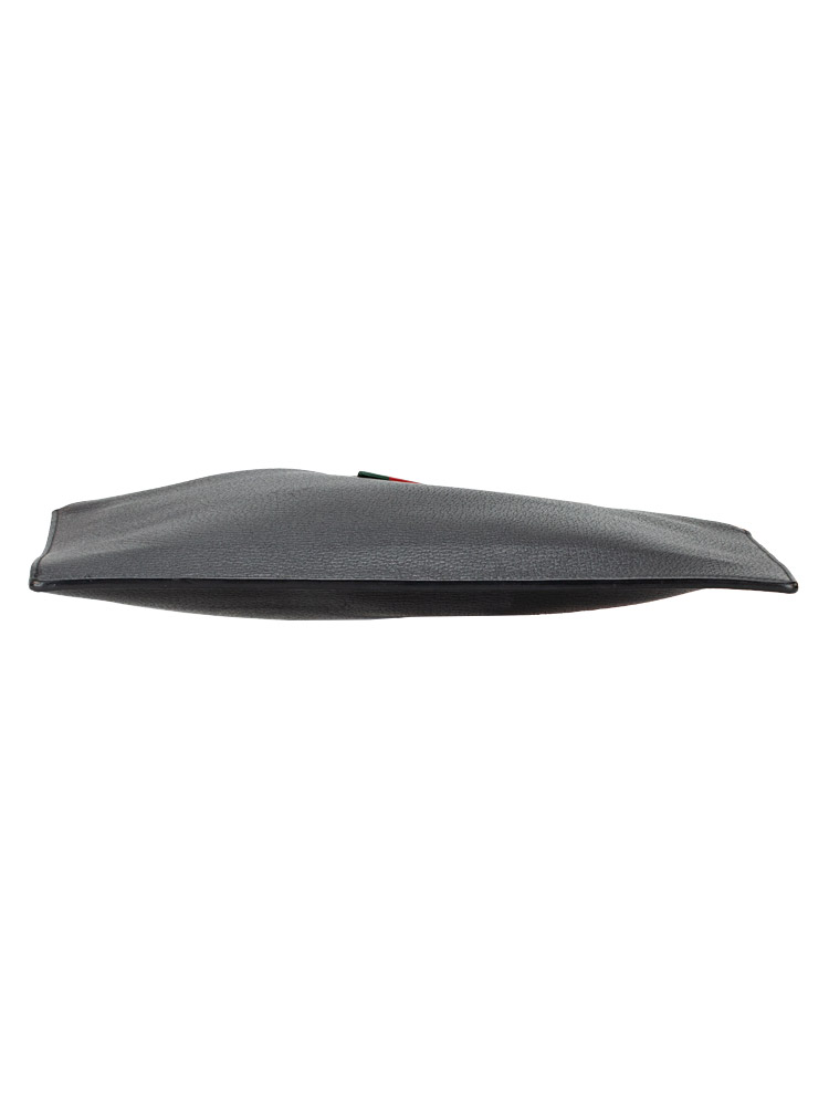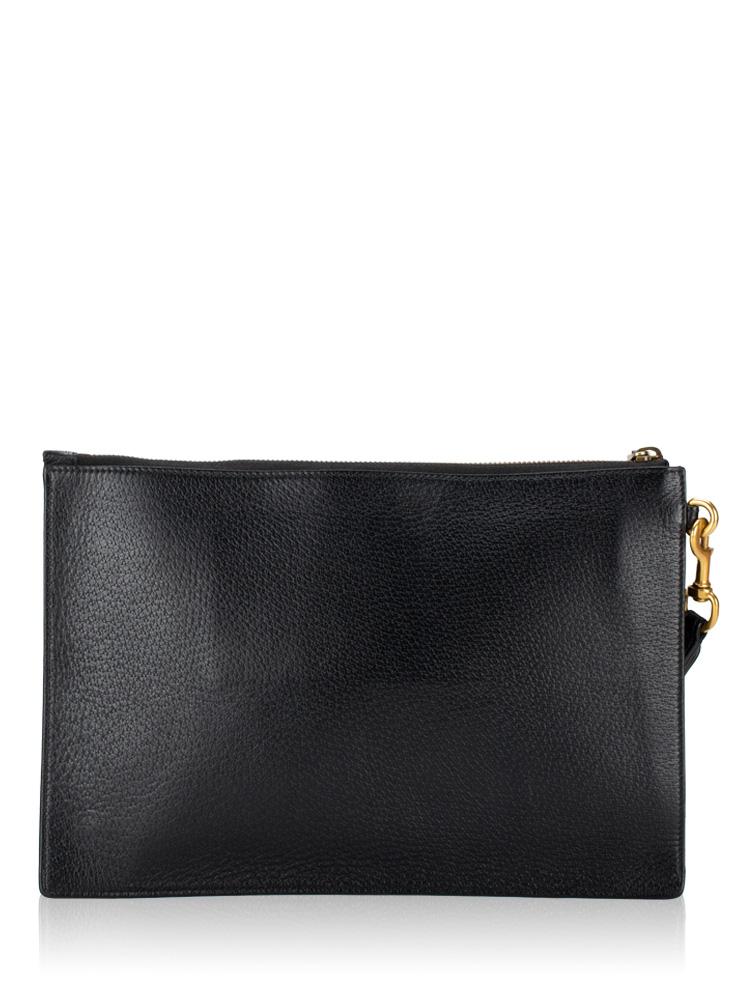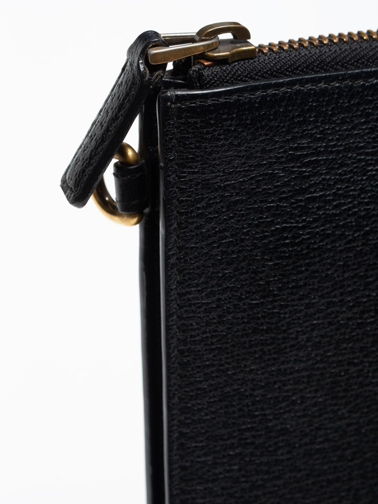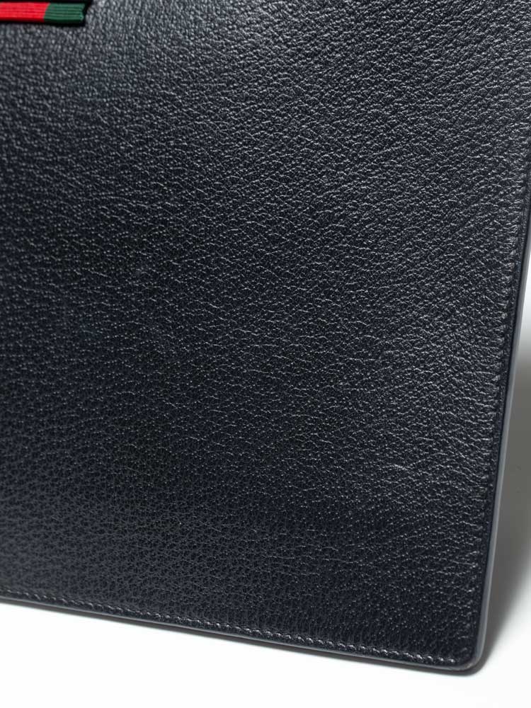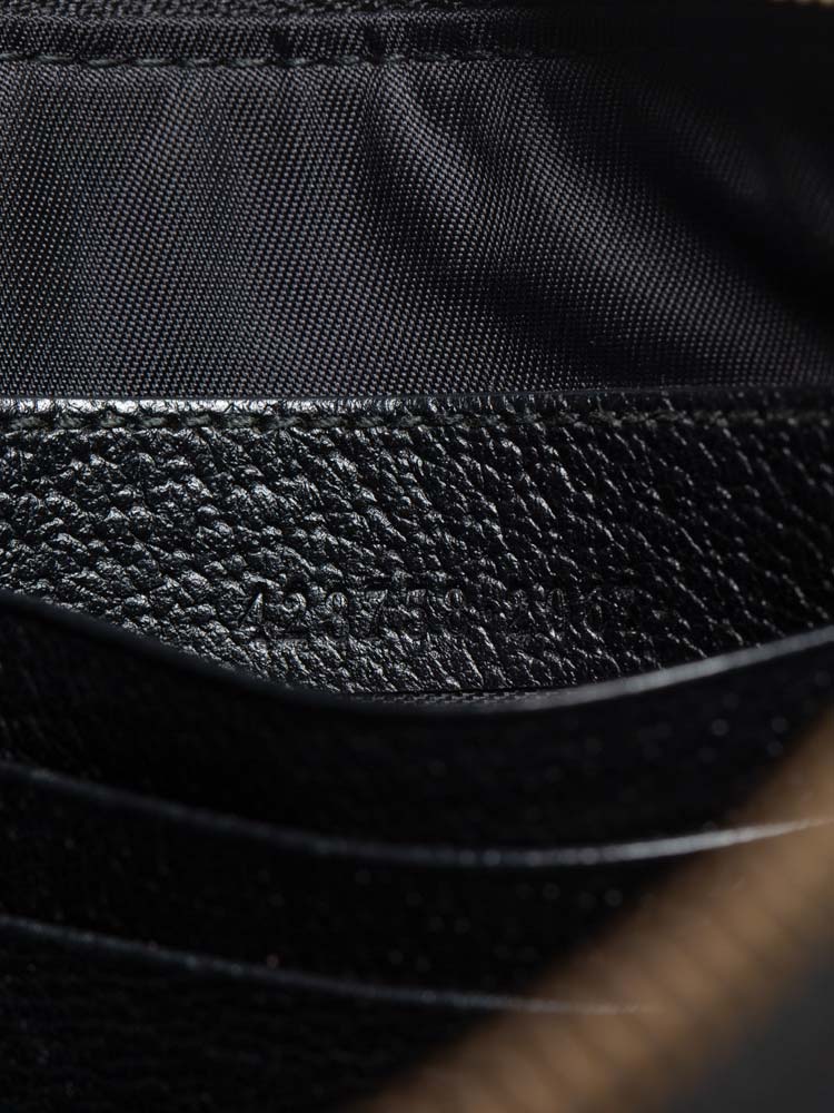 This pouch is crafted of calfskin leather in black. Features with green and red web gucci logo on the front. The top zipper opens to fabric lining with slip pocket and card slots