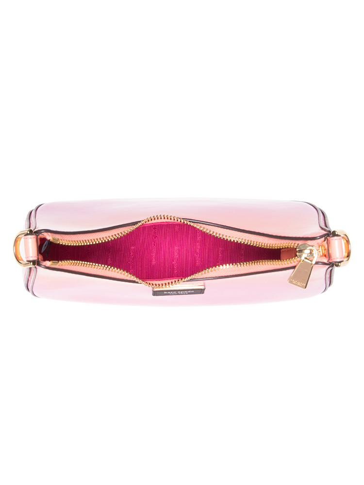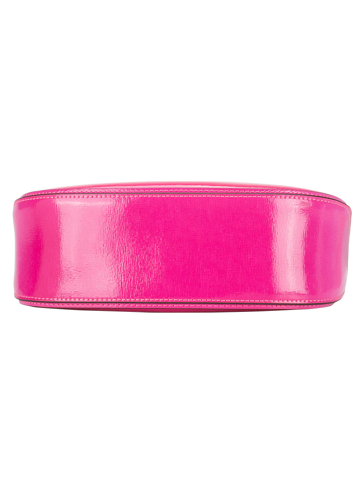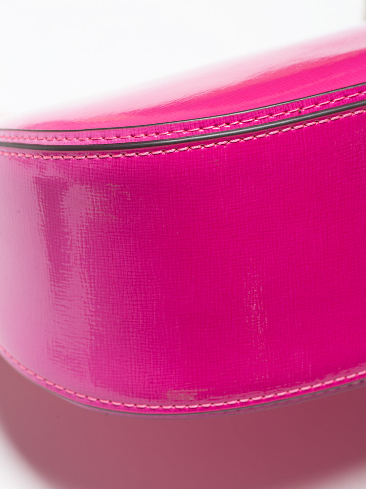 Made of saffiano patten leather. The bag features a zip closure that opens to fabric lining with one slip pocket, one zip pocket, removable shoulder strap, adjustable and removable long strap.