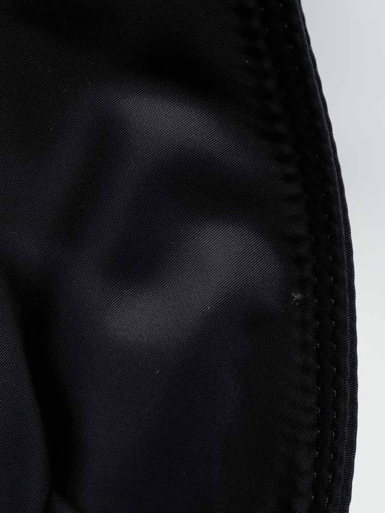 Made of nylon and leather trim. The bag features a magnetic closure that opens to fabric lining with one zip pocket, one slip pocket, double handles drop 24 cm.