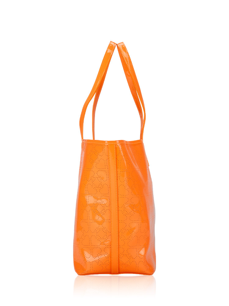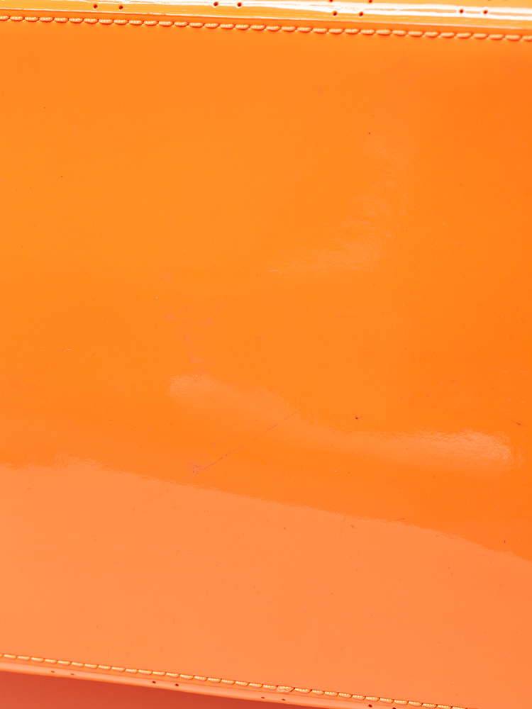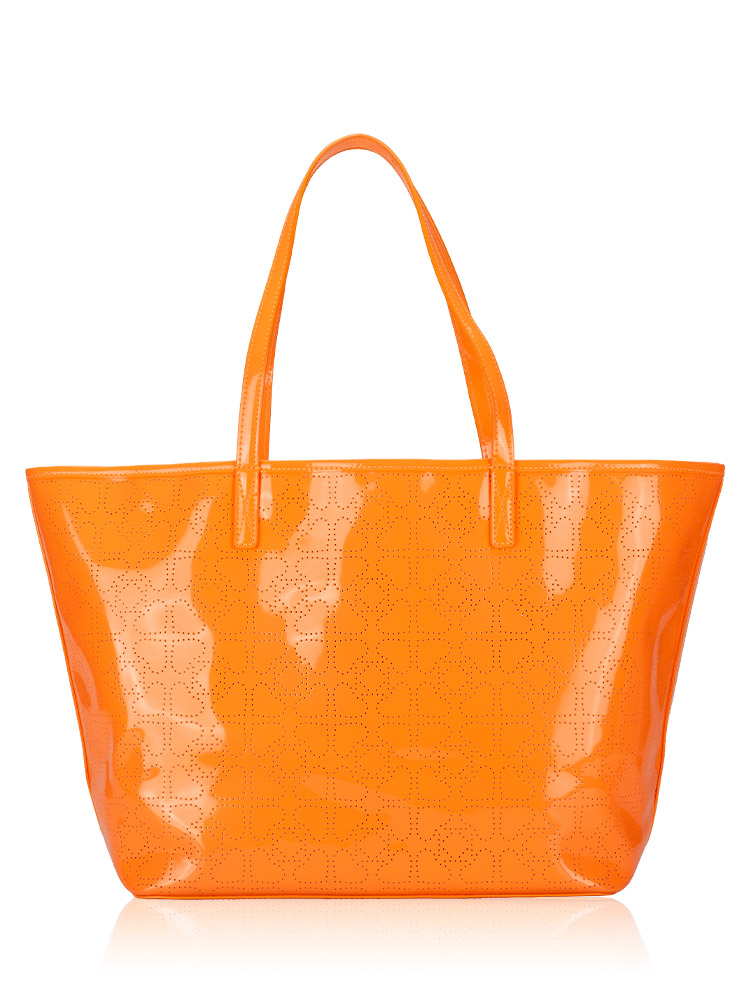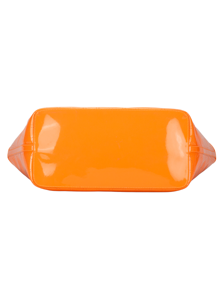 Made of patent leather. The bag features a open closure that opens to fabric lining with two slip pockets, one zip pocket, double handles strap drop 22 cm.
