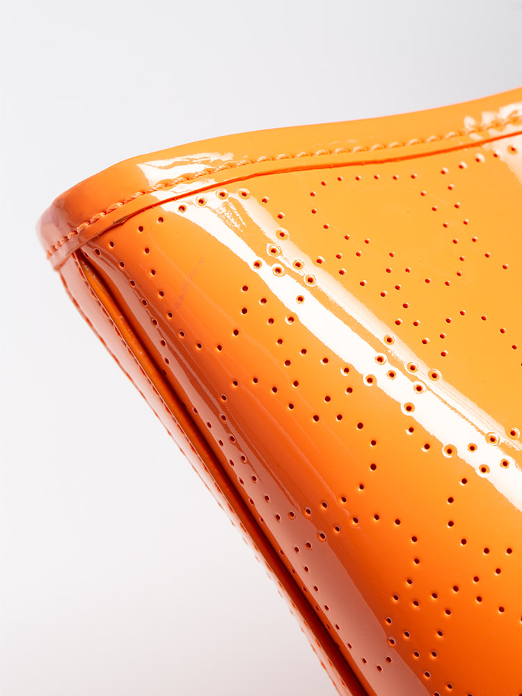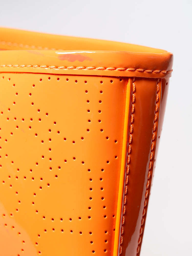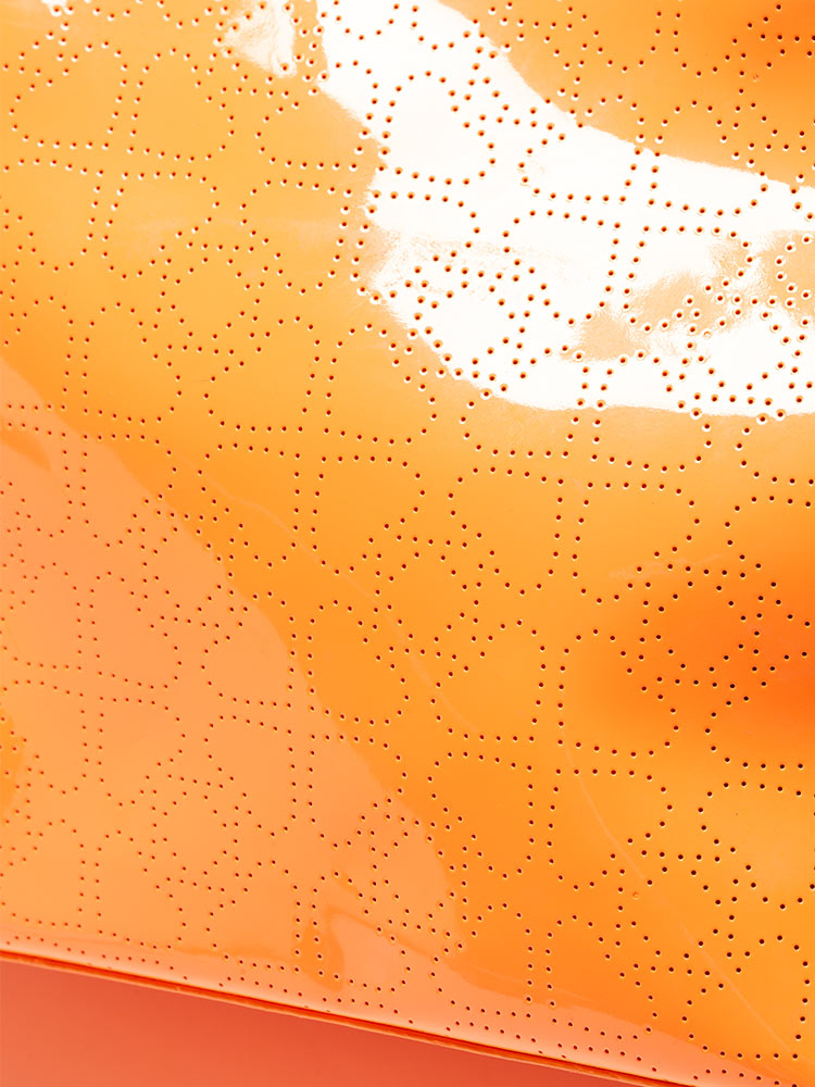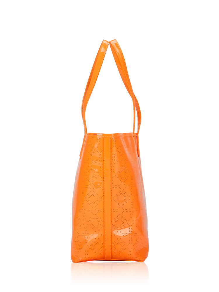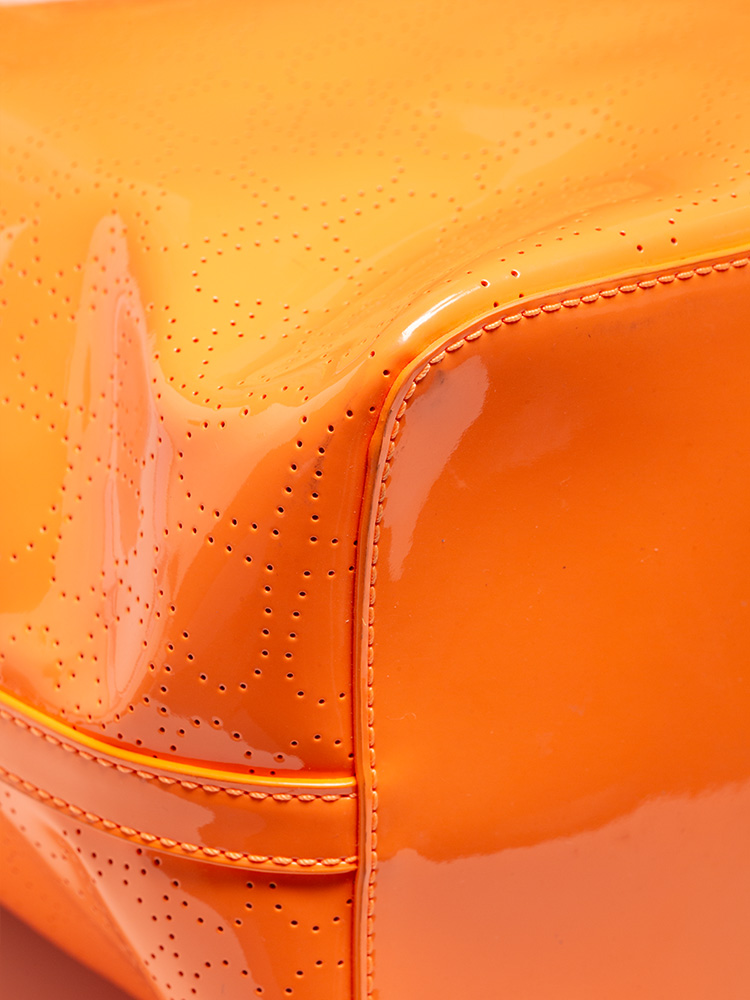 Made of patent leather. The bag features a open closure that opens to fabric lining with two slip pockets, one zip pocket, double handles strap drop 22 cm.