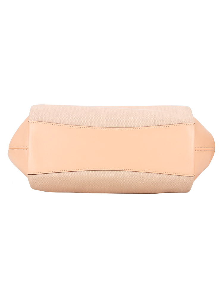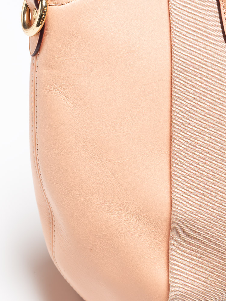 Made of canvas and smooth leather. The bag features a zip closure that opens to fabric lining with interior one zip pocket, one slip pocket with button closure.