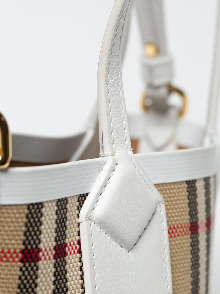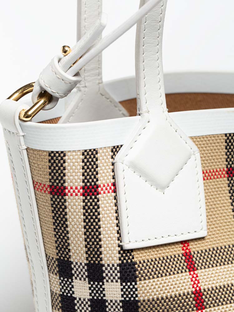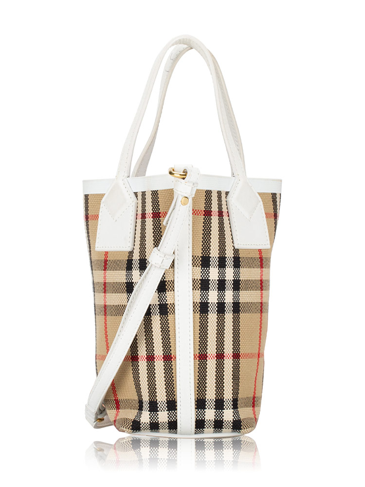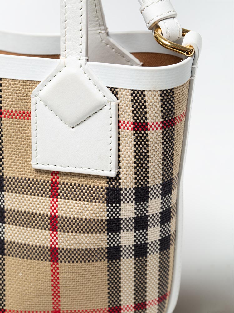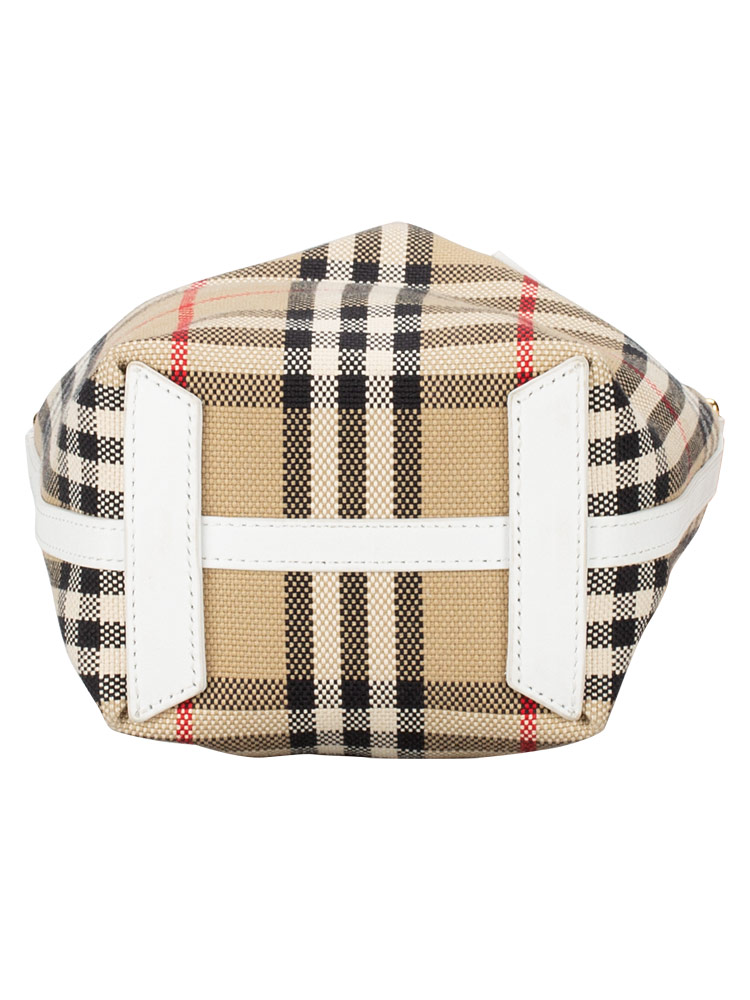 This bag is crafted of cotton canvas Burberry London mini Archive bag with gold-tone hardware, leather trim, dual top handles, with an adjustable strap to style as a crossbody. This bag is open to fabric lining.