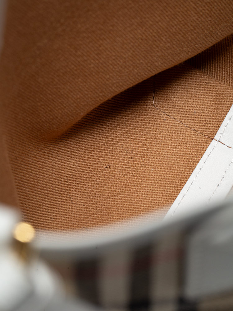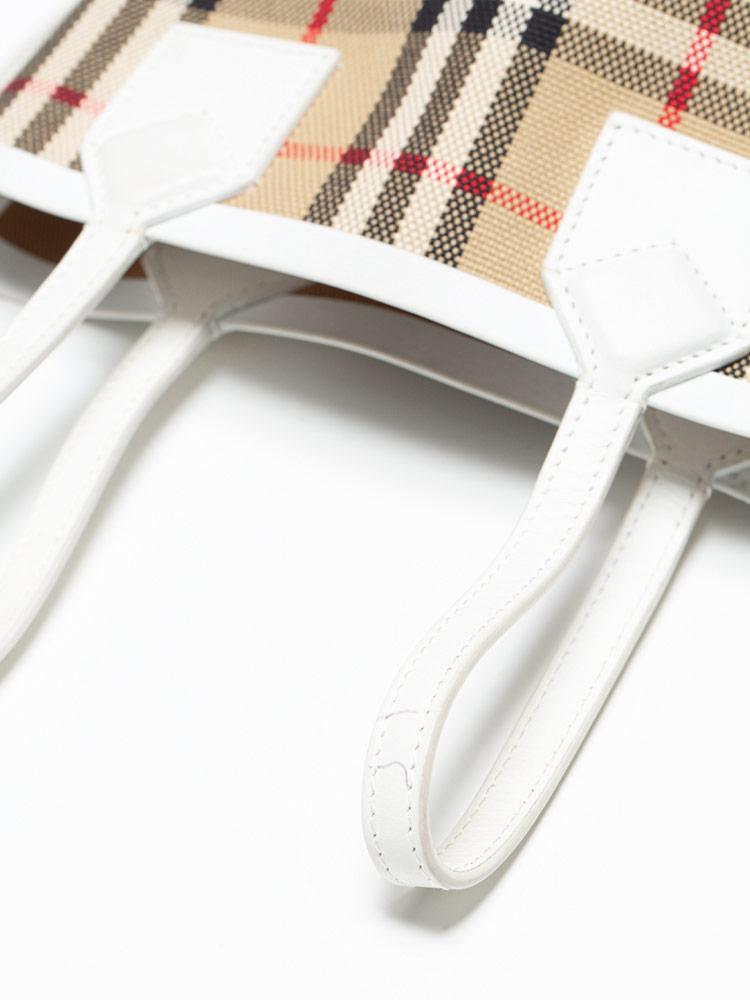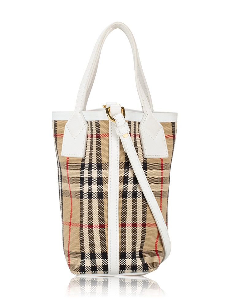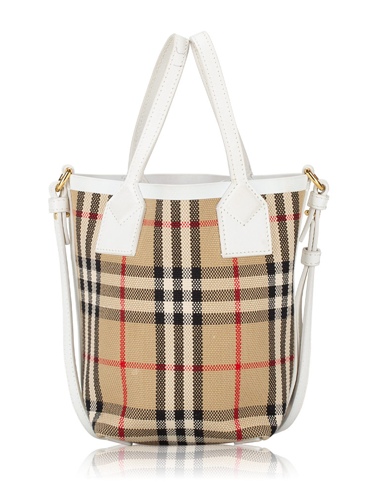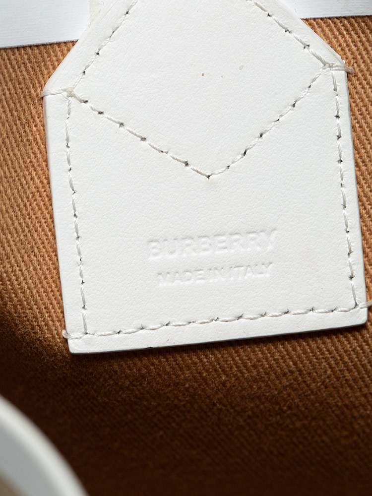 This bag is crafted of cotton canvas Burberry London mini Archive bag with gold-tone hardware, leather trim, dual top handles, with an adjustable strap to style as a crossbody. This bag is open to fabric lining.