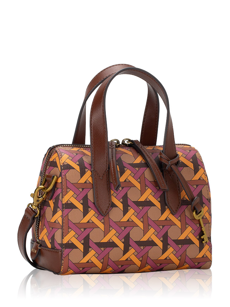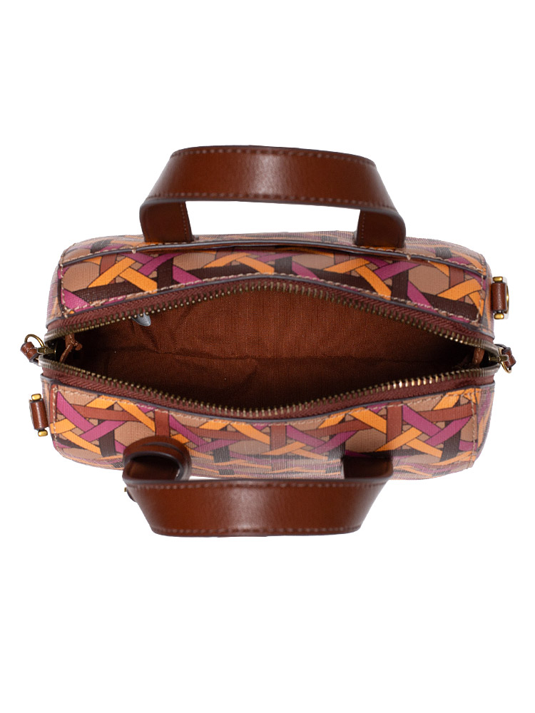 Made of printed polyurethane or polyurethane trim. The bag features a zip) closure that opens to polyester lining with one zip pocket, one slip pocket, double handles drop 11 cm, adjustable and removable long strap.