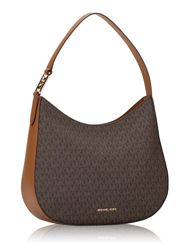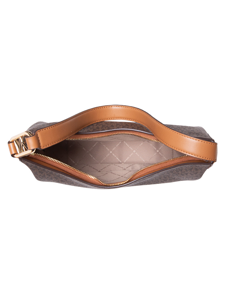Signature coated canvas with polyester lining. The bag features an open zip closure, gold tone hardware, one zip pocket, one slip pocket and one rear eksterior zip pocket.